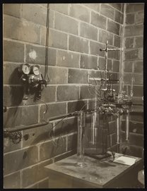 General view of an oxygen analyzer used to measure the contents of purified nitrogen during the early stages of nylon production and research at the DuPont Experimental Station in Wilmington, Delaware. To protect hot…