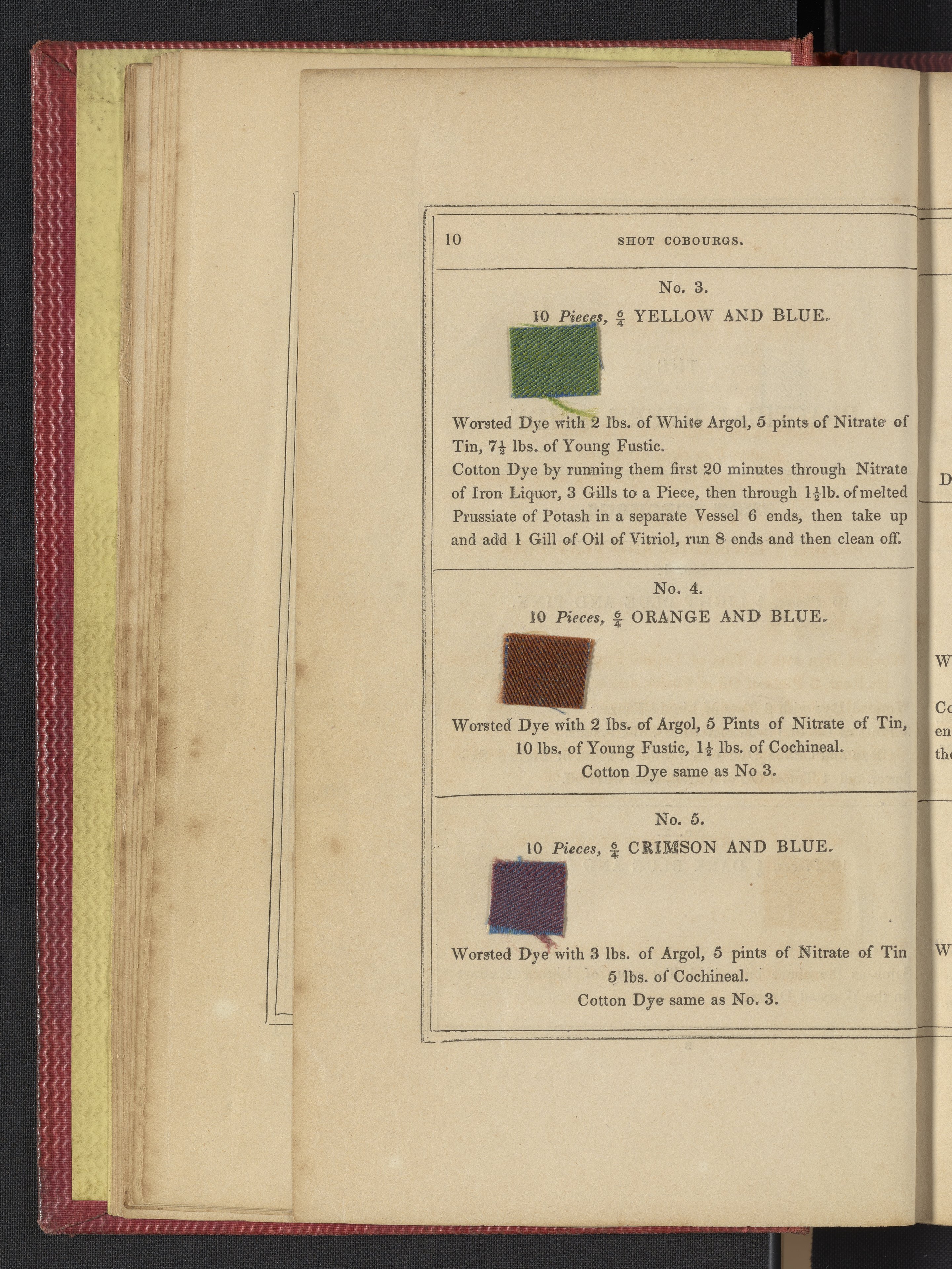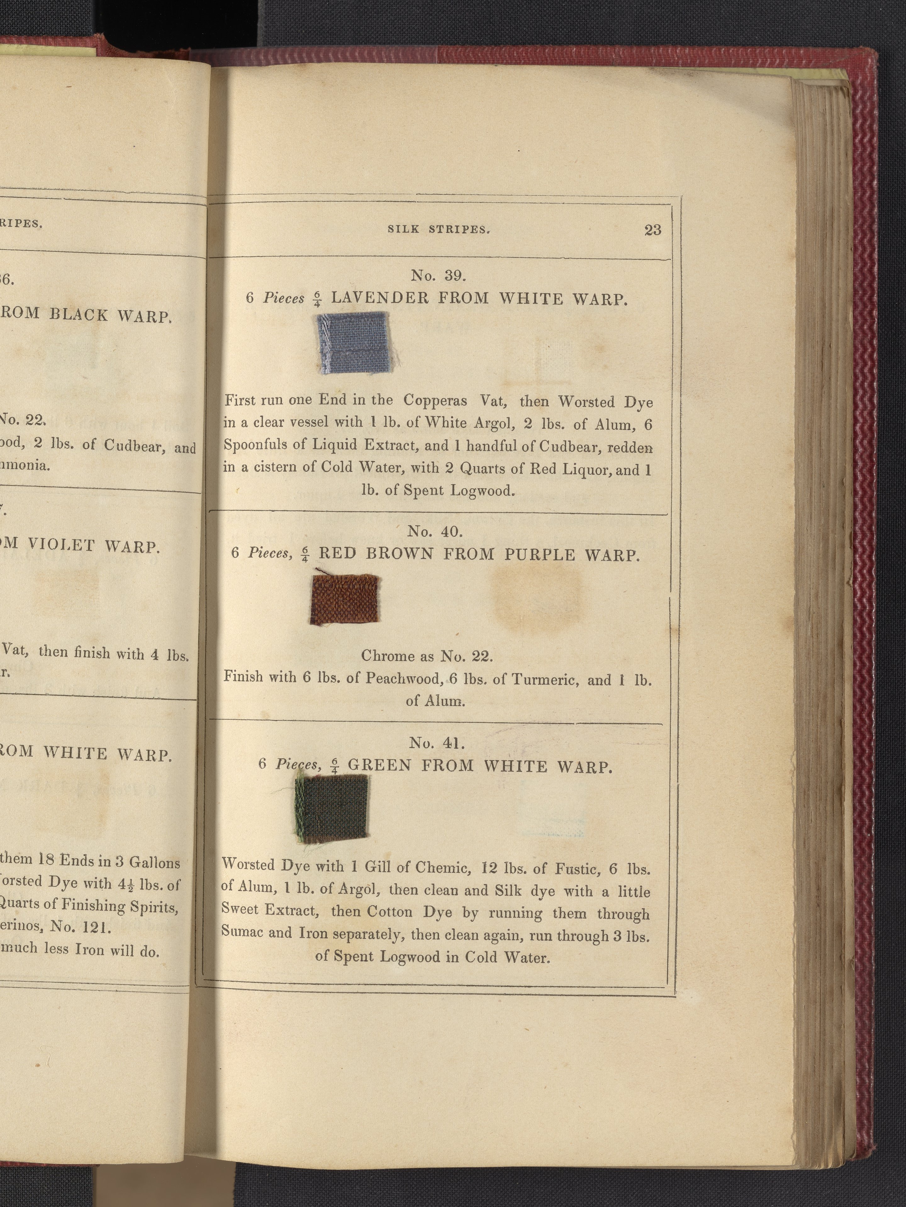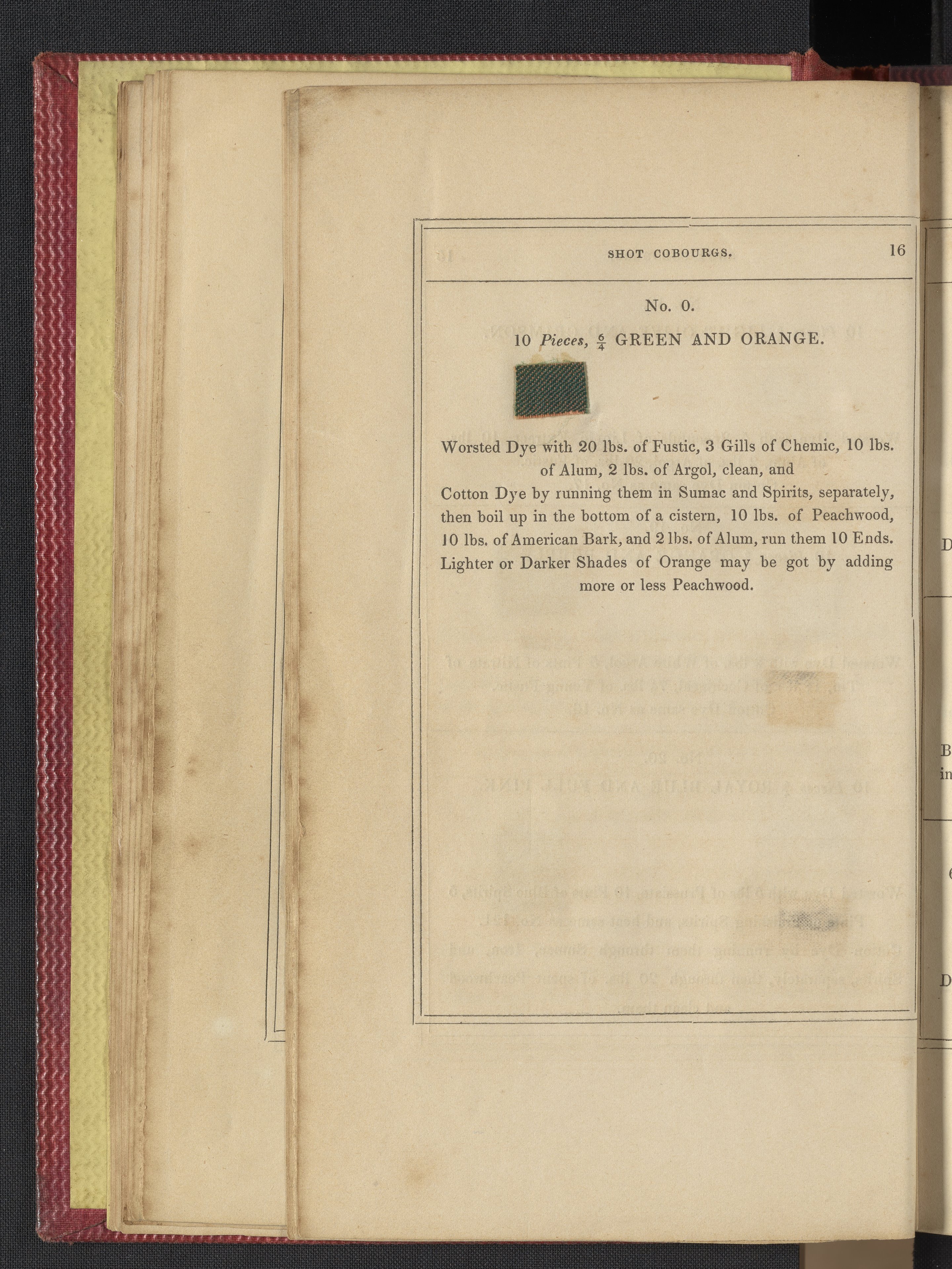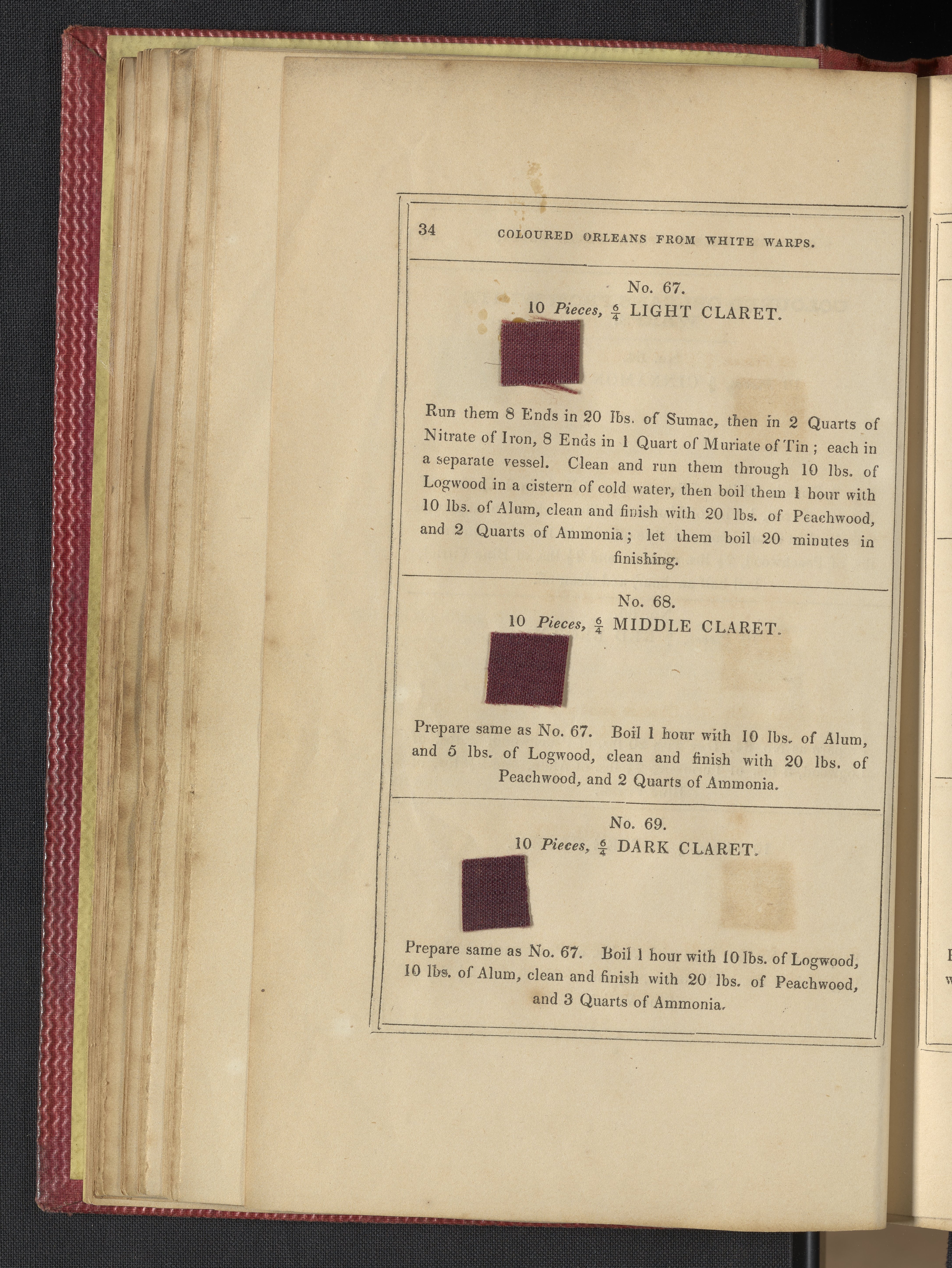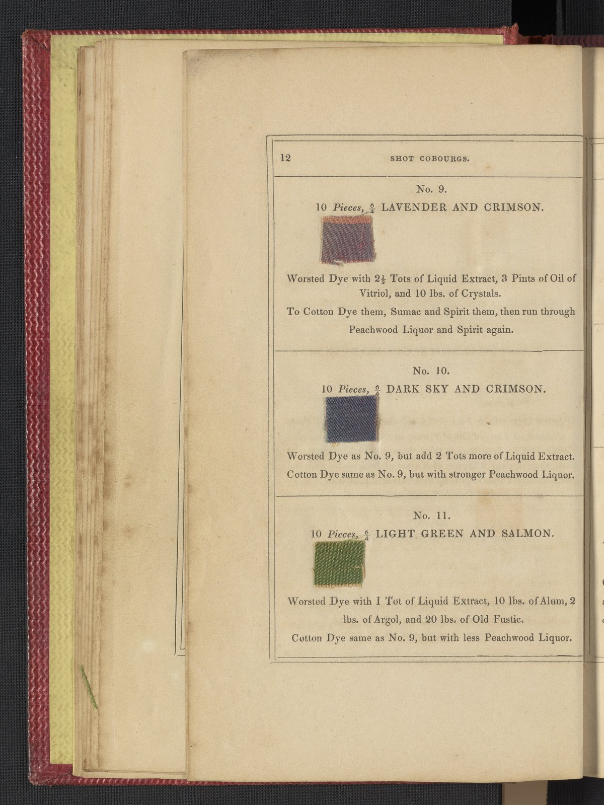 Small JPG1200 x 1735px — 633 KBLarge JPG2880 x 4164px — 3.1 MBFull-sized JPG3850 x 5566px — 5.1 MBOriginal fileTIFF — 3850 x 5566px — 61.4 MB"Comprising practical instructions in the dyeing of shot cobourgs, silk striped orleans, colored orleans from black warps, ditto from white warps, colored cobourgs from white warps, merinos, yarns, woollen cloths, &c.; containing nearly 300 receipts, to most of which a dyed pattern is annexed."