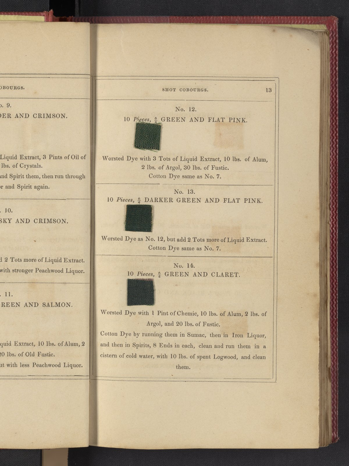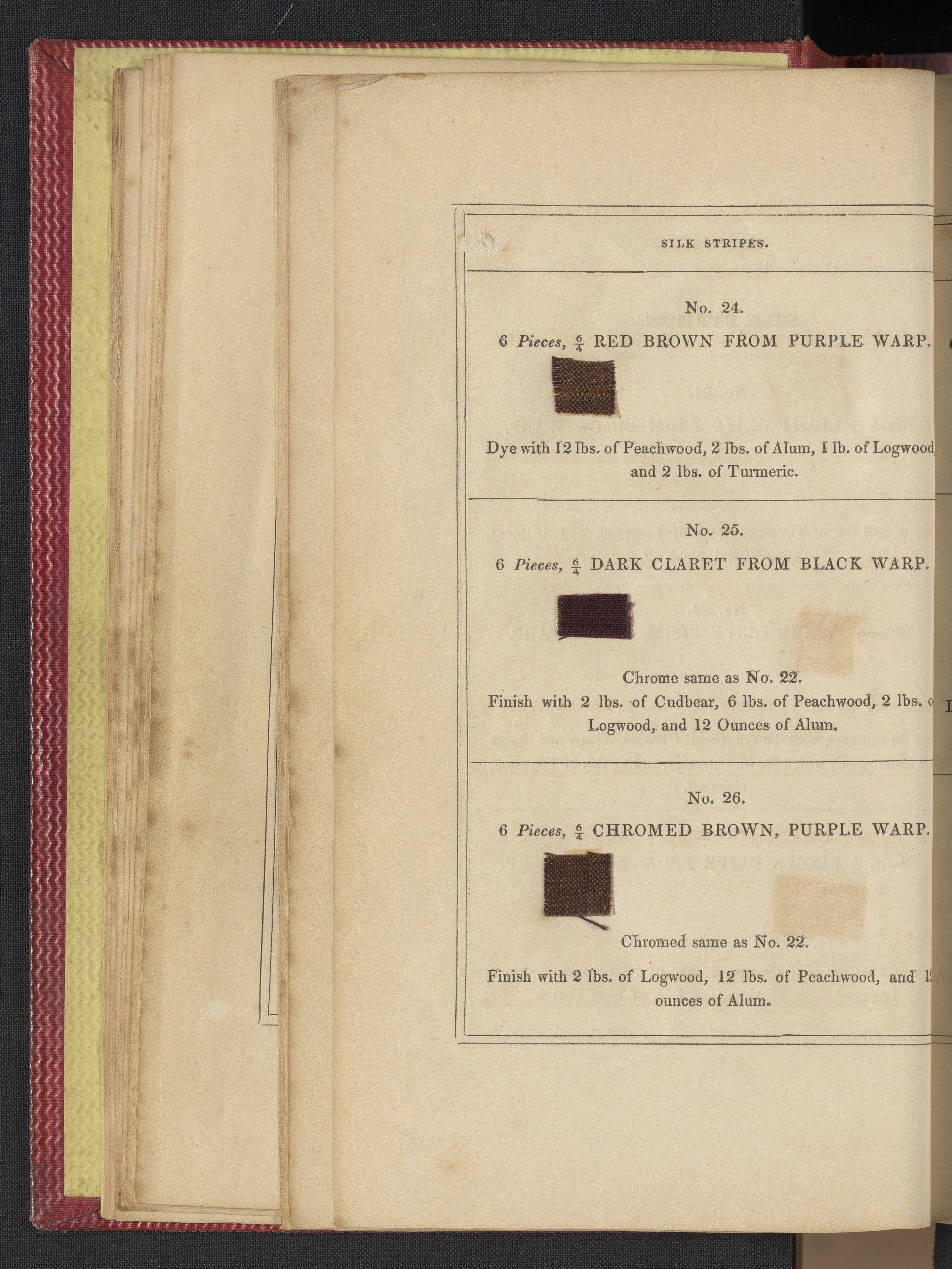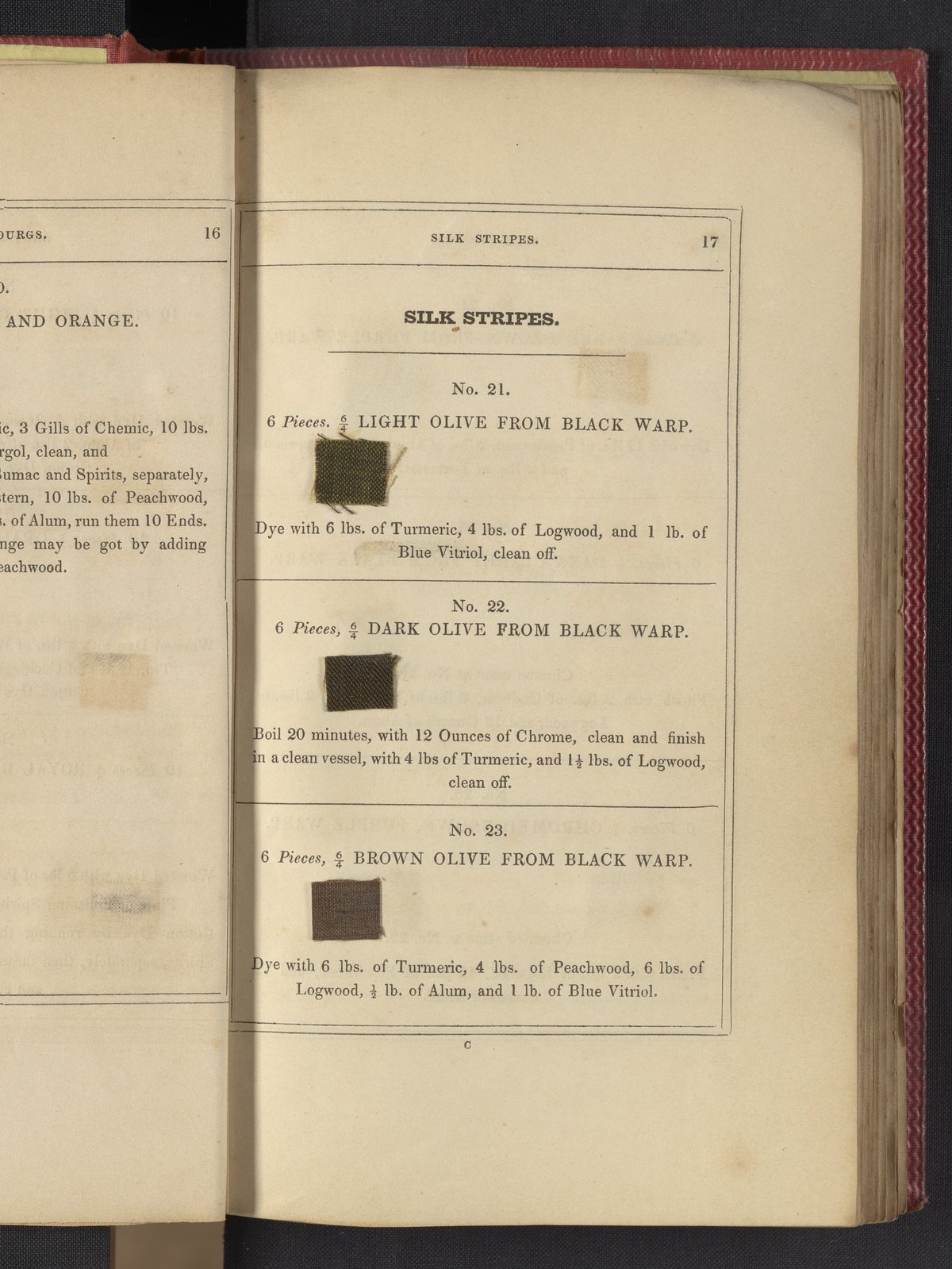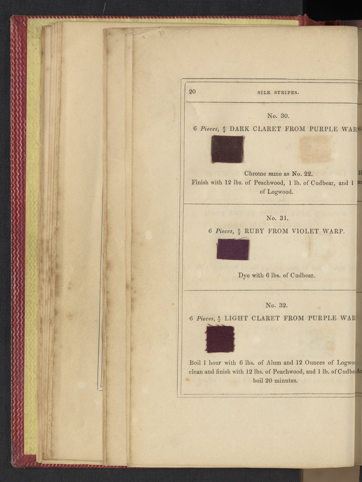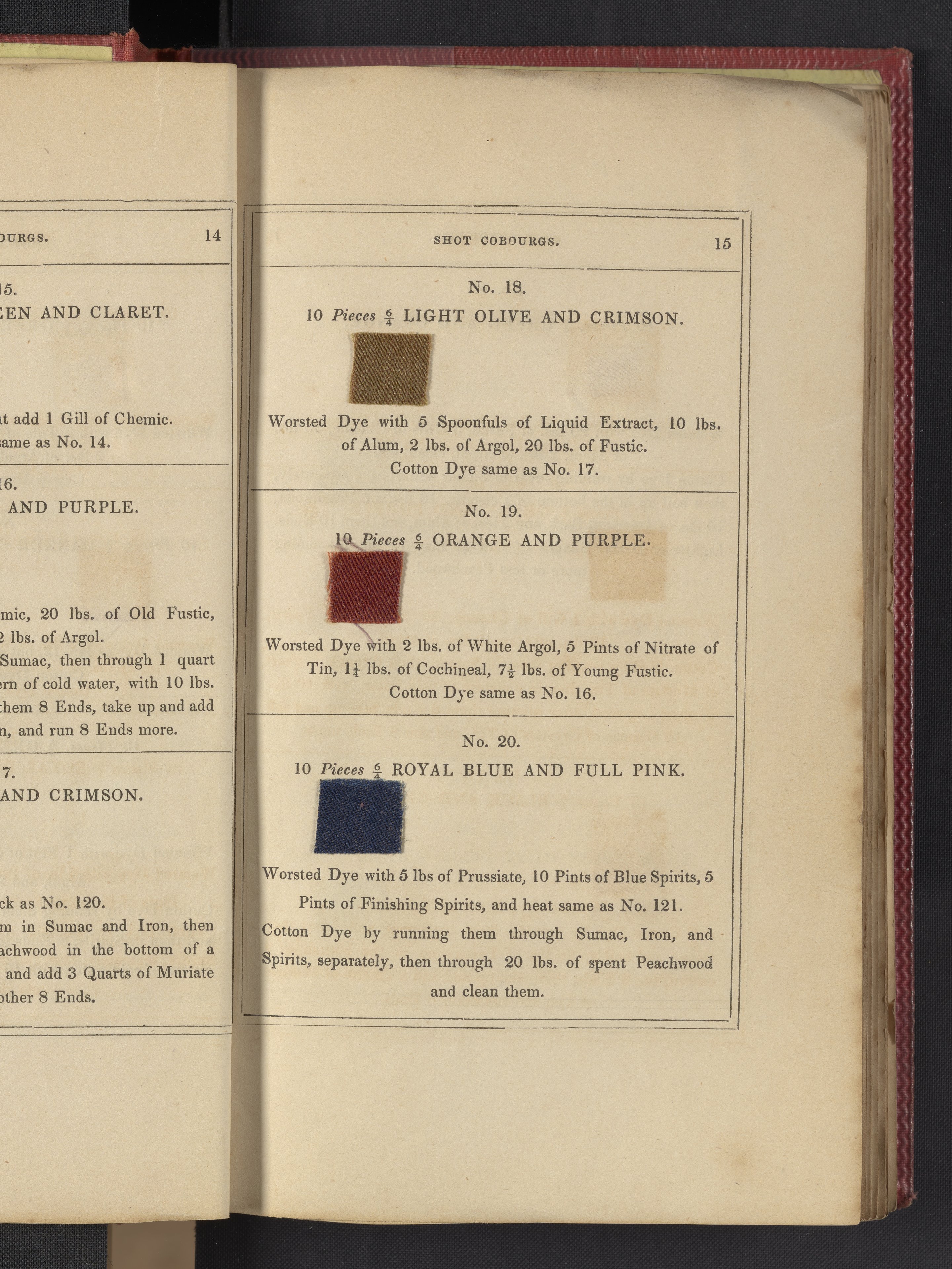 Small JPG1200 x 1735px — 633 KBLarge JPG2880 x 4164px — 3.1 MBFull-sized JPG3850 x 5566px — 5.1 MBOriginal fileTIFF — 3850 x 5566px — 61.4 MB"Comprising practical instructions in the dyeing of shot cobourgs, silk striped orleans, colored orleans from black warps, ditto from white warps, colored cobourgs from white warps, merinos, yarns, woollen cloths, &c.; containing nearly 300 receipts, to most of which a dyed pattern is annexed."