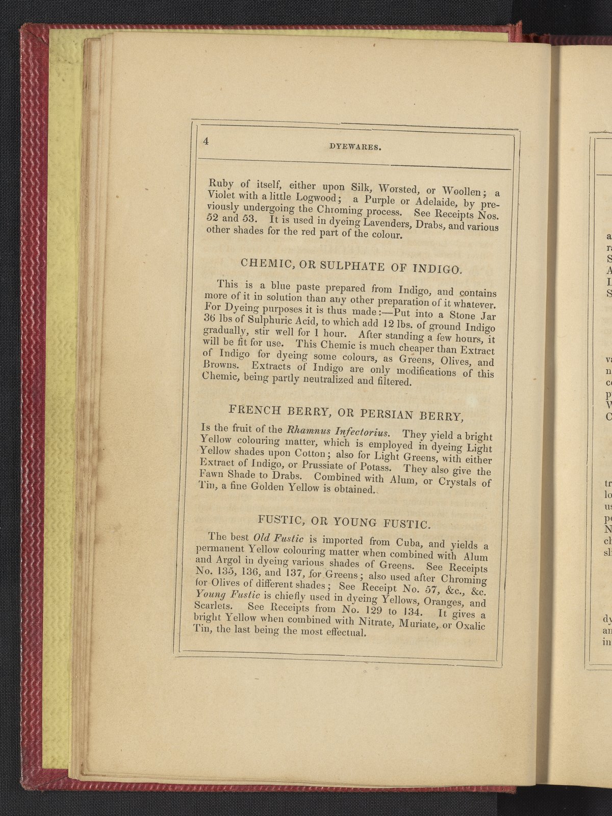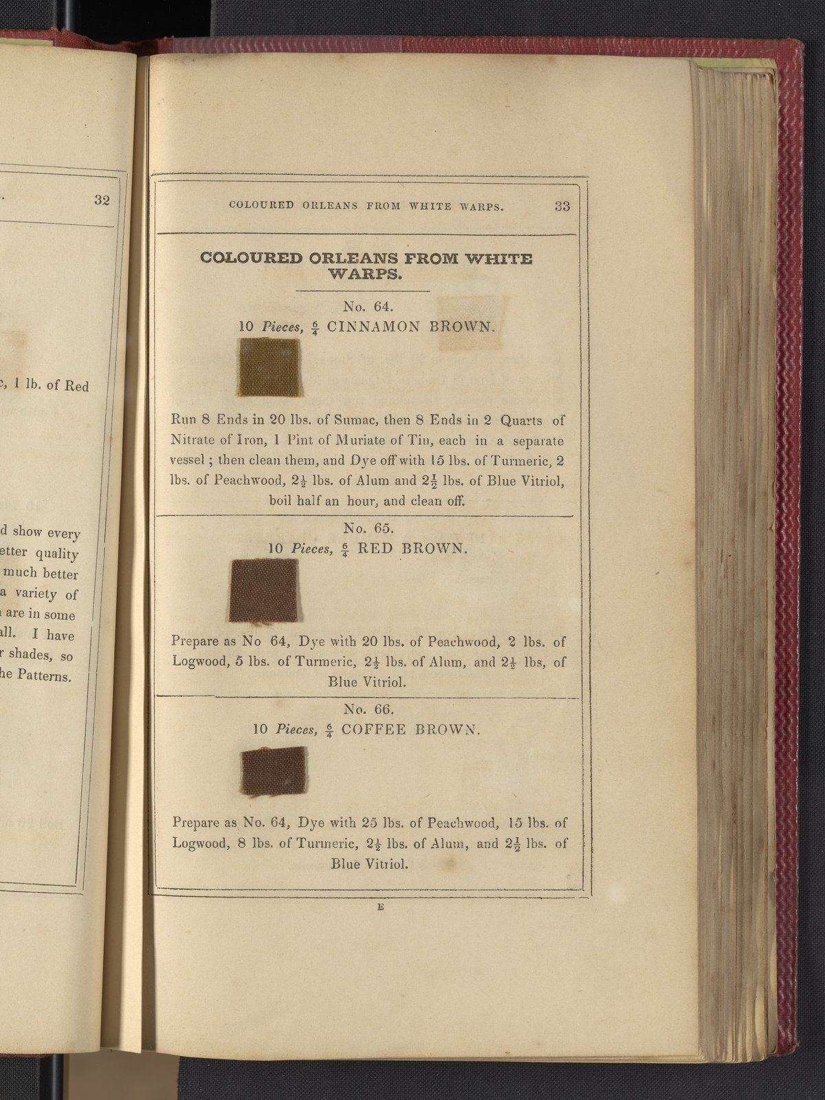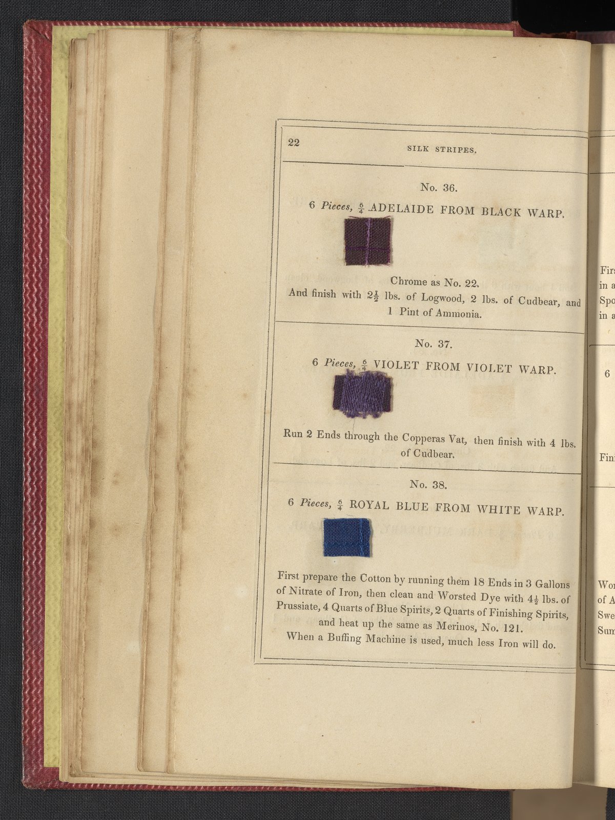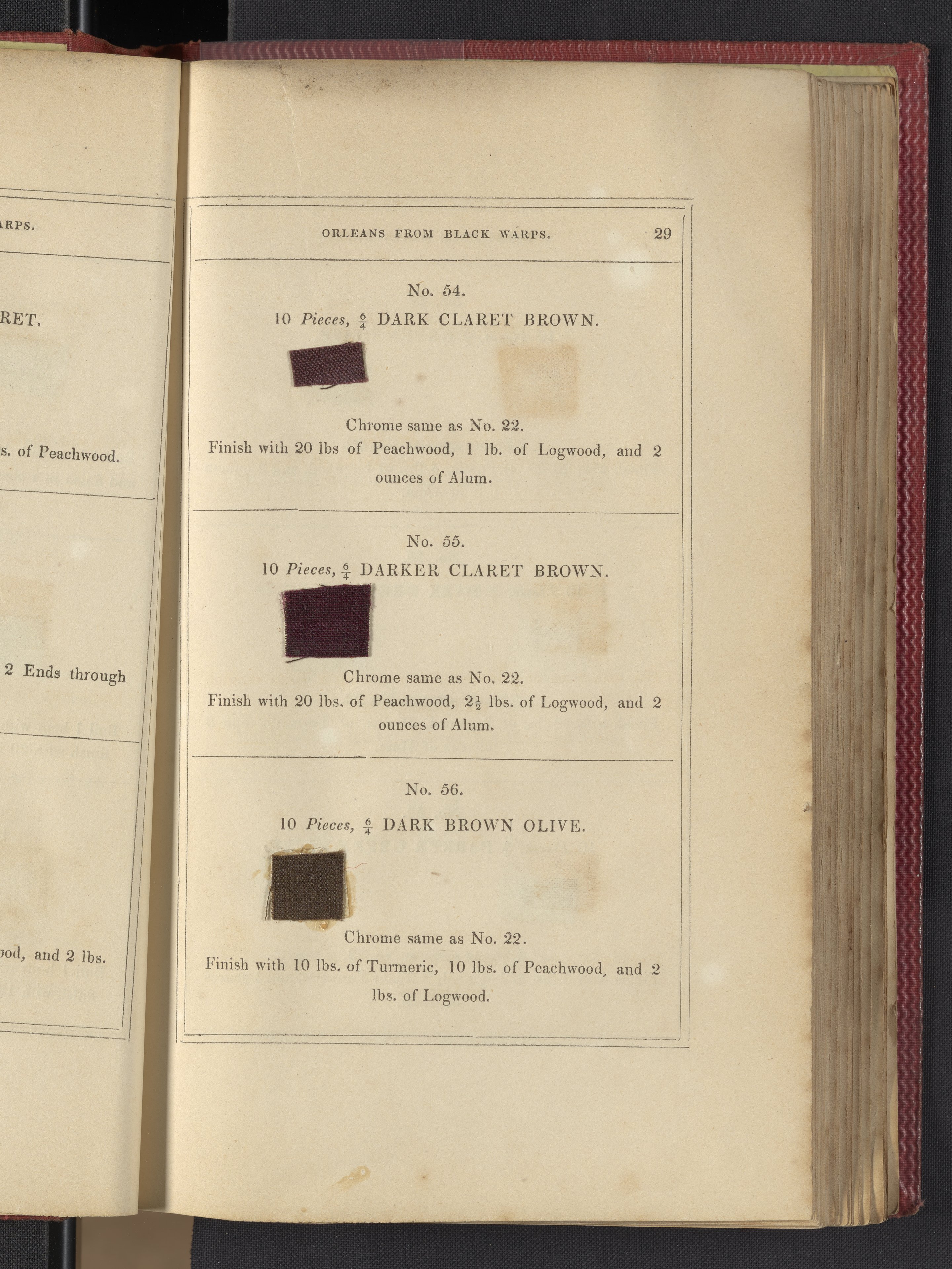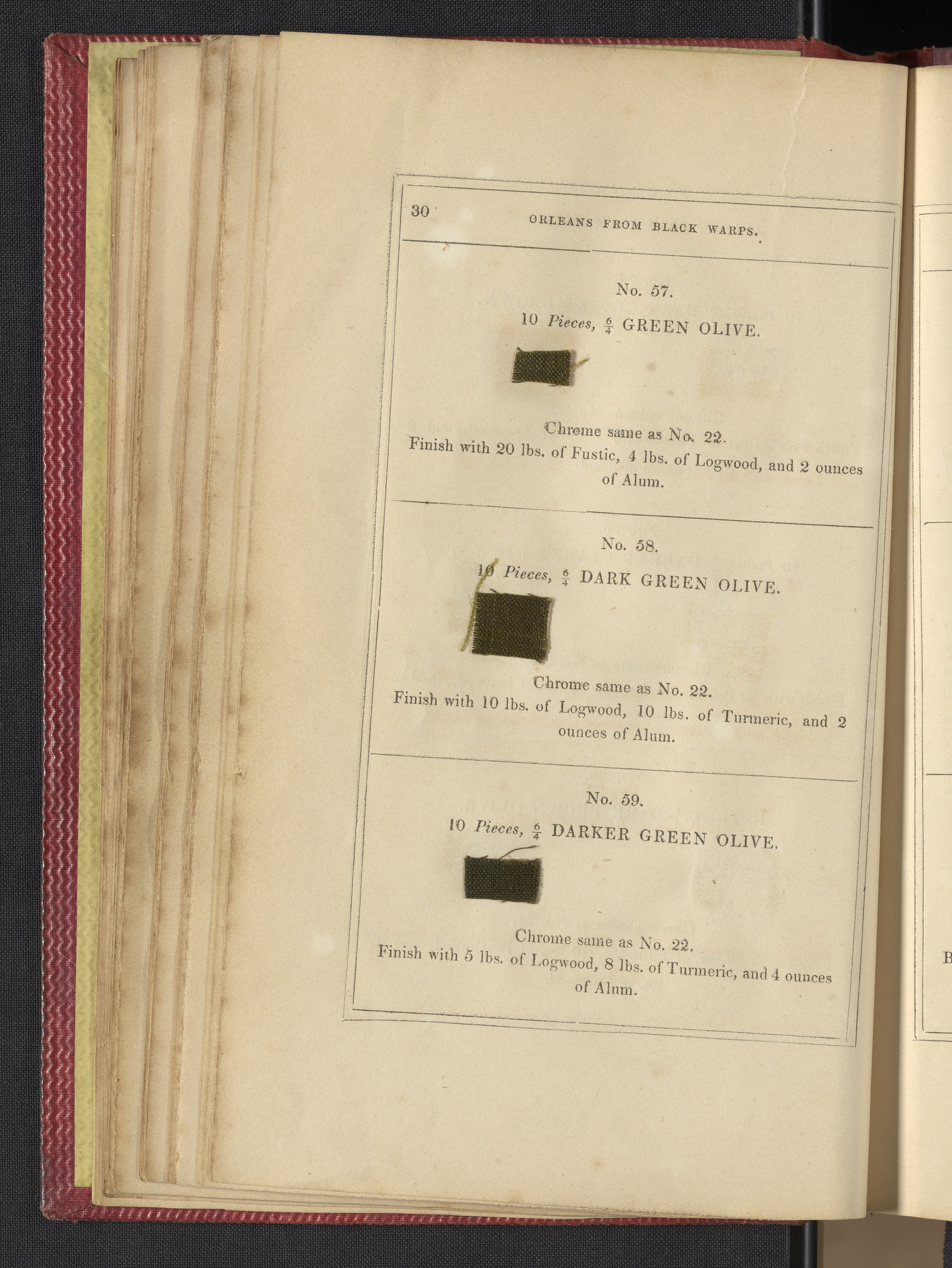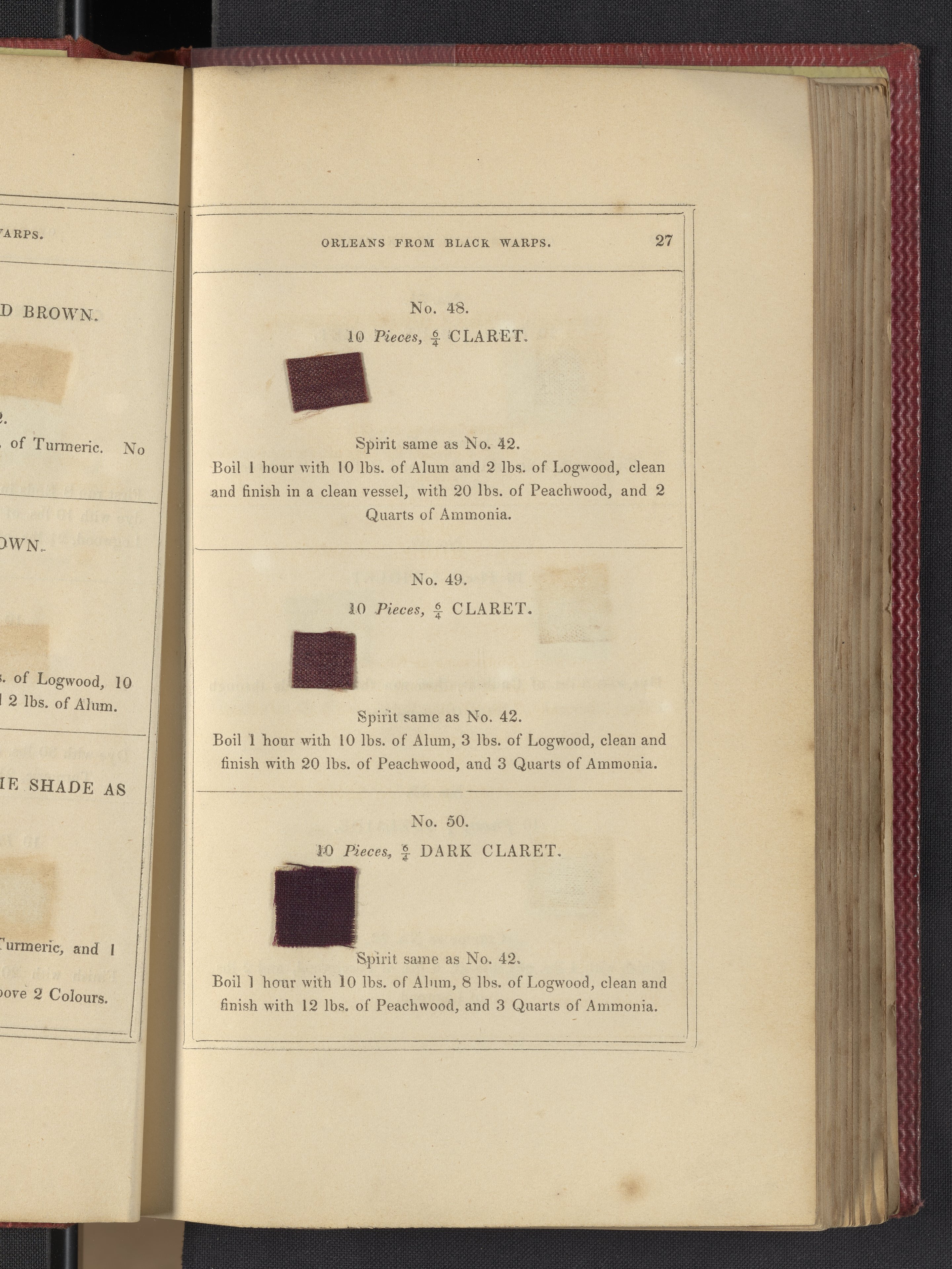 Small JPG1200 x 1735px — 633 KBLarge JPG2880 x 4164px — 3.1 MBFull-sized JPG3850 x 5566px — 5.1 MBOriginal fileTIFF — 3850 x 5566px — 61.4 MB"Comprising practical instructions in the dyeing of shot cobourgs, silk striped orleans, colored orleans from black warps, ditto from white warps, colored cobourgs from white warps, merinos, yarns, woollen cloths, &c.; containing nearly 300 receipts, to most of which a dyed pattern is annexed."