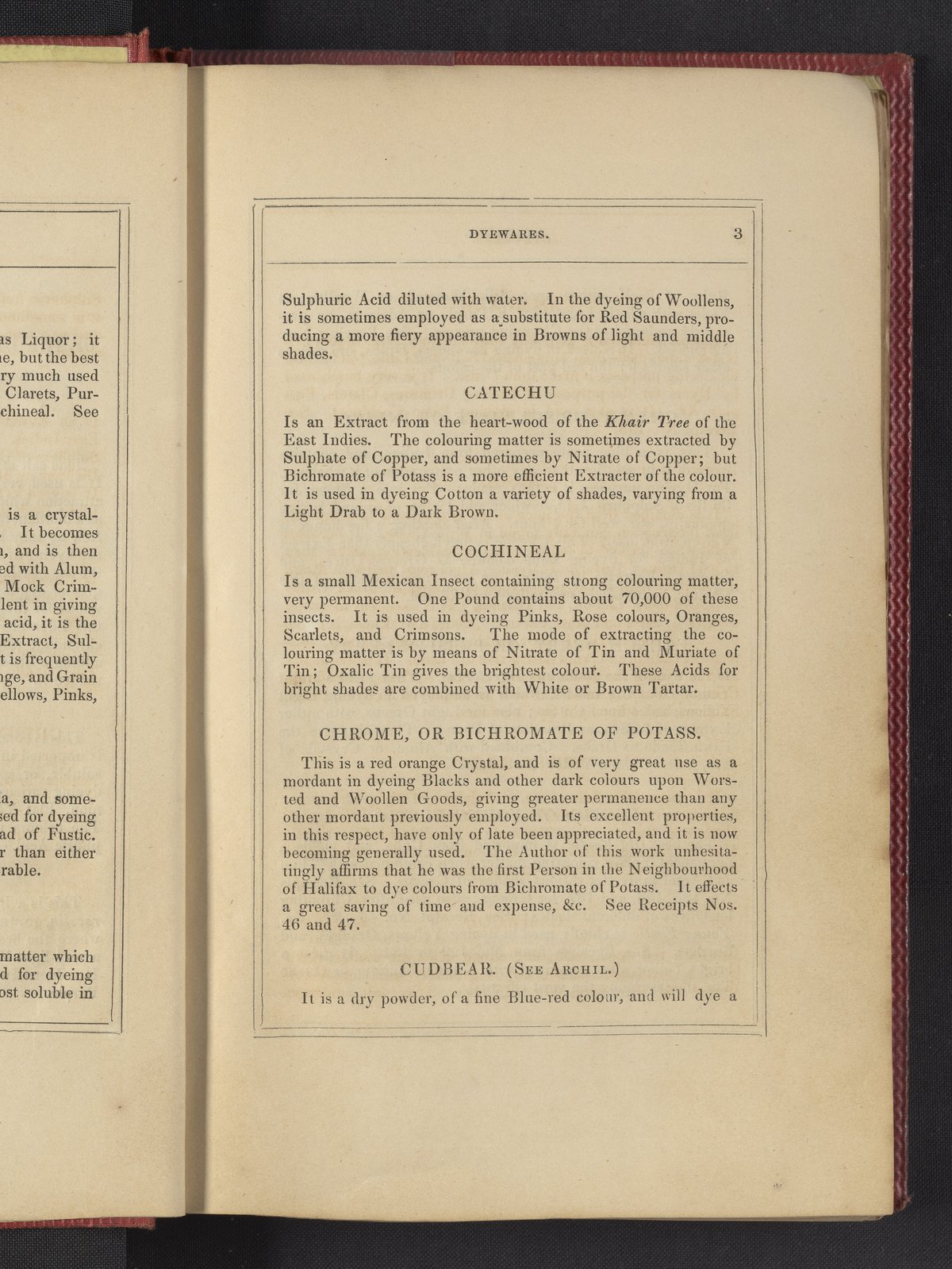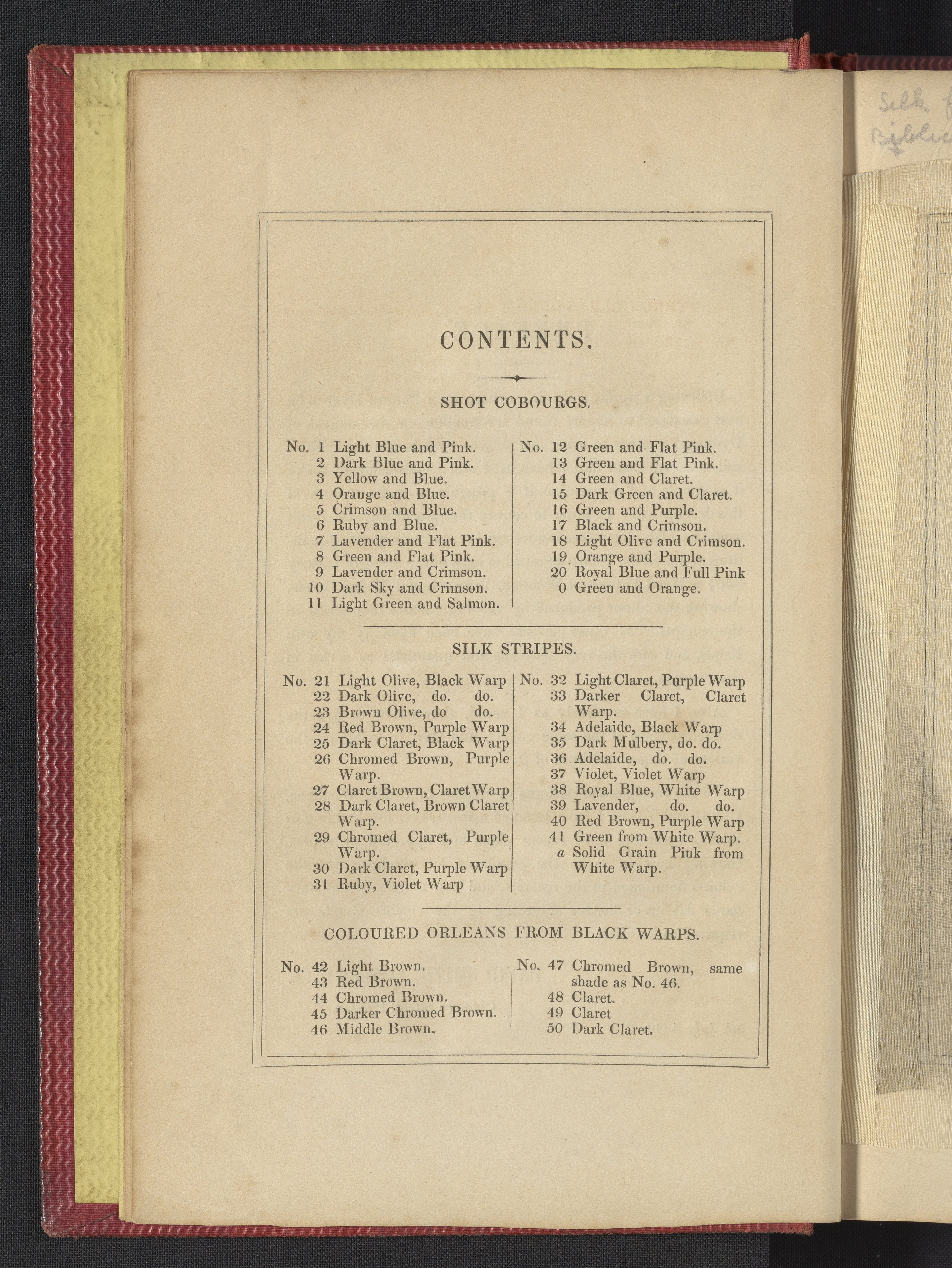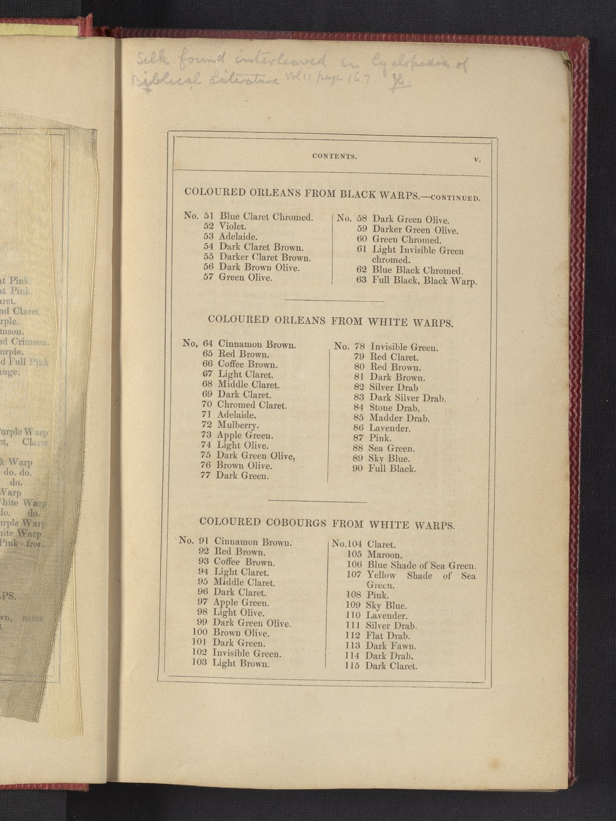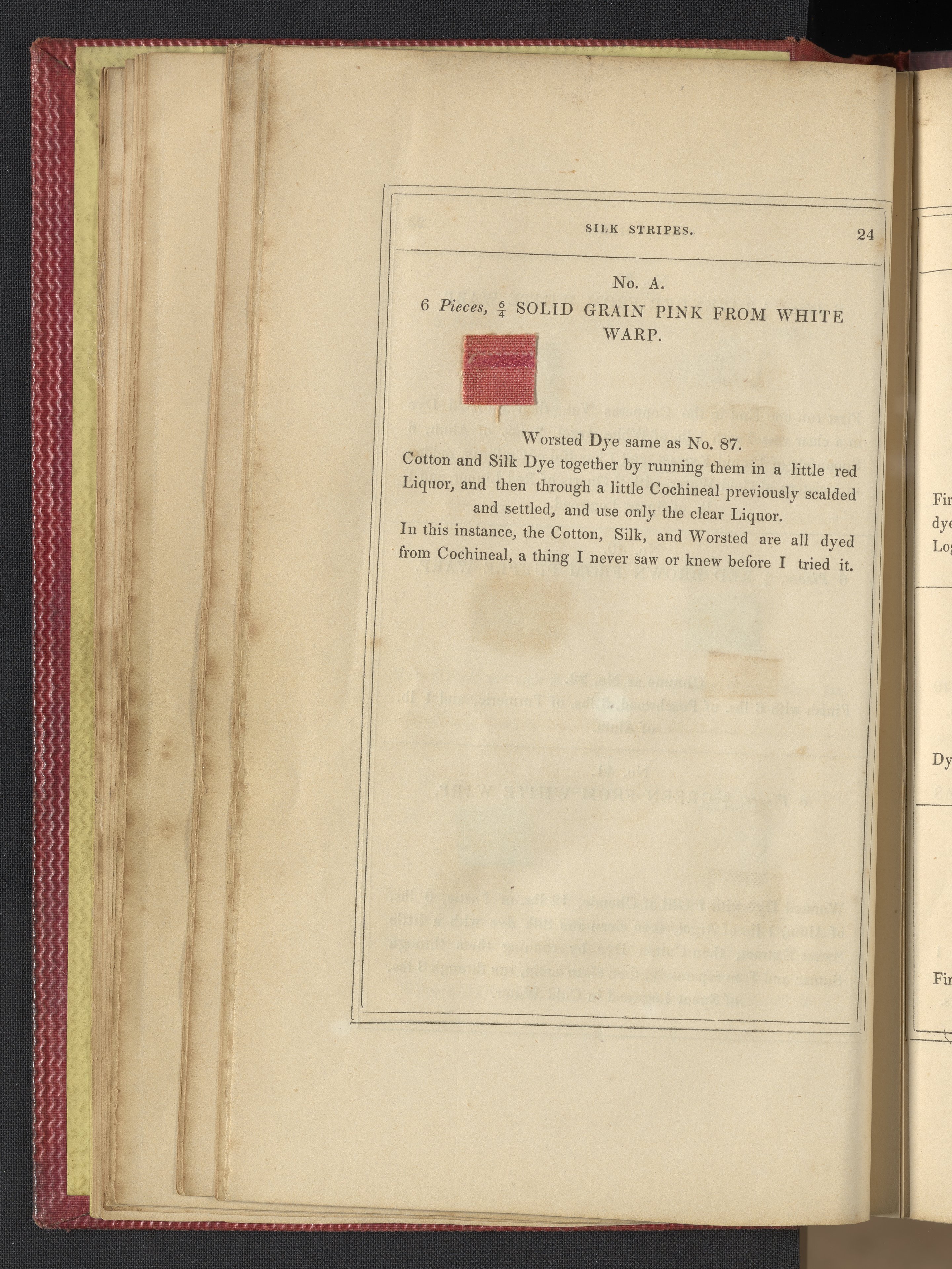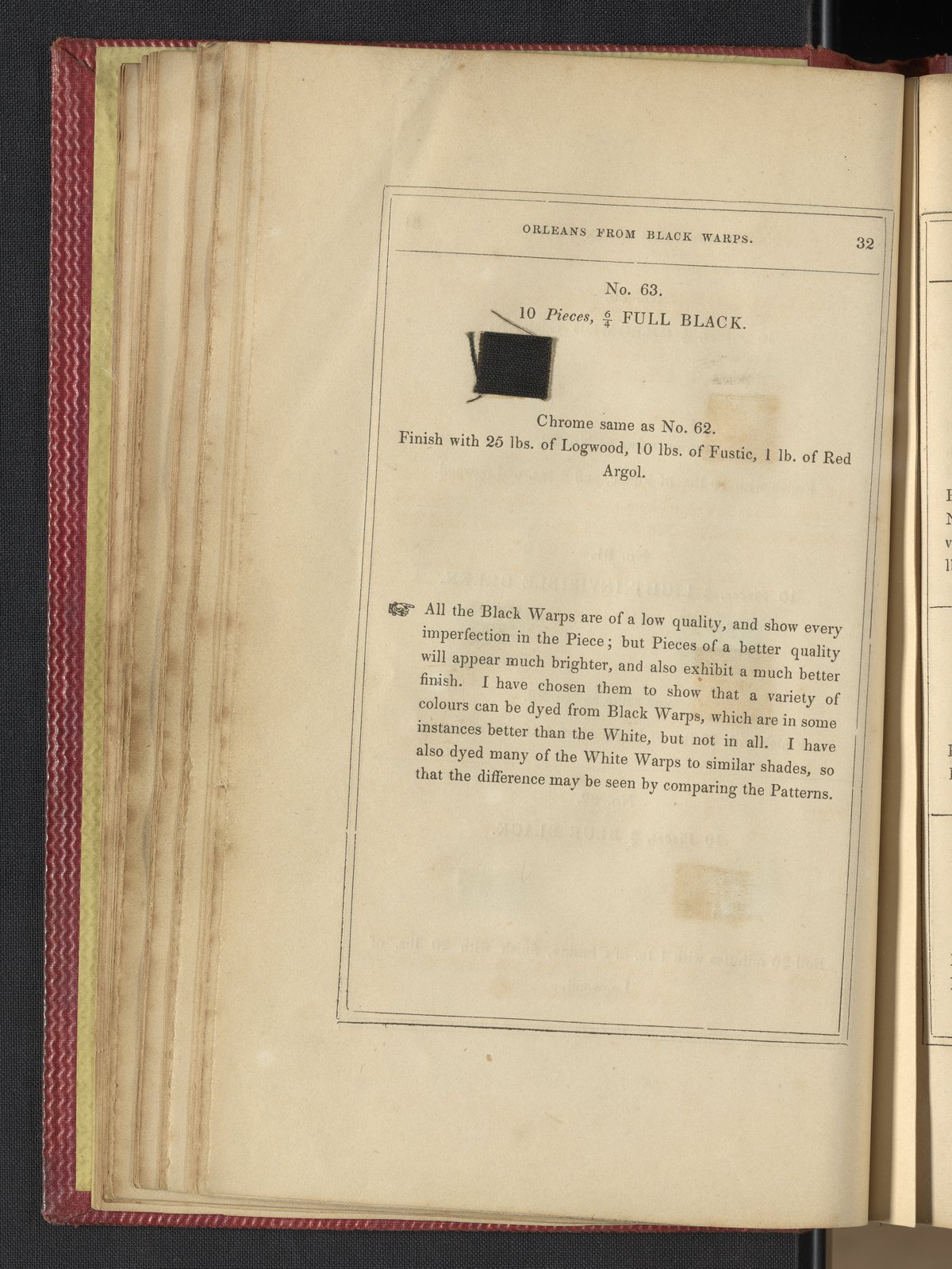 Small JPG1200 x 1735px — 633 KBLarge JPG2880 x 4164px — 3.1 MBFull-sized JPG3850 x 5566px — 5.1 MBOriginal fileTIFF — 3850 x 5566px — 61.4 MB"Comprising practical instructions in the dyeing of shot cobourgs, silk striped orleans, colored orleans from black warps, ditto from white warps, colored cobourgs from white warps, merinos, yarns, woollen cloths, &c.; containing nearly 300 receipts, to most of which a dyed pattern is annexed."