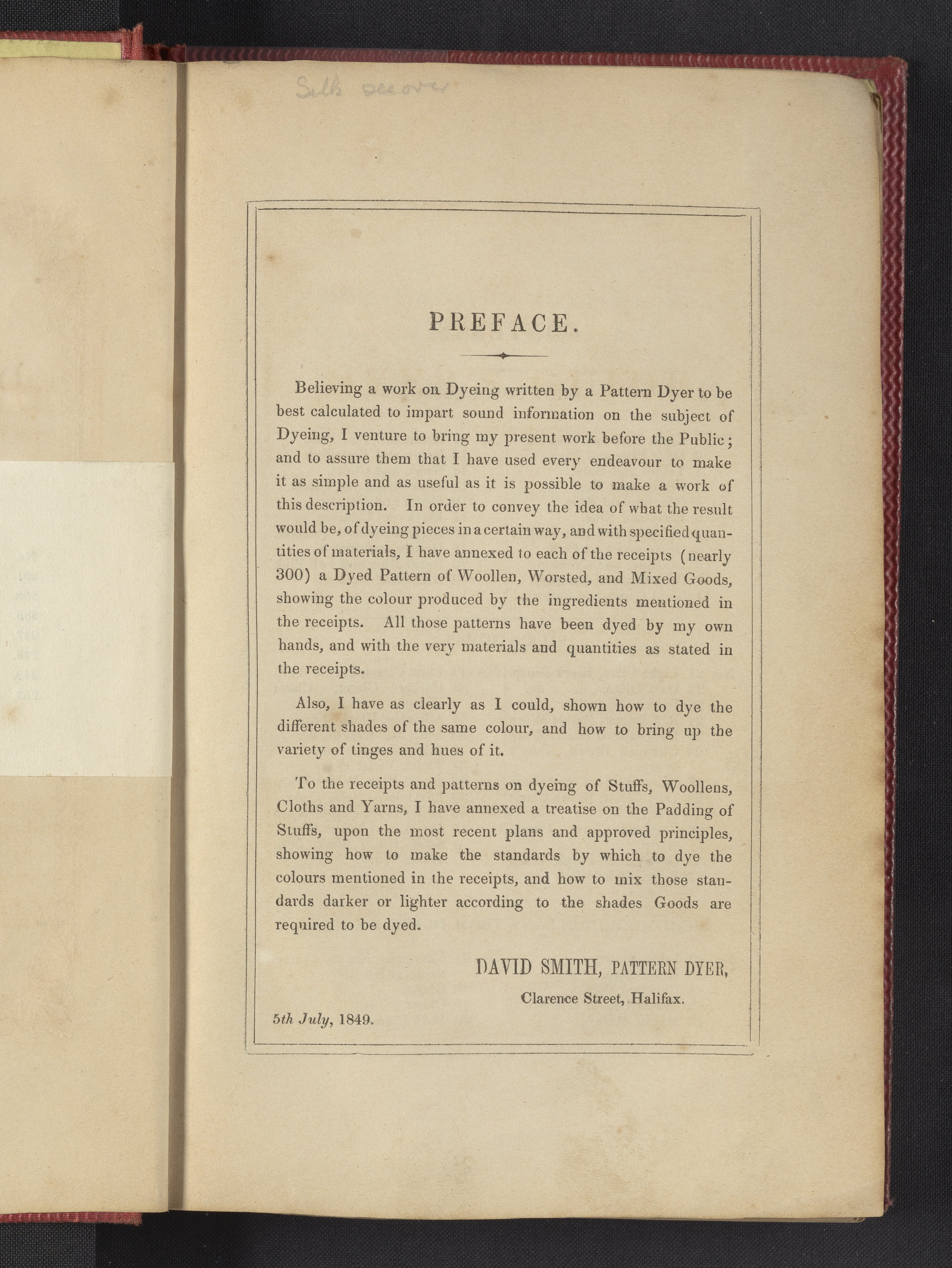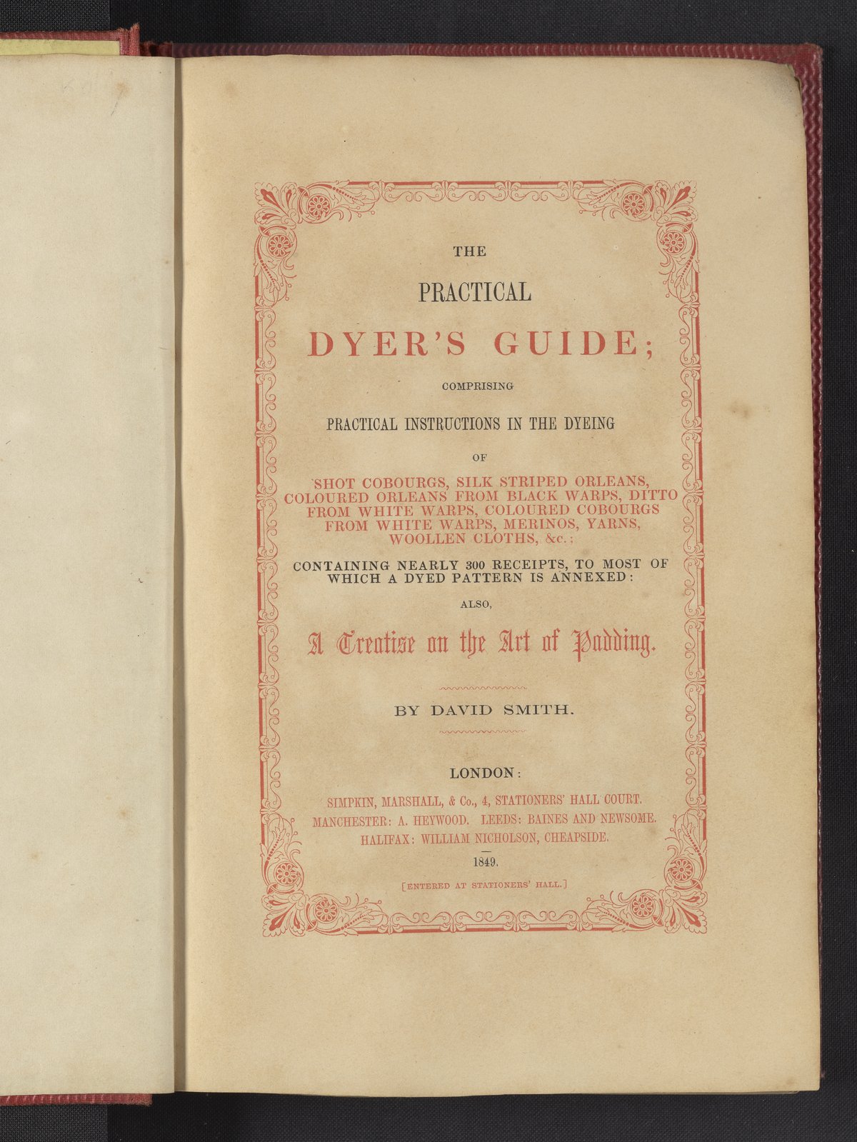 Smith, David. The Practical Dyer's Guide. London, England: Simpkin, Marshall, and Co., 1849. https://digital.sciencehistory.org/works/00000059p.