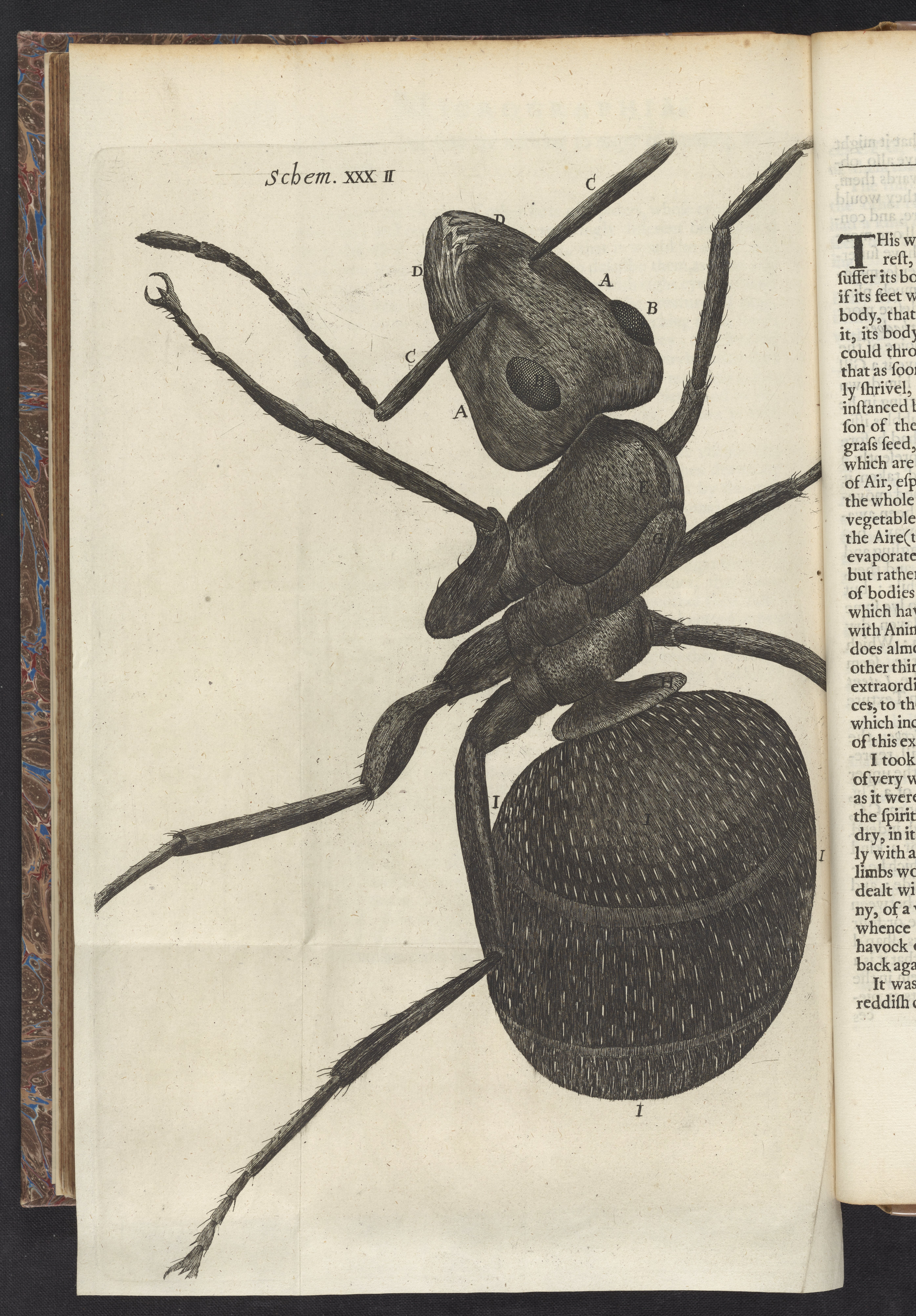 Hooke, Robert. “Microscopic View of an Ant or Pismire.” In Micrographia : or, Some Physiological Descriptions of Minute Bodies Made by Magnifying Glasses. With Observations and Inquiries Thereupon. London, England: J. Martyn, 1665. https://digital.sciencehistory.org/works/000001120.