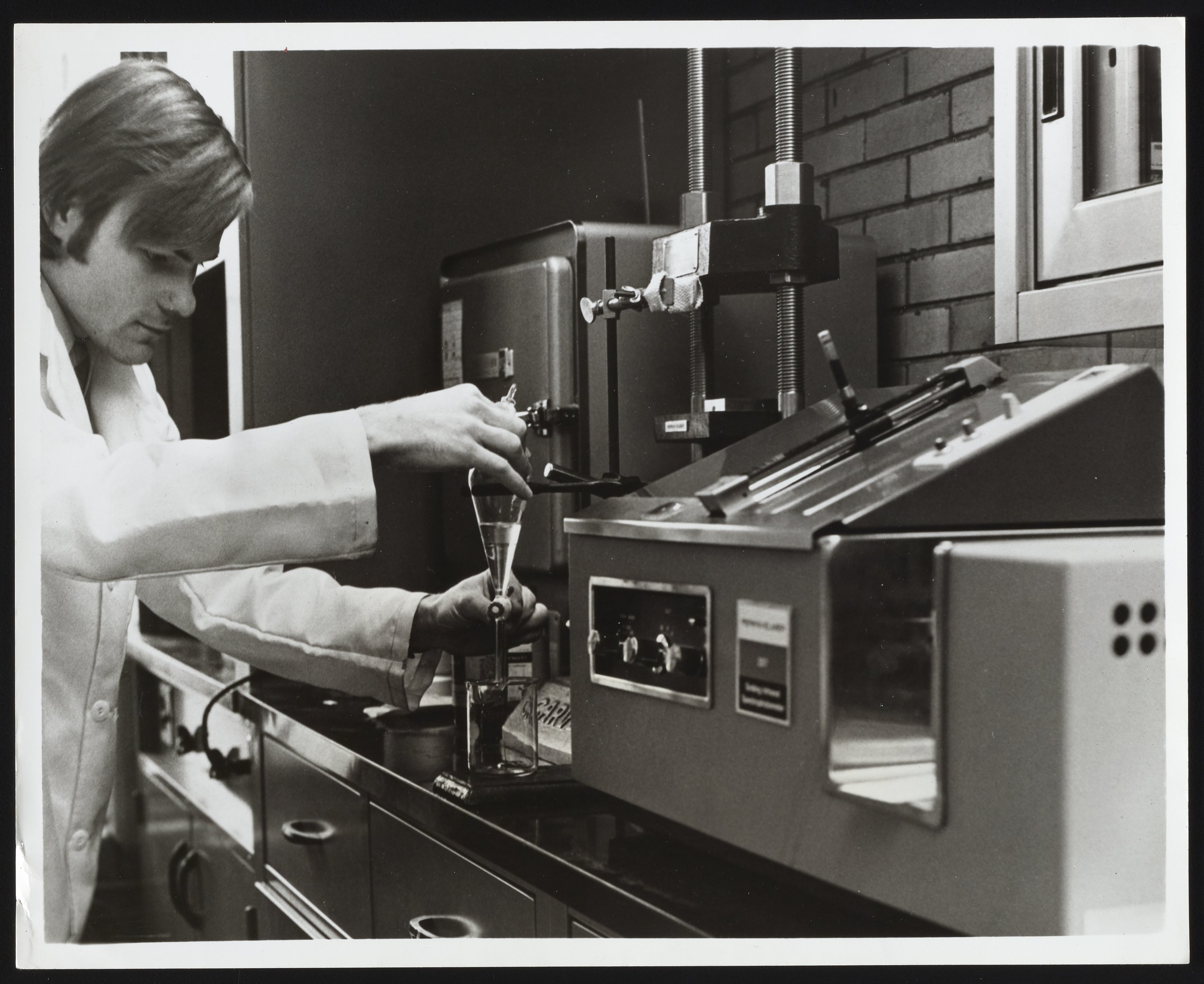 General view of an unidentified chemist preparing a drug evidence sample for analysis by a Perkin-Elmer Infrared Spectrophotometer in the Columbus Police Department Crime Laboratory. Per notations accompanying the photograph, the sample is dissolved in sodium carbonate and purified with chloroform. The solution is then evaporated and the remaining residue is analyzed by the spectrophotometer for use as evidence in court.