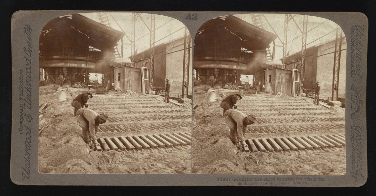 “Making the Sand Moulds for Pig Iron.” Underwood & Underwood, n.d. Underwood & Underwood Stereographs of Manufacturing Industries. Science History Institute. Philadelphia. https://digital.sciencehistory.org/works/08612n53m.