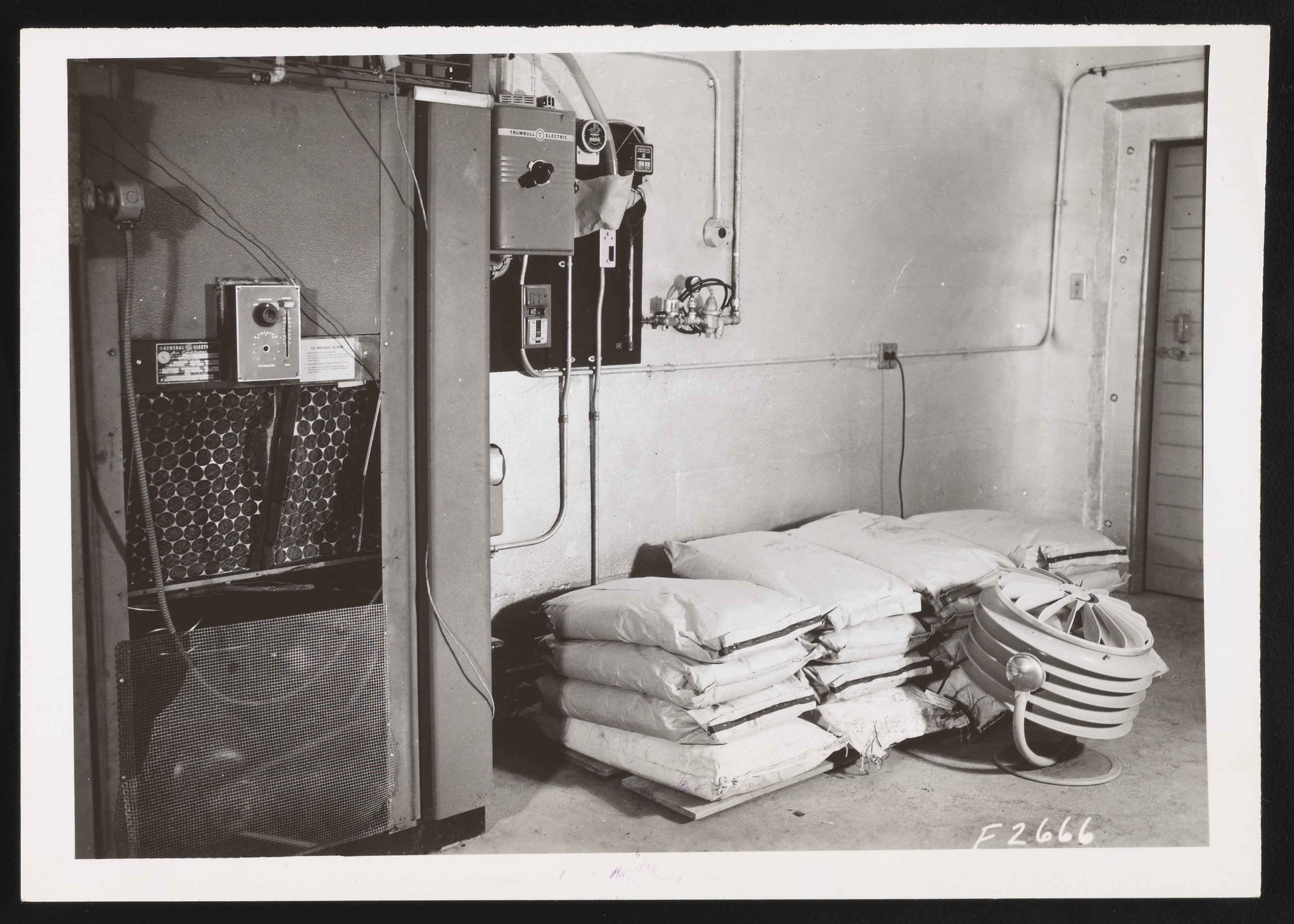 General view of the Air Control Room at the U.S. Department of Agriculture's Agricultural Engineering Laboratory showing three bags of fertilizer in storage under three bags of sand.