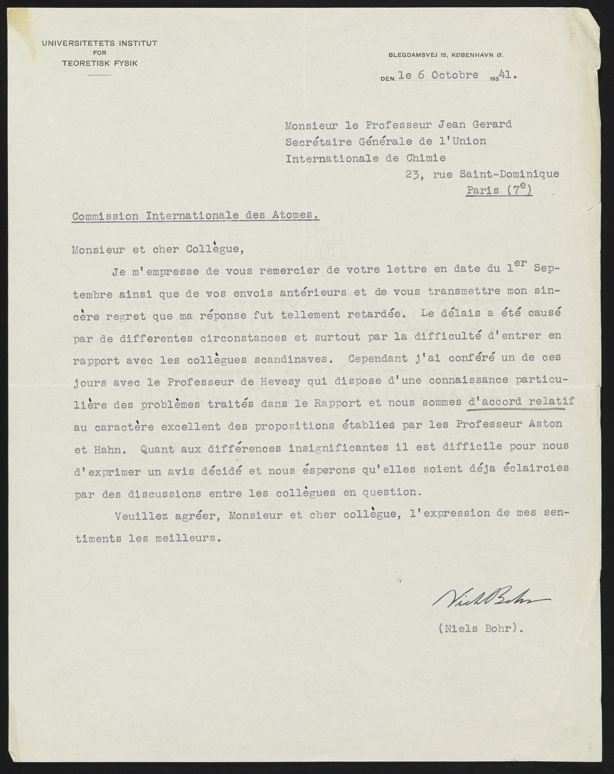 Letter from Niels Bohr to Jean Gerard