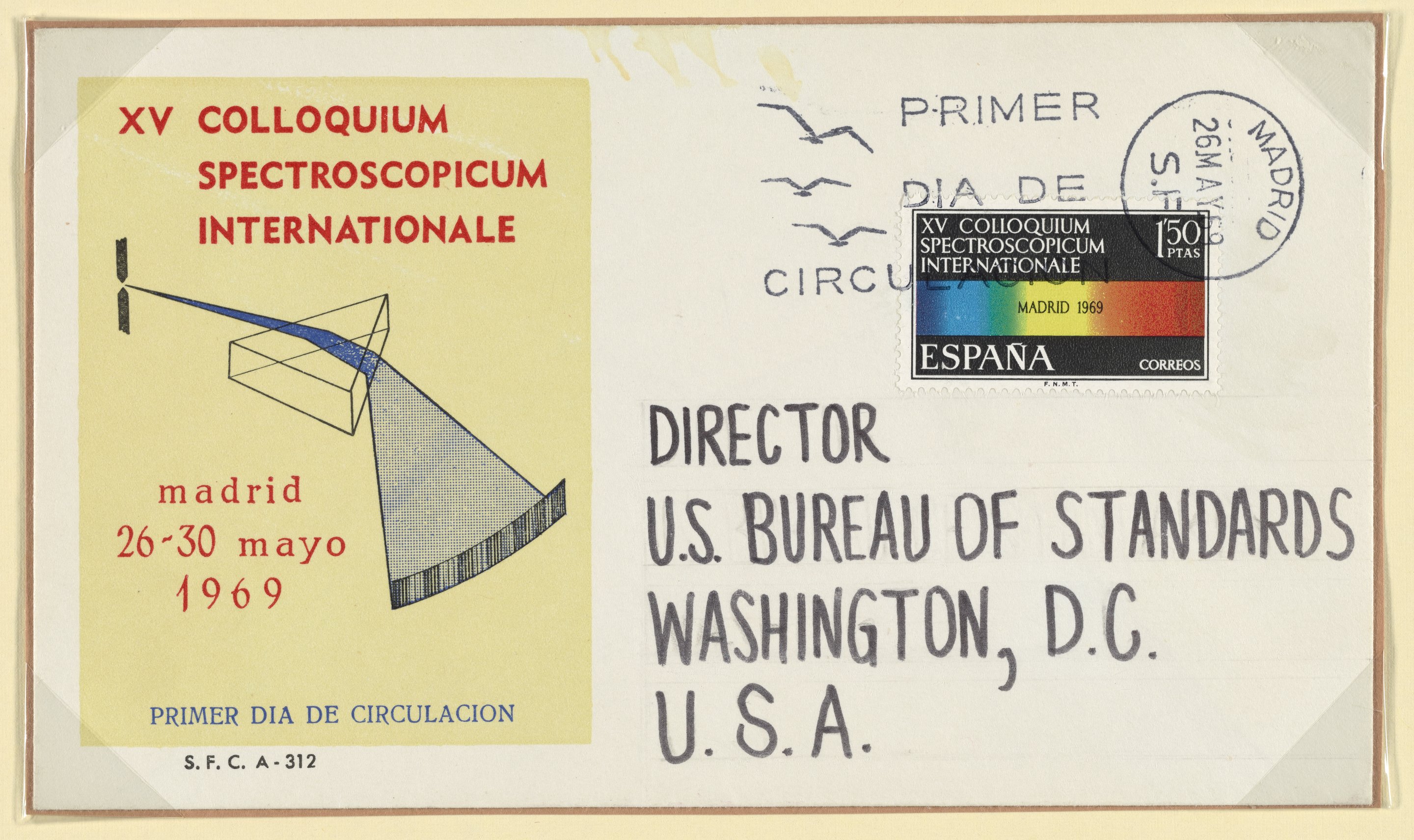 S.F.C., and Fábrica Nacional de Moneda y Timbre (Spain). “First Day Cover Commemorating the XV Colloquium Spectroscopicum Internationale.” Spain, 1969. Witco Stamp Collection, Box 5. Science History Institute. Philadelphia. https://digital.sciencehistory.org/works/08612n619.