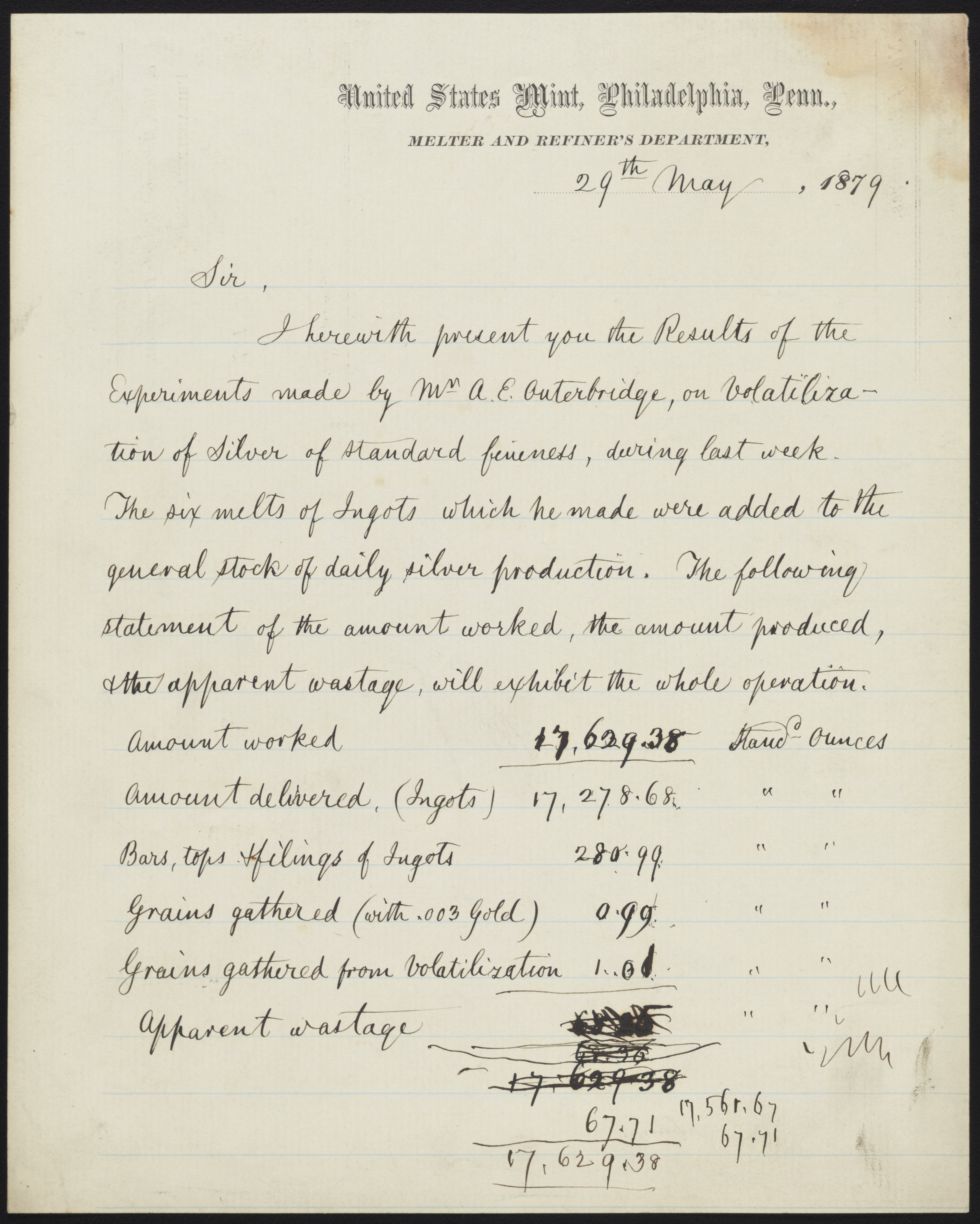 James Curtis Booth's (1810-1888) comments on experiments made by A.E. Outerbridge on volatilization of silver of standard fineness.