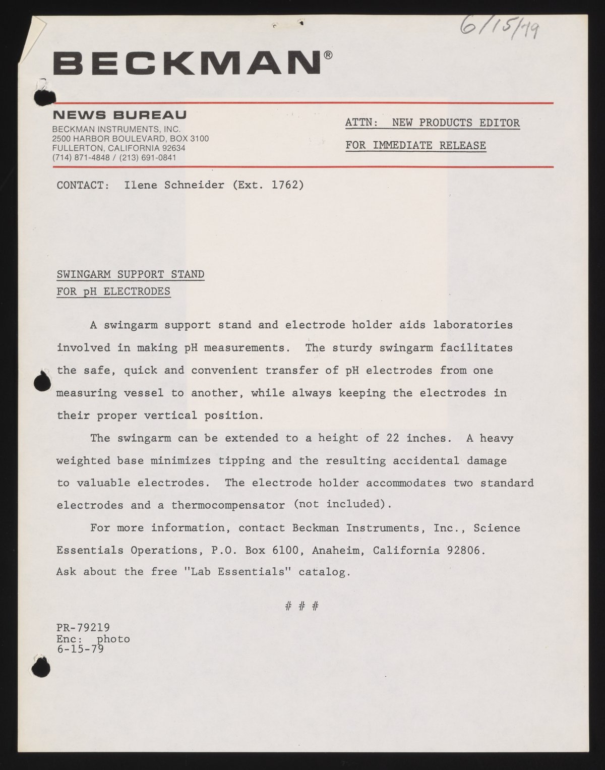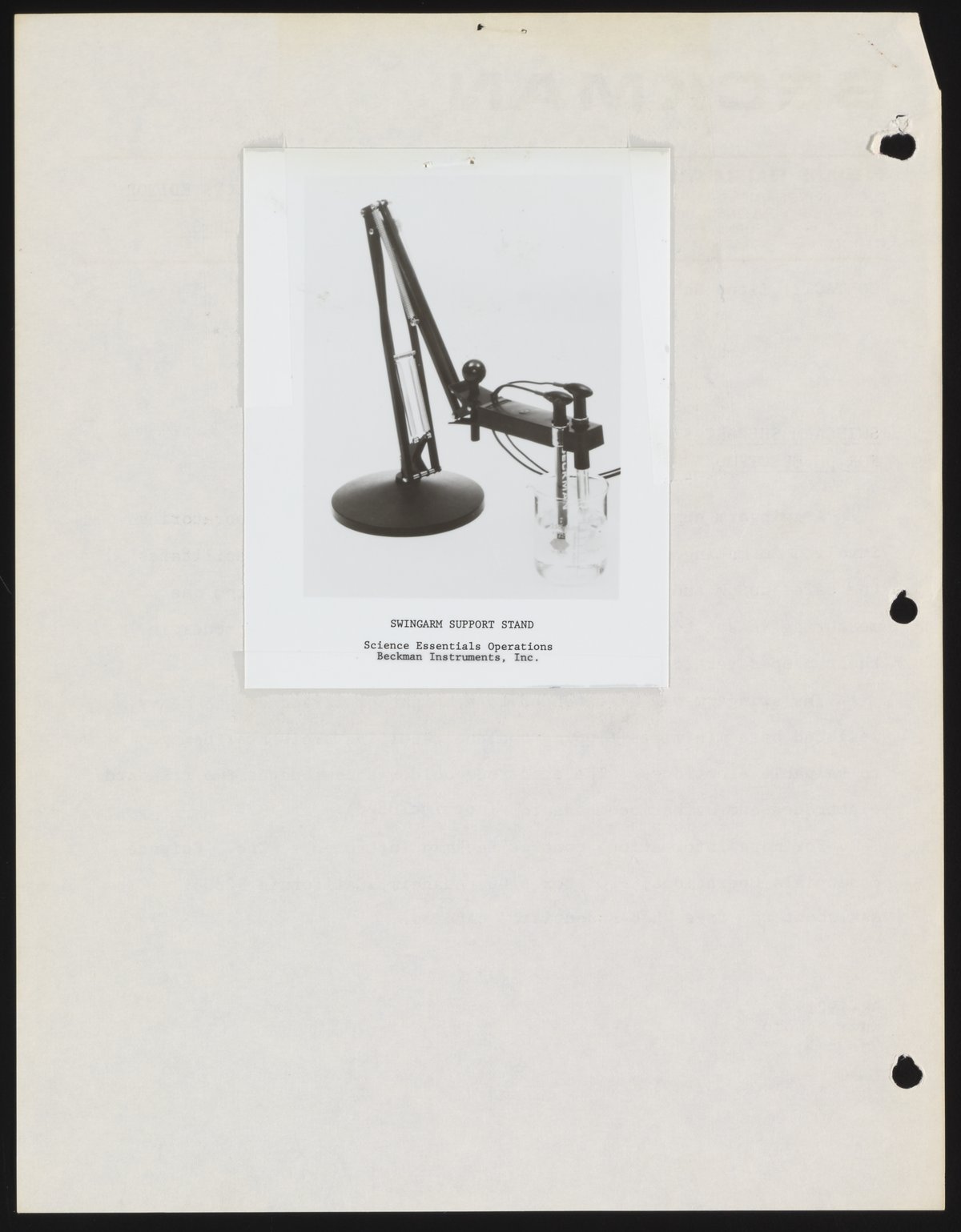 Schneider, Ilene. “Swingarm Support Stand for PH Electrodes,” June 15, 1979. Beckman Historical Collection, Box 58, Folder 68. Science History Institute. Philadelphia. https://digital.sciencehistory.org/works/08612p17z.
