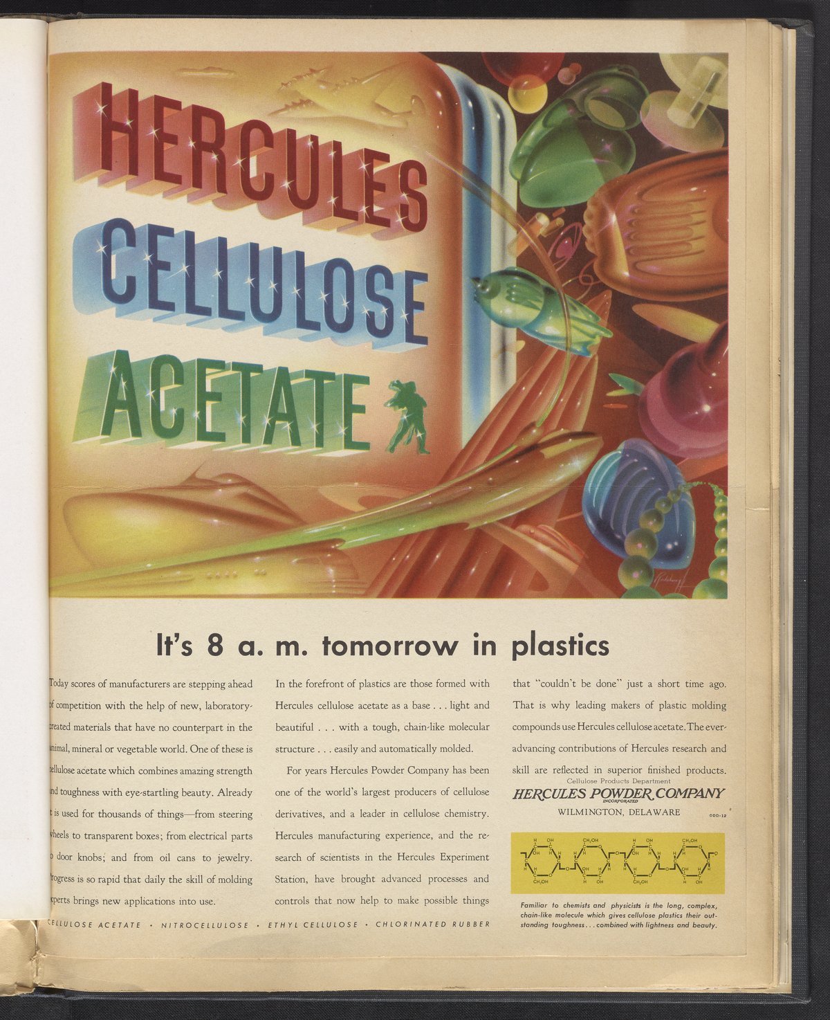Hercules Incorporated. “Hercules Cellulose Acetate: It's 8 A.m. Tomorrow in Plastics.” 1940 Hercules Advertisements, 1940. Records of Hercules Incorporated, Volume 1940. Science History Institute. Philadelphia. https://digital.sciencehistory.org/works/0c483k23m.