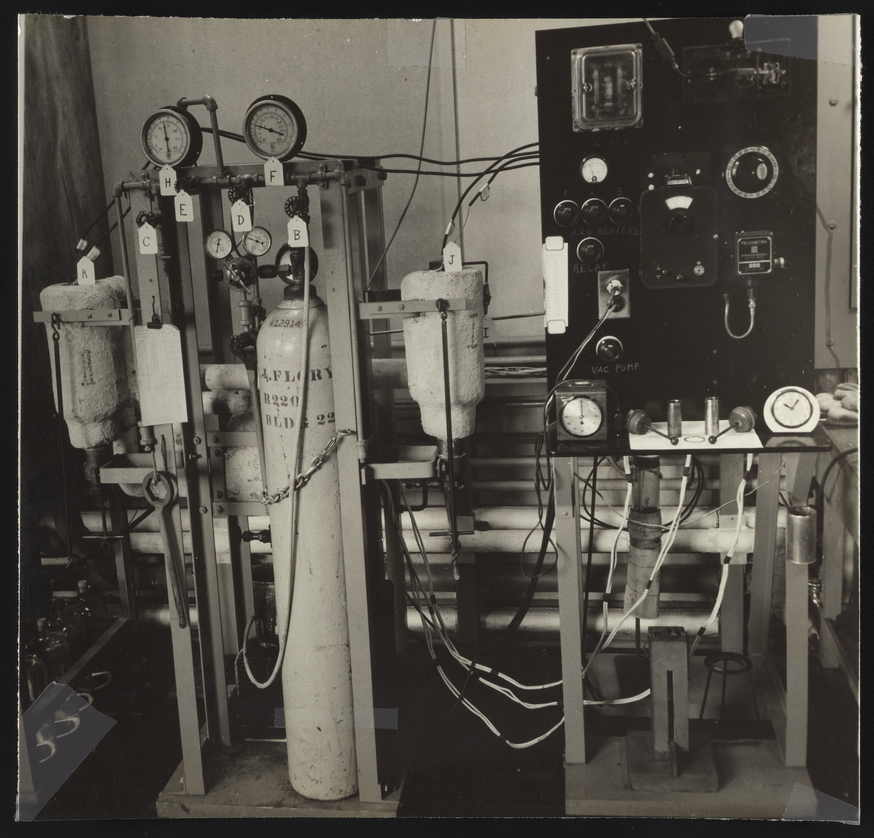 “Melt Viscometer at DuPont Experimental Station,” August 24, 1938. Joseph X. Labovsky Collection of Nylon Photographs and Ephemera, Box 2. Science History Institute. Philadelphia. https://digital.sciencehistory.org/works/0g354f24x.