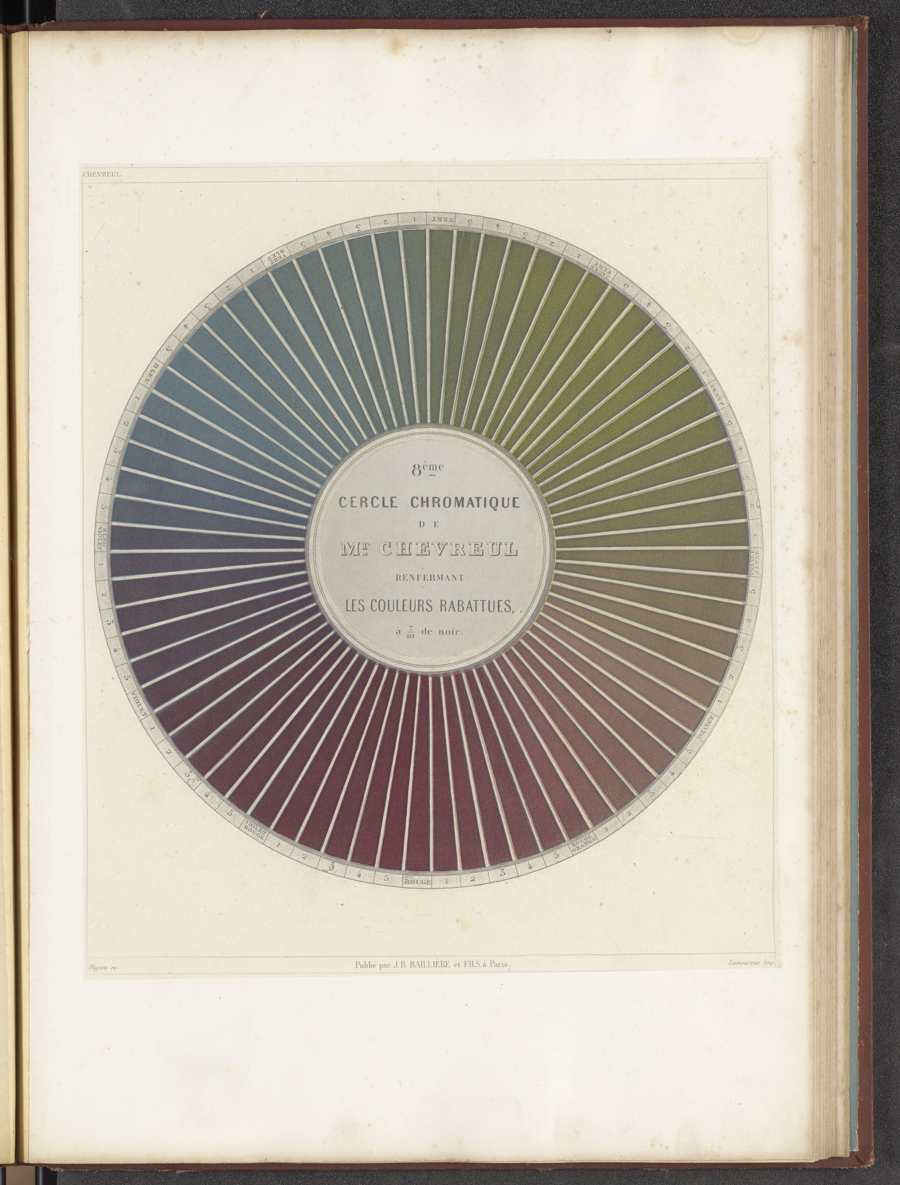 Chevreul, M. E. (Michel Eugène). “Plate XII: Huitième Cercle Chromatique.” In Des Couleurs Et De Leurs Applications Aux Arts Industriels à l'Aide Des Cercles Chromatiques. Paris, France: J.-B. Baillière et fils, 1864. https://digital.sciencehistory.org/works/0g354f345.