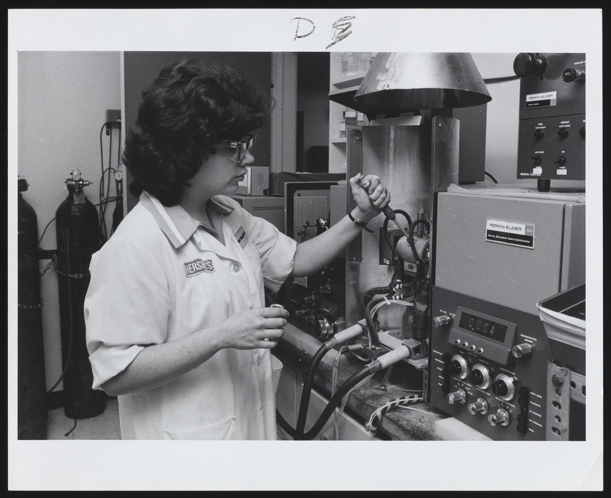 General view of laboratory technician Margaret Kreiser using the heated graphite atomizer (HGA) attachment of a Perkin-Elmer Model 403 Atomic Absorption Spectrophotometer to test a chocolate sample for volatile elements at a Hershey Company facility. Per notations accompanying the photograph, Kreiser is seen piping a liquid sample into the electric furnace of the unit.