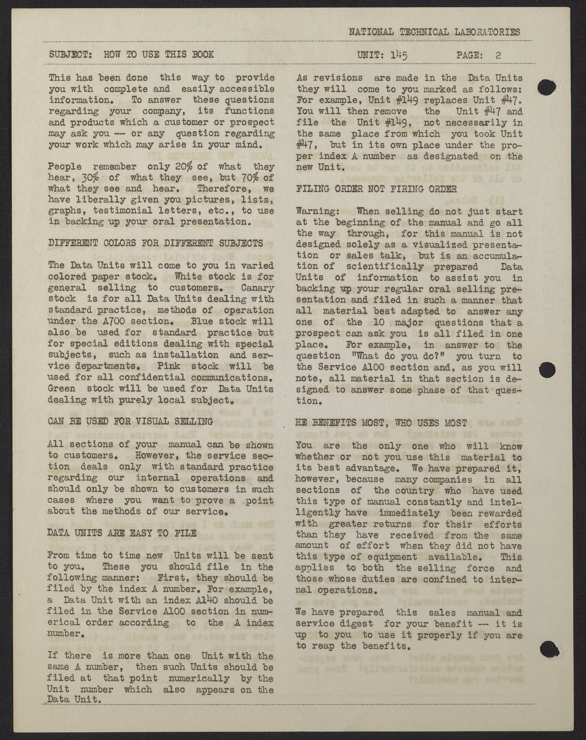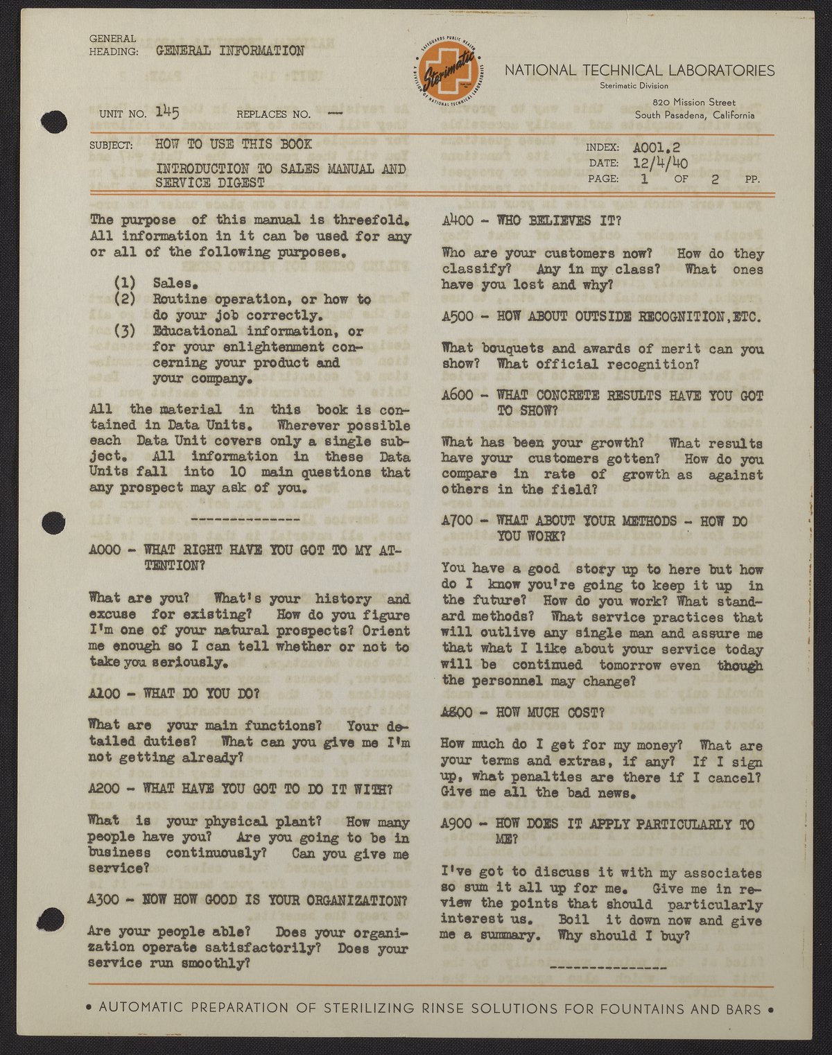 The document and an accompanying manual were intended to prepare sales staff to answer customer questions and perform other job functions. The Sterimatic was a device which automatically dispensed a pH-controlled chlorine germicide rinse. Soda fountains, bars, and lunch counters were the target market.