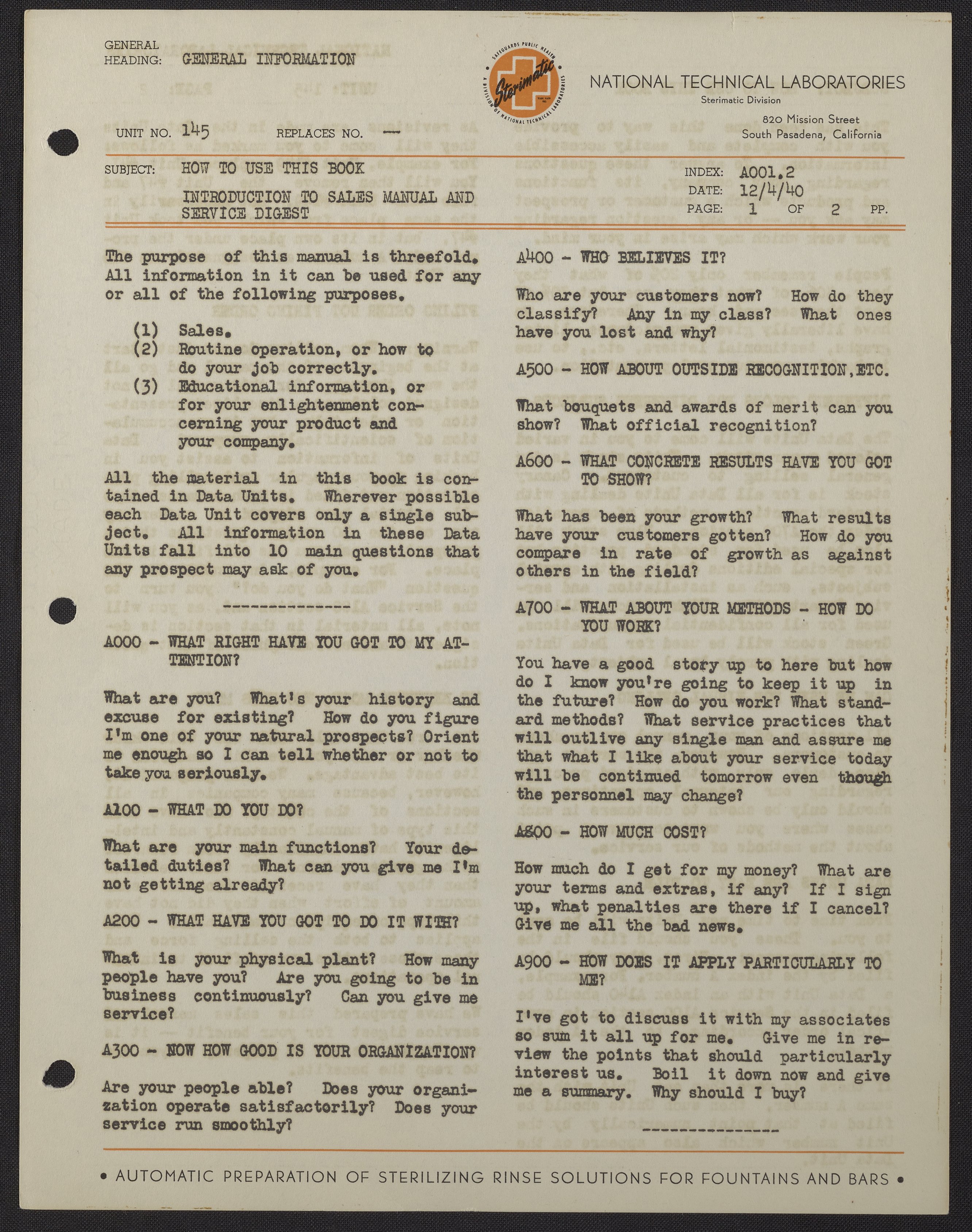Sterimatic: Introduction to Sales Manual and Service Digest