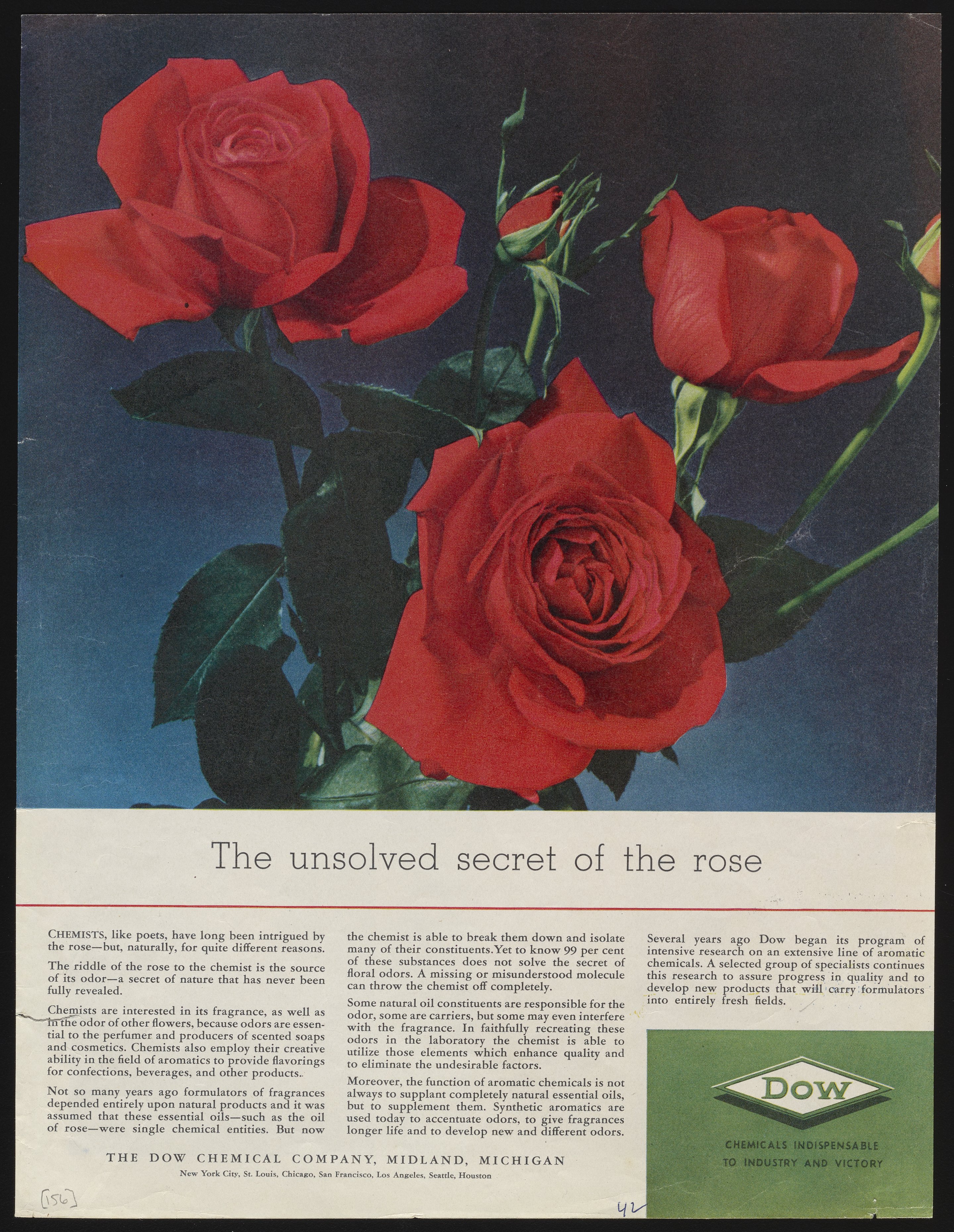 Dow Chemical Company. “The Unsolved Secret of the Rose,” 1942. Advertisements from the Dow Chemical Historical Collection, Box 7. Science History Institute. Philadelphia. https://digital.sciencehistory.org/works/0k225b71j.