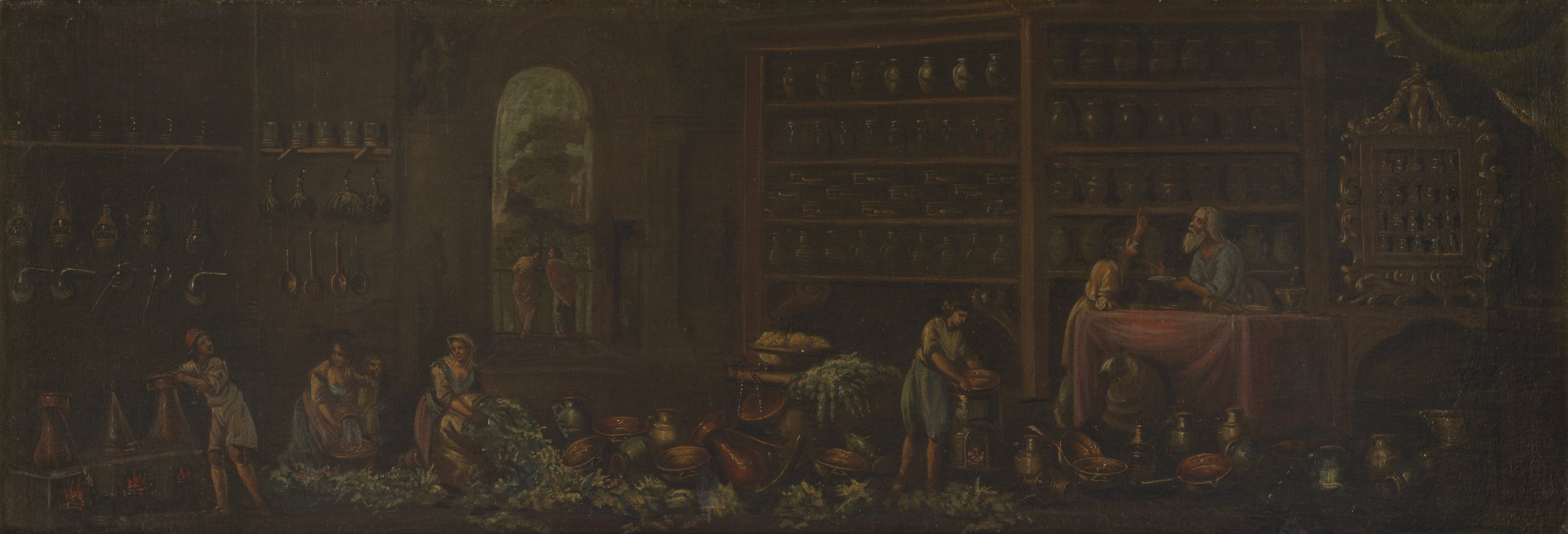 The walls of this busy and productive apothecary's shop are lined with glass vessels and earthenware jars used for the preparation and storage of drugs, tonics and purgatives. The apothecary sits at his desk, conversing with a young assistant in front of a cabinet of "simples" or prepared medicines. On the floor at left, women kneel to pick and sift through bundled herbs and plants. A row of distillation vessels sit above a fire at left, tended by a boy in a cap and apron. Through the large vaulted door, two women can be seen conversing in front of a landscape of trees.