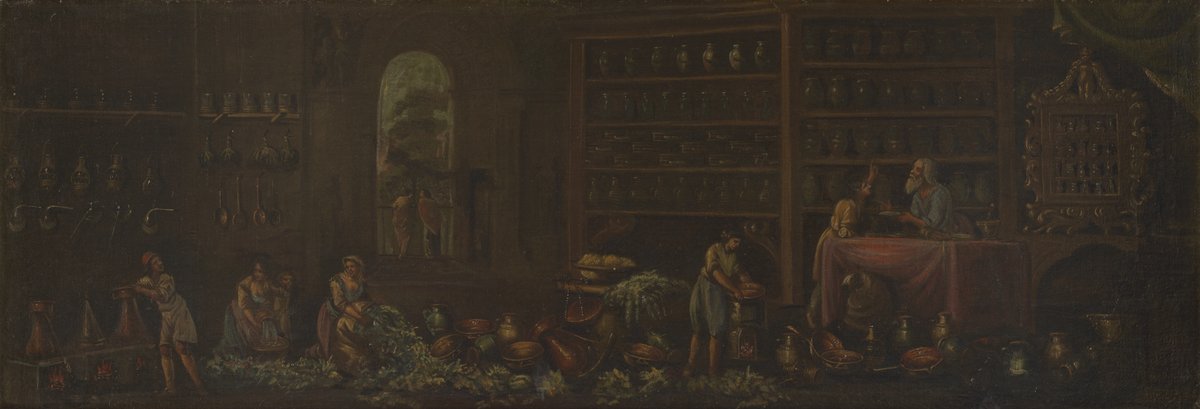 Italian School. Early Italian Pharmacy (Right Side of Pair). Oil paint (paint), canvas (textile material), boards (flat objects), 1600–1699. Science History Institute. Philadelphia. https://digital.sciencehistory.org/works/0k225b929.