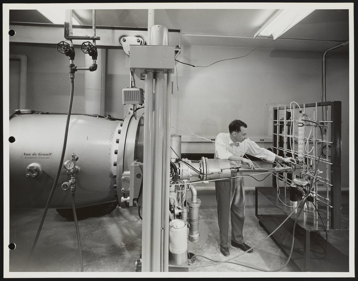 General view of a technician operating an electrostatic accelerator in the Dow Chemical Company's Spectroscopy Laboratory.
