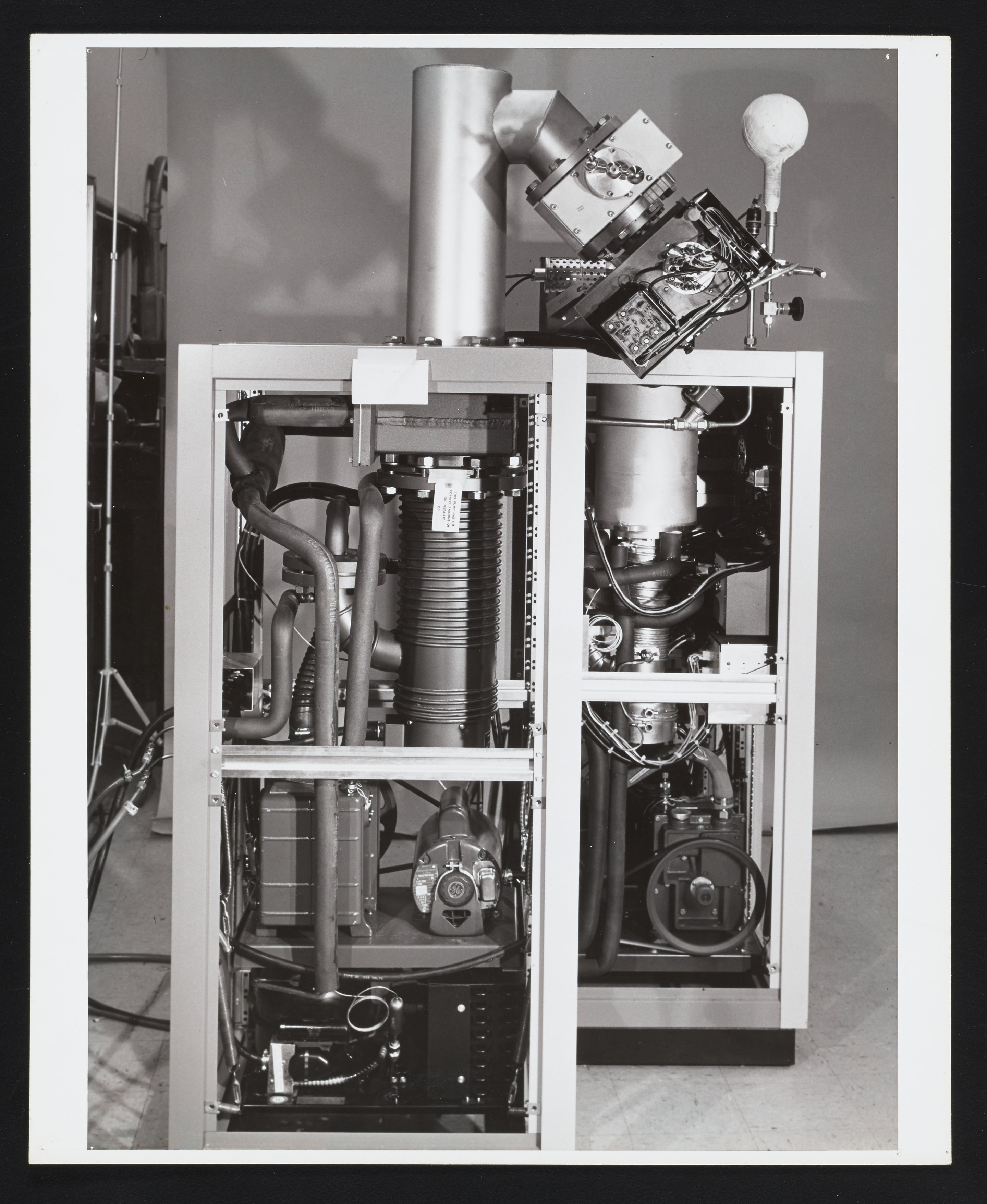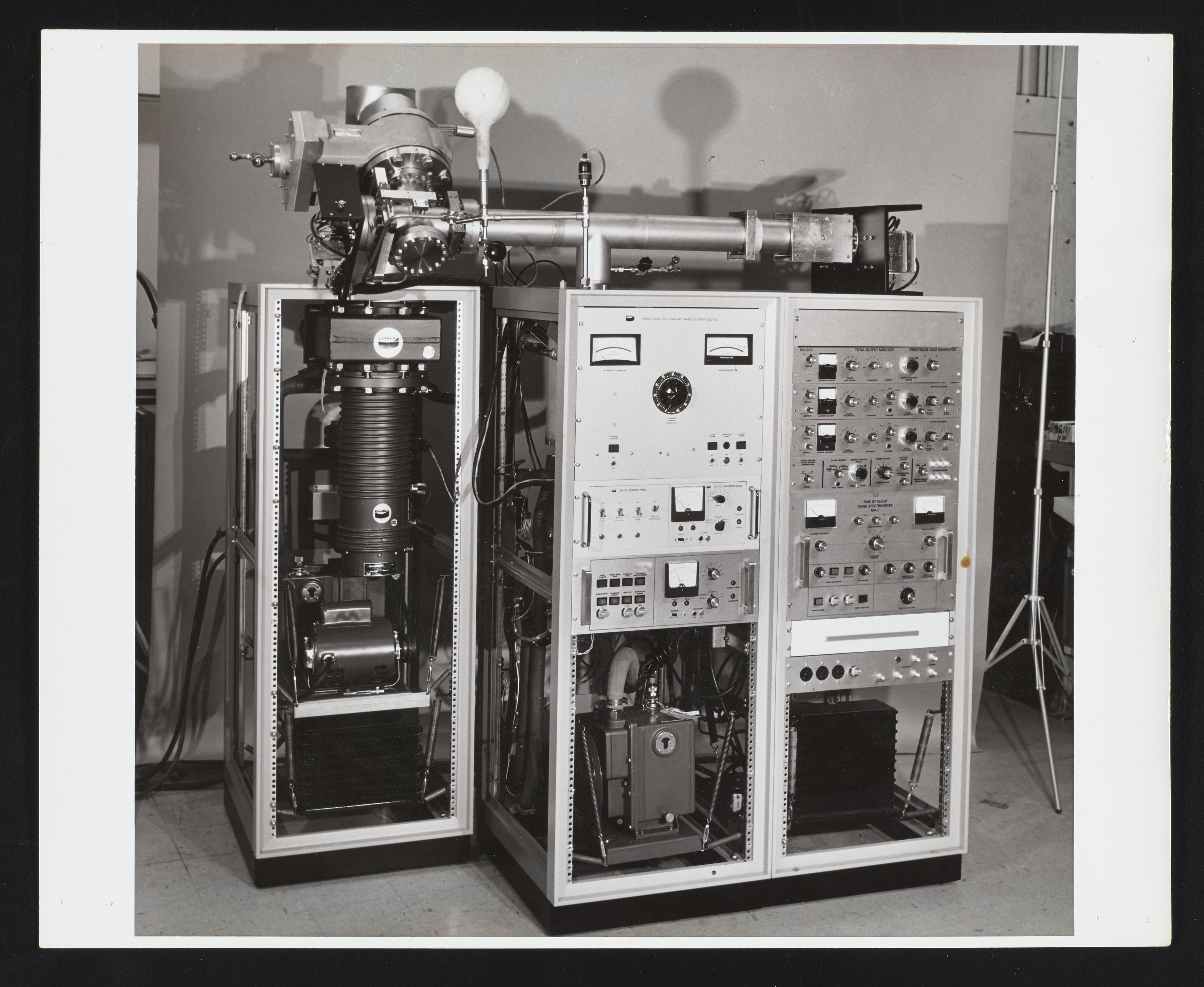 Small JPG1200 x 983px — 181 KBLarge JPG2880 x 2360px — 756 KBFull-sized JPG4378 x 3588px — 1.5 MBOriginal fileTIFF — 4378 x 3588px — 45.0 MBTwo partial views of the interior of a Bendix MA-2 Time-of-Flight Mass Spectrometer, with view of the hot filament sample system control and assorted pumps. The Time-of-Flight Mass Spectrometer (TOFMS) was the flagship analytical instrument of the Bendix Corporation.