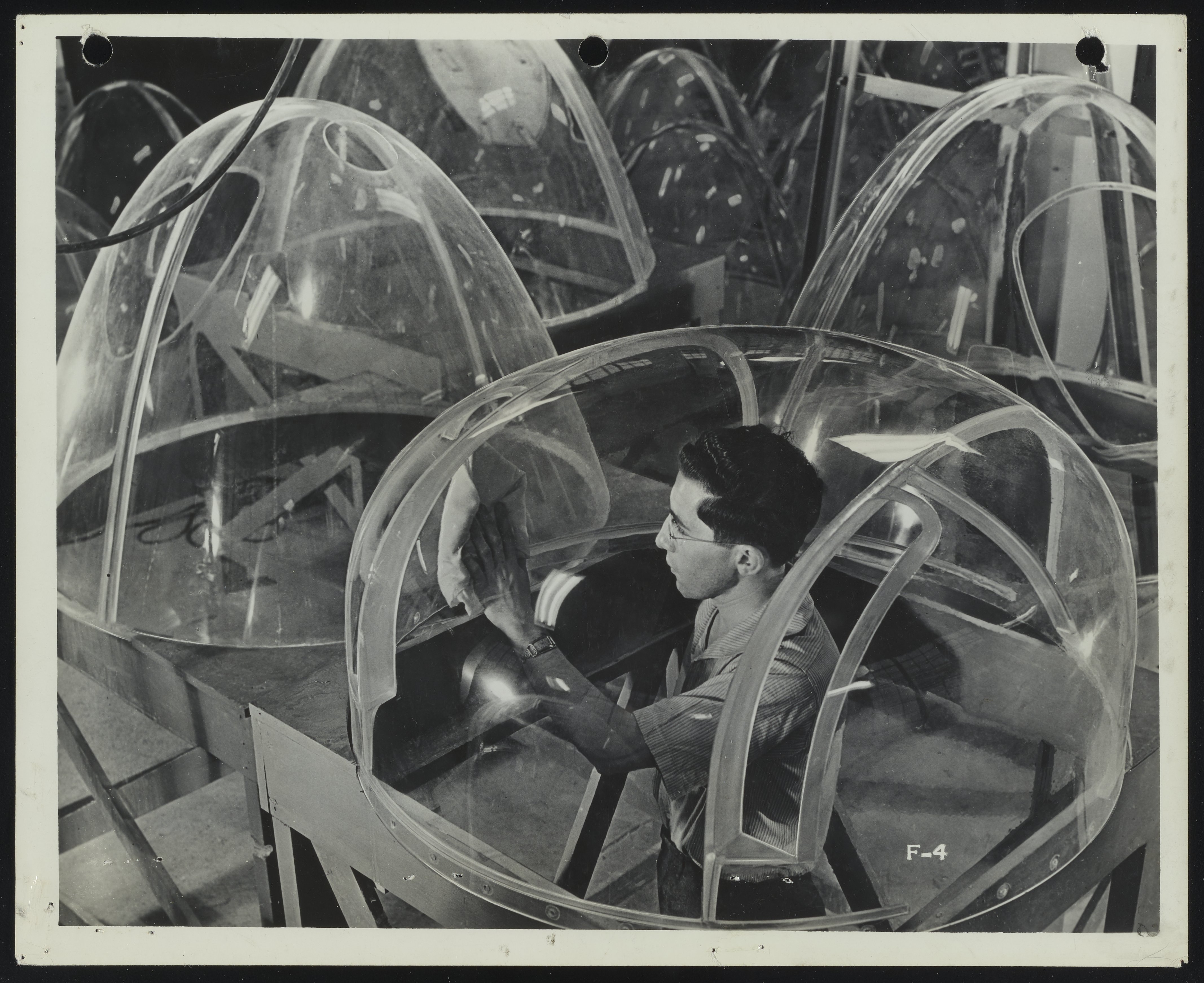 General view of an unidentified male employee polishing a curved panel of Plexiglas designed for use on the nose of an aircraft attack bomber. Several finished panels are visible in the background. Per notations accompanying the photograph, the polishing and buffing of the panels was the final step in the production of the bomber noses. This photograph was likely taken at the Rohm and Haas Company plant located in Bristol, Pennsylvania.