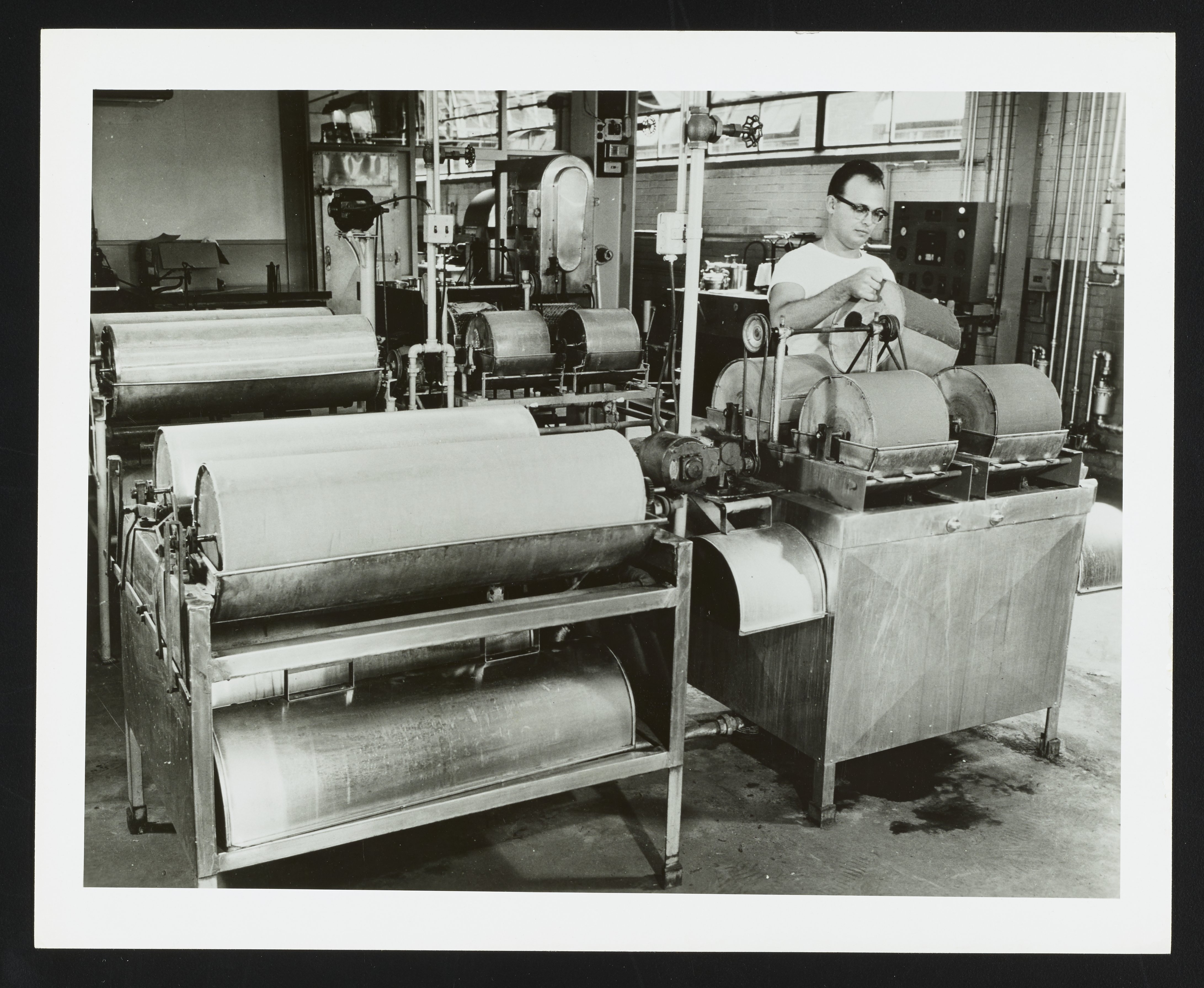 View of Thomas Manzolillo examining a roller used to hold fabric in place for the application of dyestuffs. In this typical dye process, fabric is rolled through a trough of dye and then pressed between two heavy rollers, which forces the dye into the cloth and squeezes out the excess.