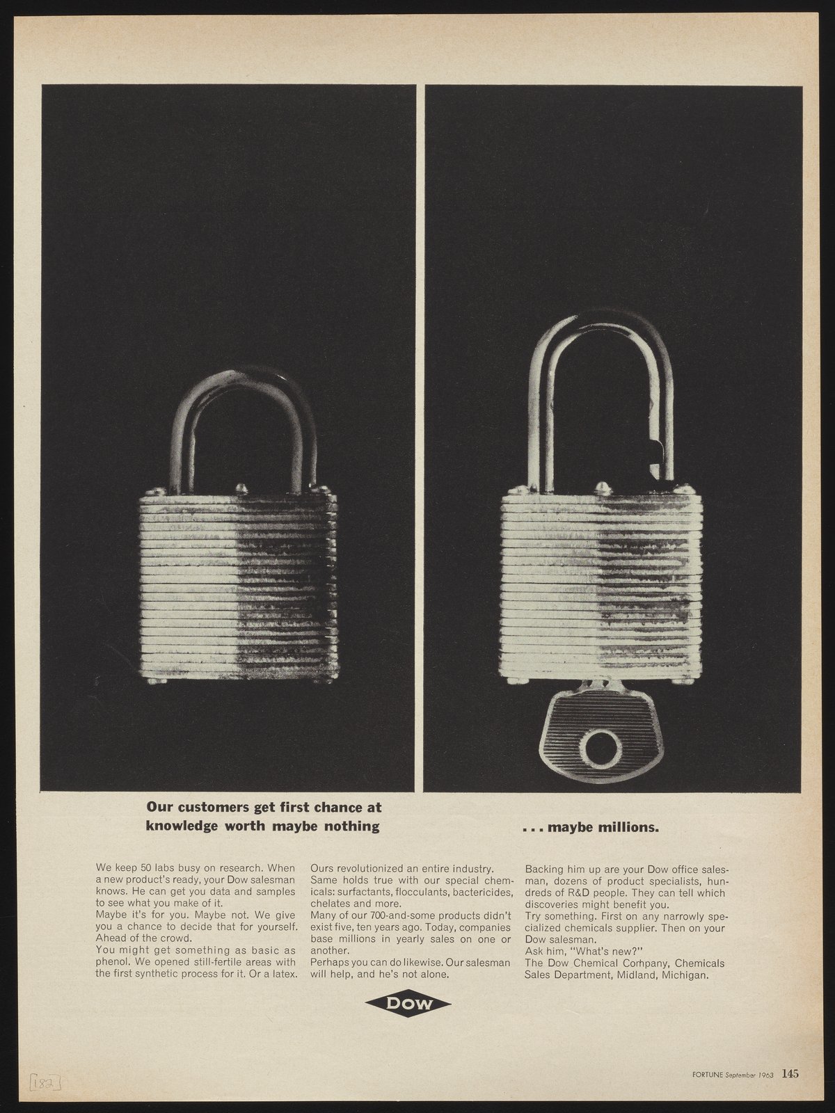 Black and white print advertisement for the Dow Chemical Company's Chemicals Sales Department. This advertisement appeared on page 145 of the September 1963 edition of Fortune magazine.