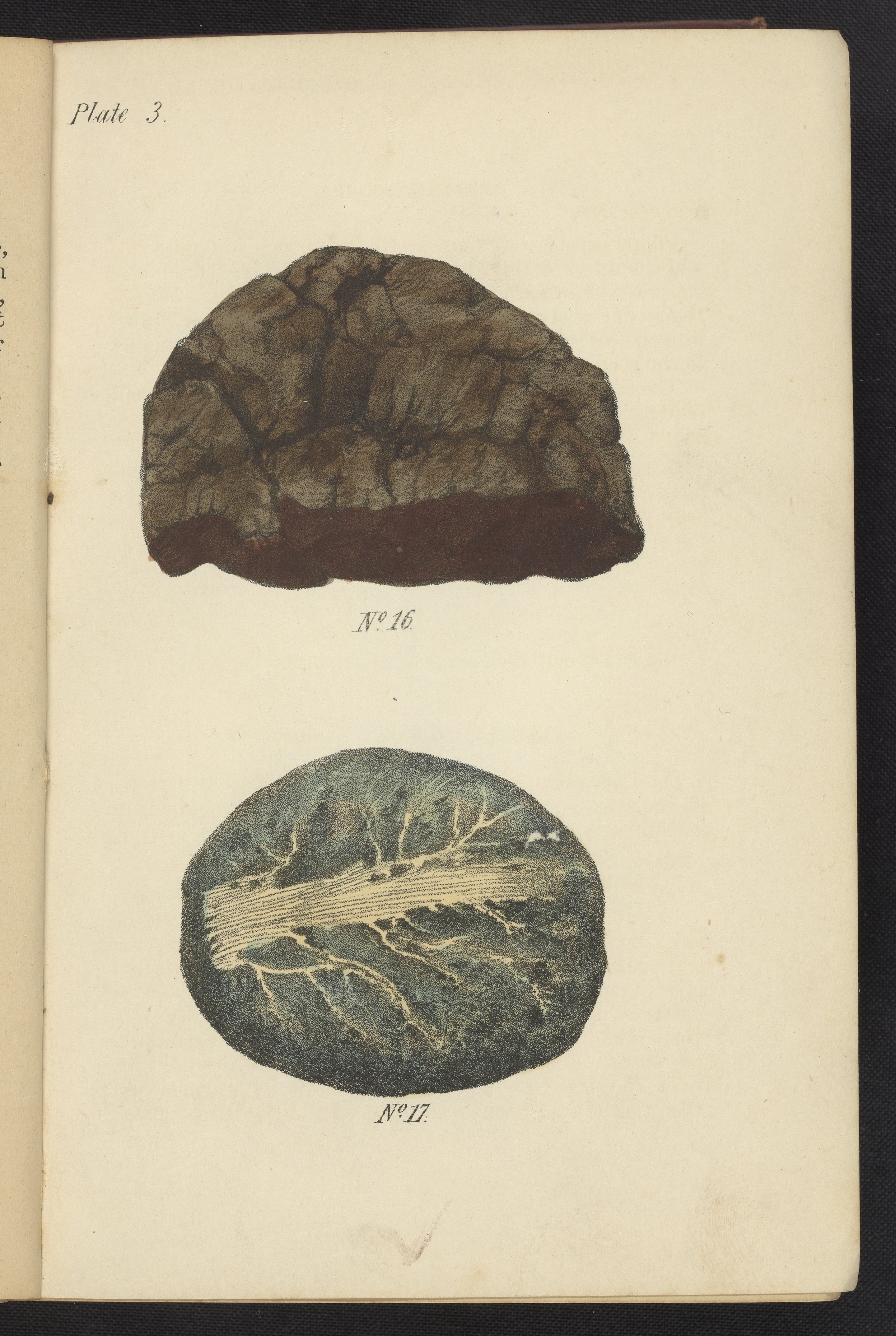Printed illustration in color of two opium masses. Opium is made from the juice from the capsules of Papaver somniferum which is then hardened by evaporation. The top, no. 16, is of a Smyrna Opium which is wrapped in poppy leaves and covered then by capsules of a species of Rumex. The lower, no. 17, is of a Constantinople Opium which is wrapped in a poppy leaf.