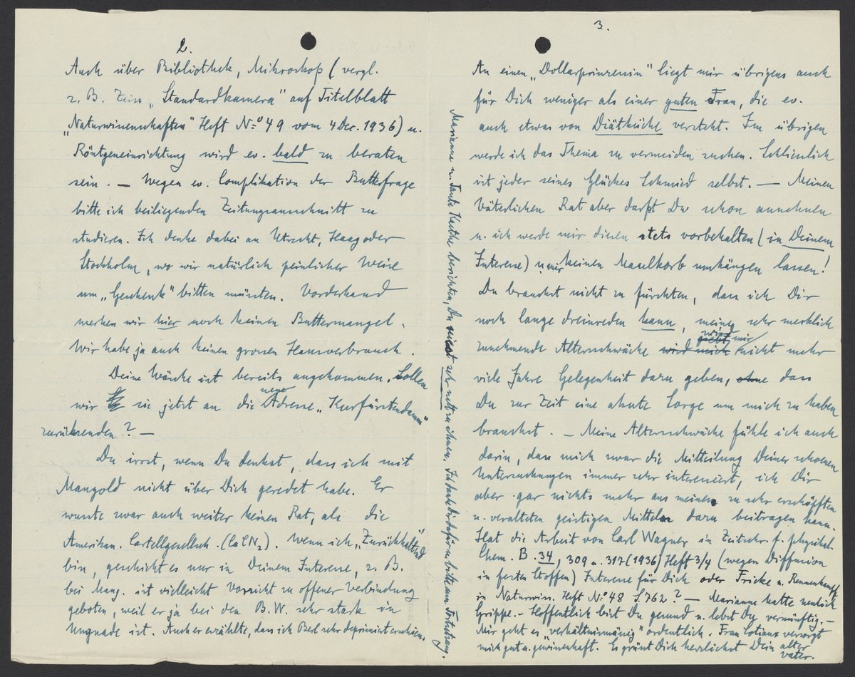 Du brauchst nicht zu fürchten, dass ich Dir noch lange dreinreden kann, meine sehr merklich zunehmende Altersschwäche wird mir nicht mehr Gelegenhait dazu geben, dass Du eine akute Sorge um mich zu haben brauchst. – Meine Altersschwäche fühle ich auch darin, dass mich zwar die Mitteileung Deiner schönen Untersuchungen immer sehr interessiert, ich Dir aber gar nichts mehr aus meiner zu sehr erschönpften u. veralteten geistigen Mittel dazu beitragen kann. Hat die Arbeit von Carl Wagner in Zeitschr. f. physikal. Chem. B. 34, 309 u. 317 (1936) Heft ¾ (wegen Diffusion in festen Stoffen) Interesse für Dich oder Fricke u. Rennenkampf in Naturwiss. Heft No. 48 S. 762? – Marianne hat neulich Grippe. Hoffentlich bist Du gesund u. lebst Du vernünftig. – Mir geht es „verhältnismaessig“ ordentlich. Frau Cotiaux versorgt mich gut u. gewissenhaft. Es grüsst Dich herzlichst Dein alter Vater.