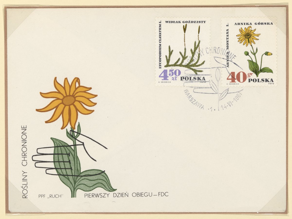 Small JPG1200 x 902px — 130 KBLarge JPG2880 x 2164px — 792 KBFull-sized JPG6691 x 5027px — 4.3 MBOriginal fileTIFF — 6691 x 5027px — 96.2 MBFirst Day Cover (FDC) issued in Poland on June 14, 1961, as part of a series dedicated to Protected Plants (Rośliny Chronione). The bottom left of the envelope features an illustration of a hand sheltering a blooming Arnica plant, symbolizing nature conservation. The upper right corner has two stamps from the Protected Plant Series. The two stamps feature Stag's-horn Clubmoss (Lycopodium clavatum) and Mountain Arnica (Arnica montana).