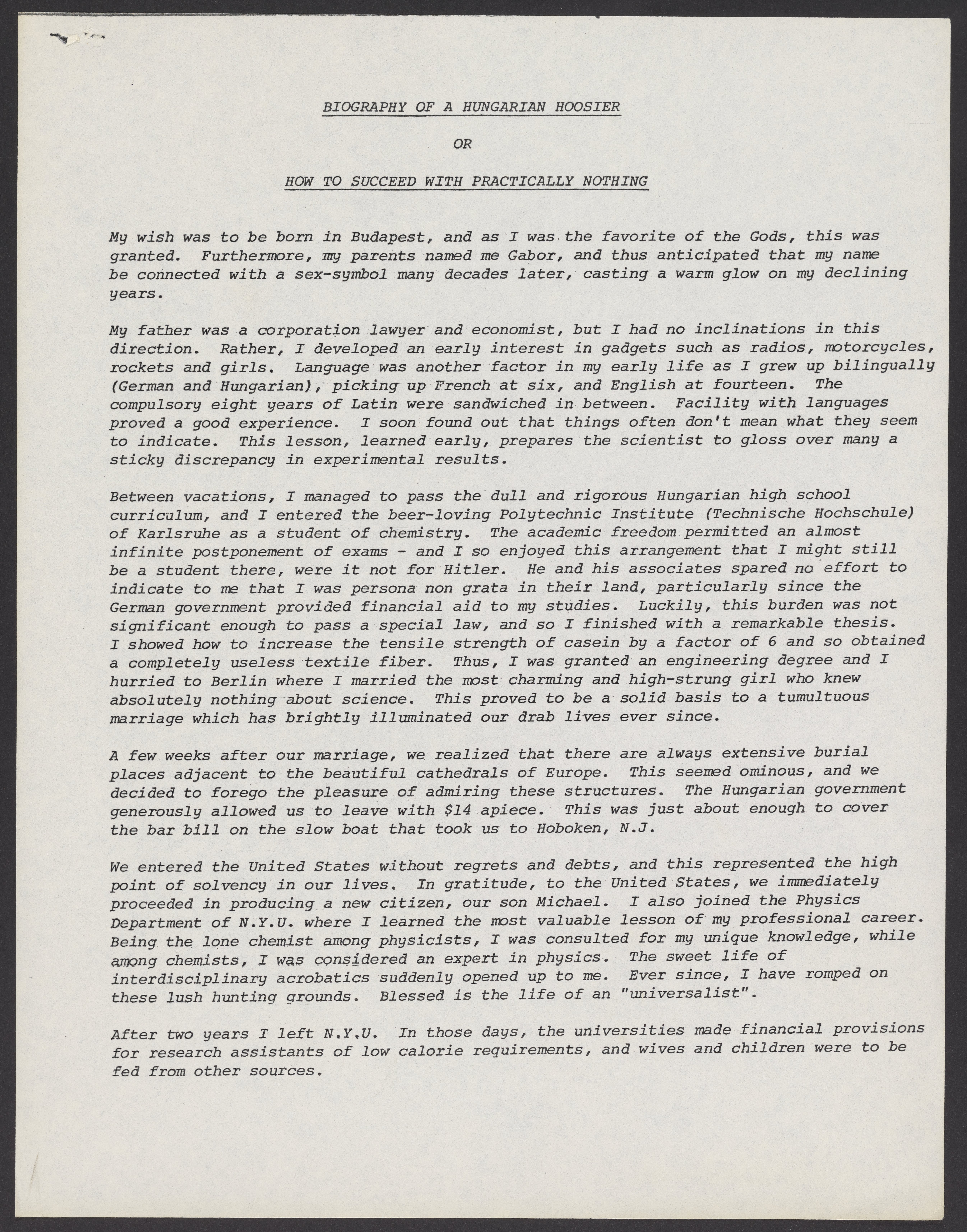 Biography of a Hungarian Hoosier, or, How to Succeed With Practically Nothing