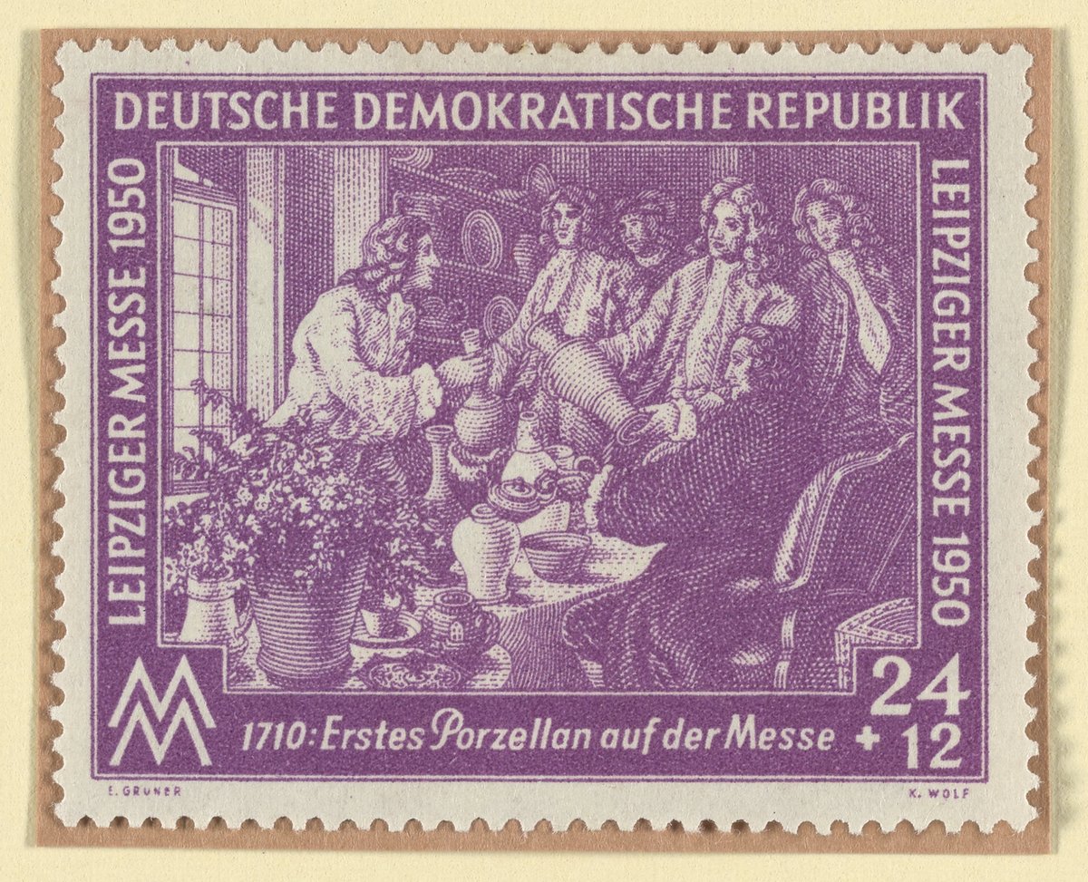 Stamp from the series on the Leipzig Spring Trade Fair in 1950. Commemorates first porcelain on the trade fair in 1710.