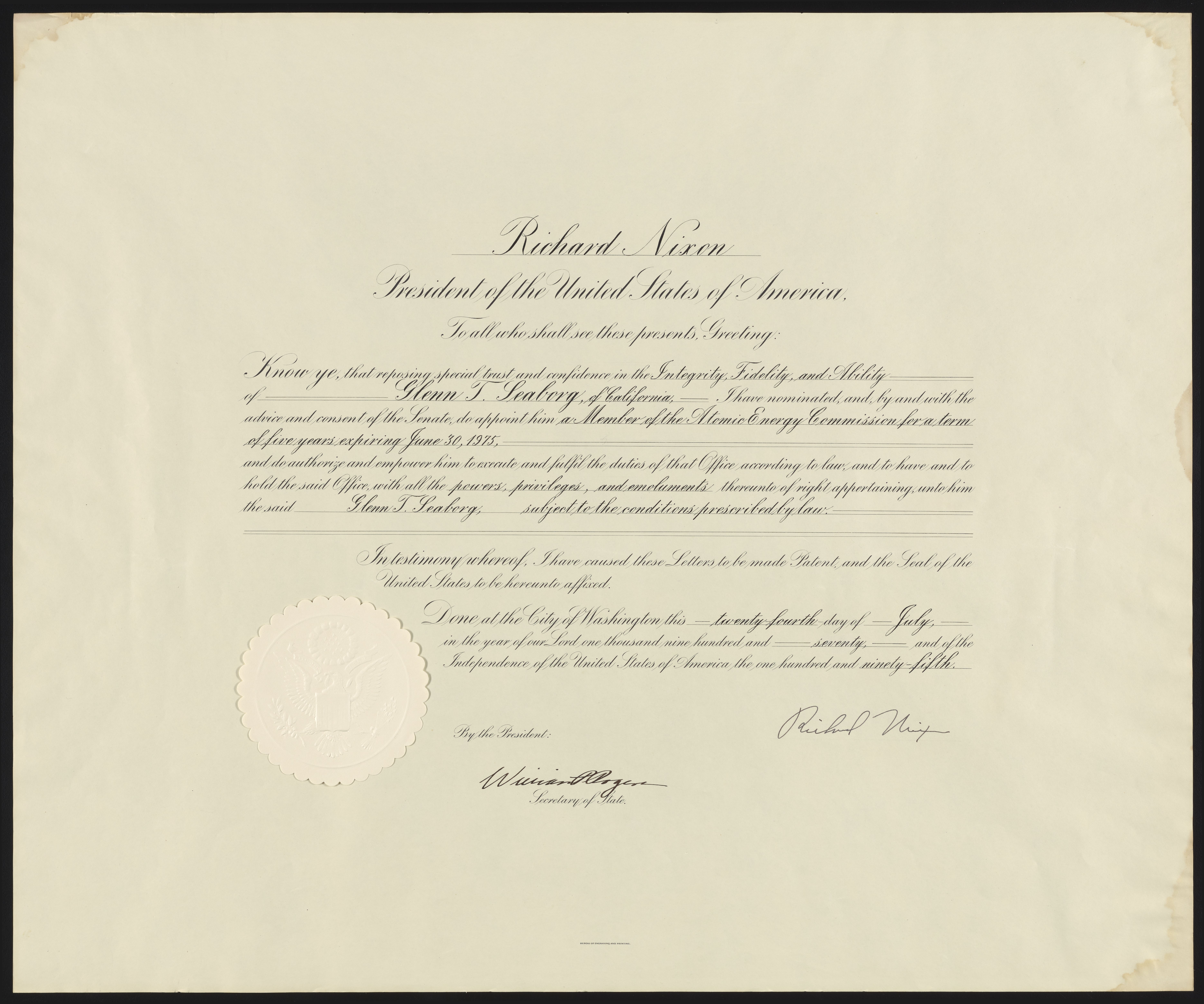 Certificate Appointing Glenn Seaborg as a Member of the Atomic Energy Commission