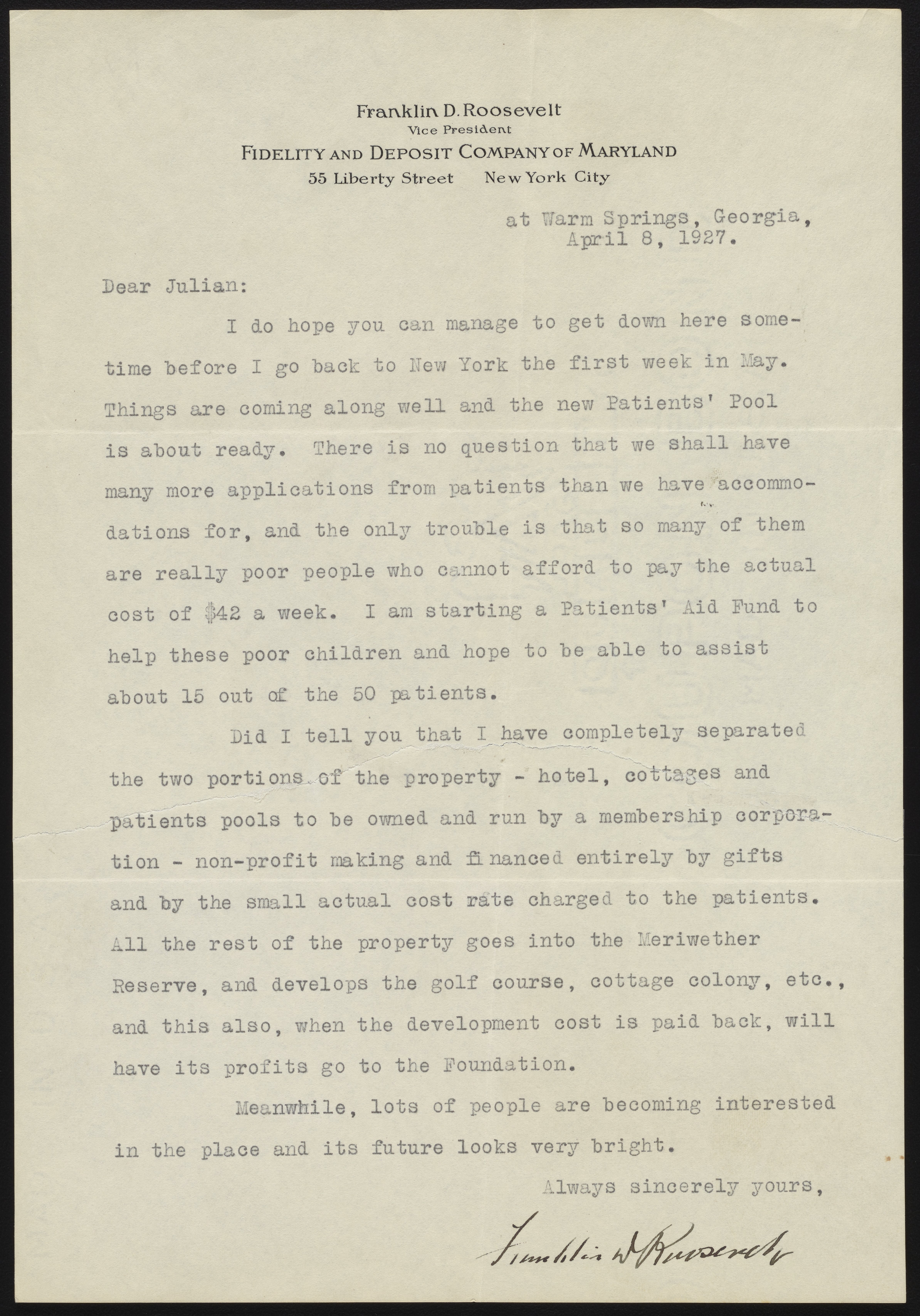 Typewritten letter from Franklin Delano Roosevelt (1882-1945) to Julian [Goldman] detailing his plans for the creation of a polio rehabilitation facility in Warm Springs, Georgia, as well as the creation of a Patients' Aid Fund. Following his first visit to Warm Springs in October 1924, Roosevelt purchased the Meriwether Inn and 1,700 acre farm surrounding the resort in order to develop a hydrotherapy rehabilitation facility for polio patients. The facility subsequently became the Roosevelt Warm Springs Institute for Rehabilitation (RWS) and, following the invention of the polio vaccine, redirected focus to inpatient rehabilitation for amputees and people recovering from spinal cord injuries, brain damage, and stroke.