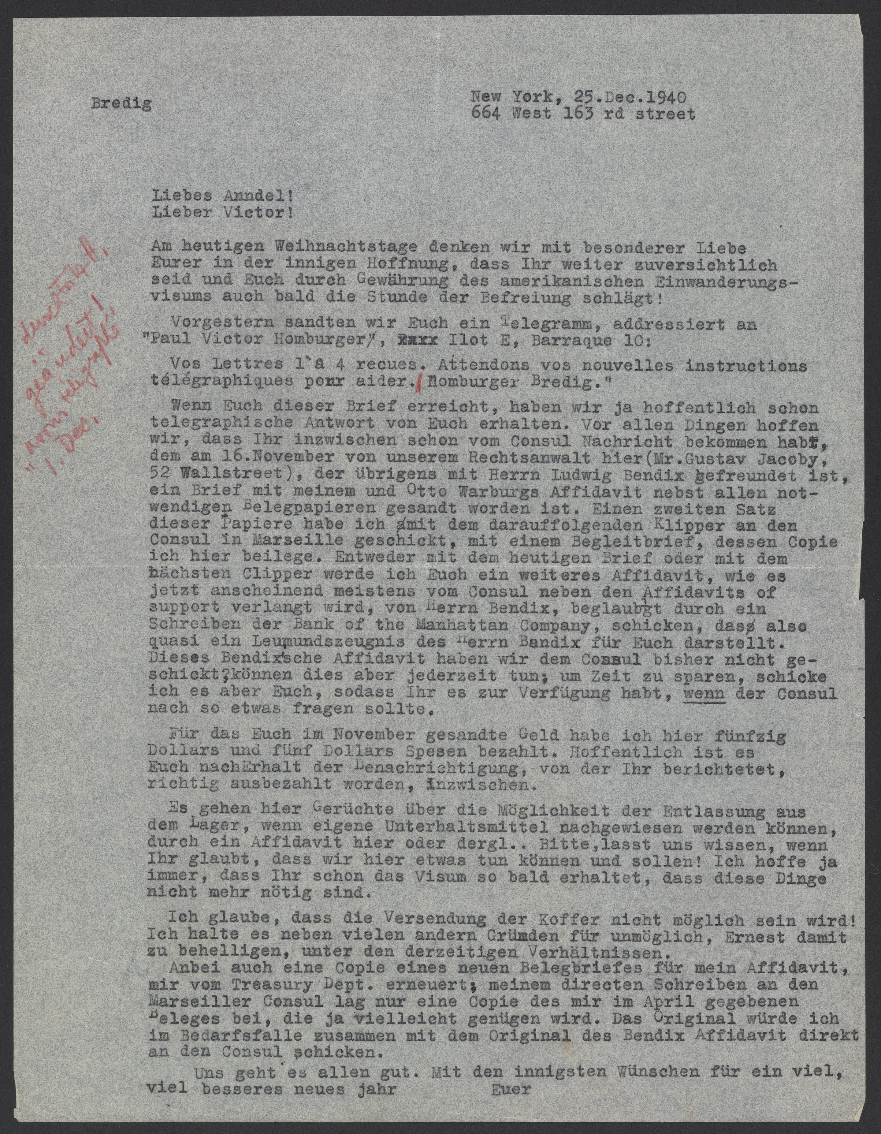 Wenn Euch dieser Brief erreicht, haben wir ja hoffentlich schon telegraphische Antwort von Euch erhalten. Vor allen Dingen hoffen wir, dass Ihr inzwischen schon vom Consul Nachricht bekommen habt, dem am 16 November von unserem Rechtsanwalt hier (Mr. Gustav Jacoby, 52 Wallstreet), der übrigens mit Herrn Ludwig Bendix befreundet ist, ein Brief mit meinem und Otto Warburgs Affidavit nebst allen notwendigen Belegpapieren gesandt worden ist. Einen zweiten Satz dieser Papiere habe ich mit dem darauffolgenden Klipper an dem Consul in Marseille geschickt mit einem Begleitbrief, dessen Copie ich hier beilege. Entweder mit dem heutigen Brief oder mit dem nächsten Clipper werde ich Euch ein weiteres Affidavit, wie es jetzt anscheinend meistens vom Consul neben Affidavits of support verlangt wird, von Herrn Bendix, beglaubigt durch ein Schreiben der Bank of the Manhattan Company, schicken, das also quasi ein Leumundszeugnis des Hernn Bendix für Euch darstellt. Dieses Bendixsche Affidavit haben wir dem Consul bisher nicht geschickt, können dies aber jederzeit tun; um Zeit zu sparen, schicke ich es aber Euch, sodass Ihr es zur Verfügung habt, wenn der Consul nach so etwas fragen sollte.