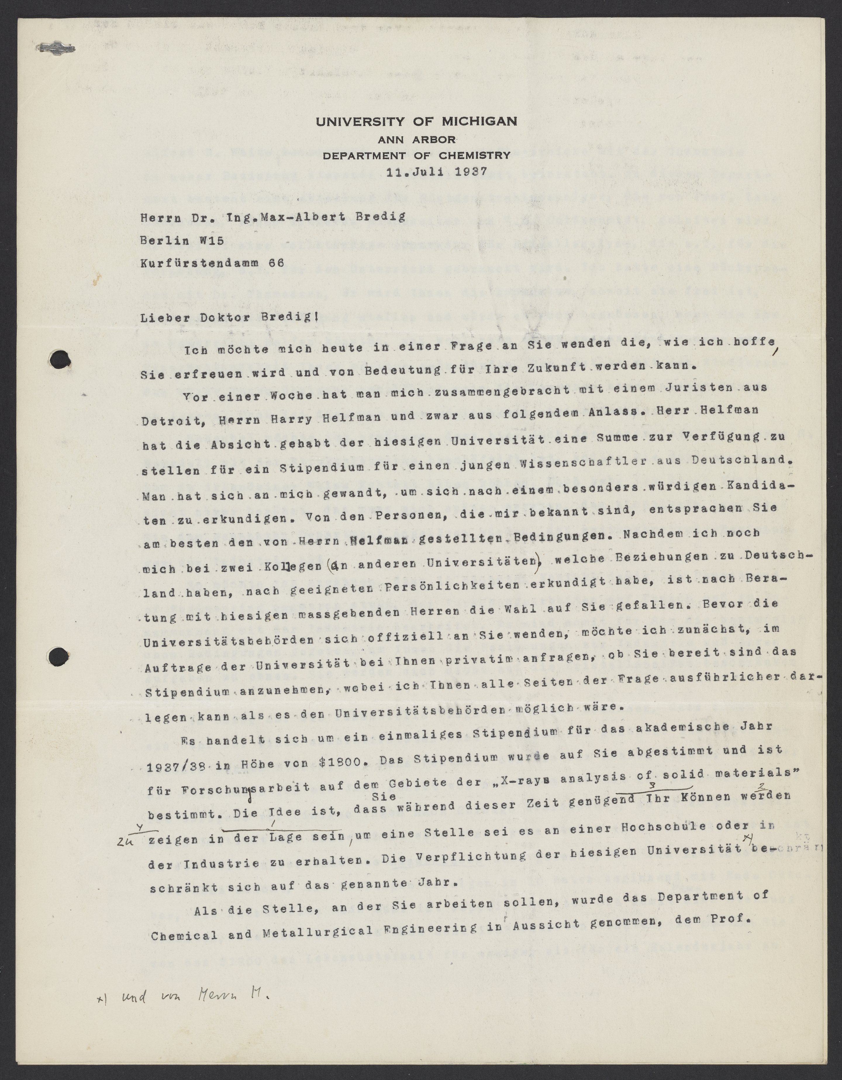 Vor einer Woche hat man mich zusammen gebracht mit einem Juristen aus Detroit, Herrn Henry Helfman, und zwar aus folgendem Anlass. Herr Helfman hat die Absicht gehabt, der hiesigen Universität eine Summe zur Verfugung zu stellen für ein Stipendium für einen jungen Wissenschaftler aus Deutschland. Man hat sich an mich gewandt, um sich nach einem besonders würdigen Kandidaten zu erkundigen. Von den Personen, die mir bekannt sind, entsprechen Sie am besten, die von Herrn Helfmann gestellten Bedingungen. Nachdem ich mich bei zwei Kollegen (an anderen Universitäten), welche Beziehungen zu Deutschland haben, nach geeigneten Persönlichkeiten erkundigt habe, ist nach Beratung mit hiesigen massgebenden Herren die Wahl auf Sie gefallen. Bevor die Universitätsbehörden sich offiziell an Sie wenden, möchte ich zunächst, im Auftrage der Universität bei Ihnen privatim anfragen, ob Sie bereit sind das Stipendium anzunehmen, wobei ich Ihnen alle Seiten der Frage ausführlicher darlegen kann als es den Universitätsbehören möglich wäre.