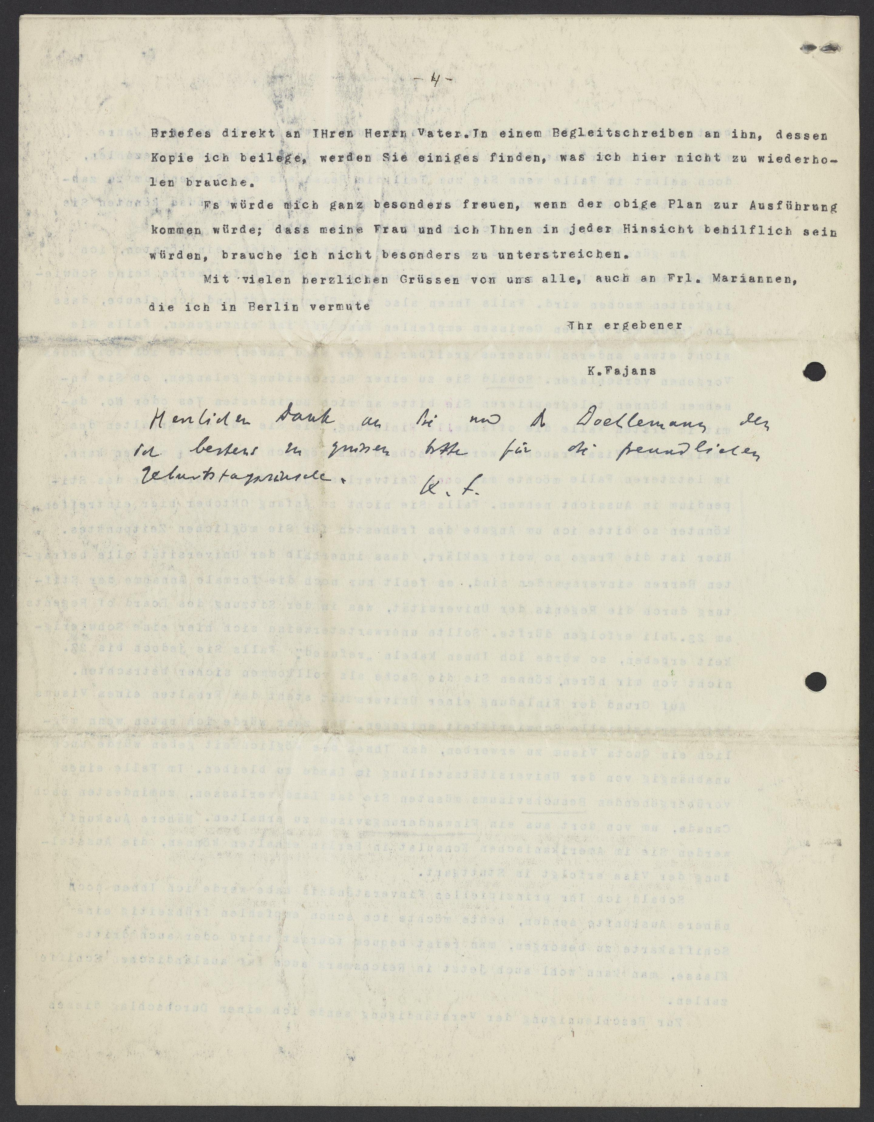 Small JPG1200 x 1539px — 271 KBLarge JPG2880 x 3693px — 1.3 MBFull-sized JPG5423 x 6953px — 4.4 MBOriginal fileTIFF — 5423 x 6953px — 108 MBKasimir Fajans, a professor of chemistry at the University of Michigan in Ann Arbor who fled Europe with the rise of the Third Reich, offers his former mentee, Max Bredig (1902-1977), a fellowship to conduct research at the University of Michigan in X-ray analysis for the 1937/1938 academic year. The experience is intended to assist Max Bredig with emigration from Germany and to establish himself professionally in the United States.