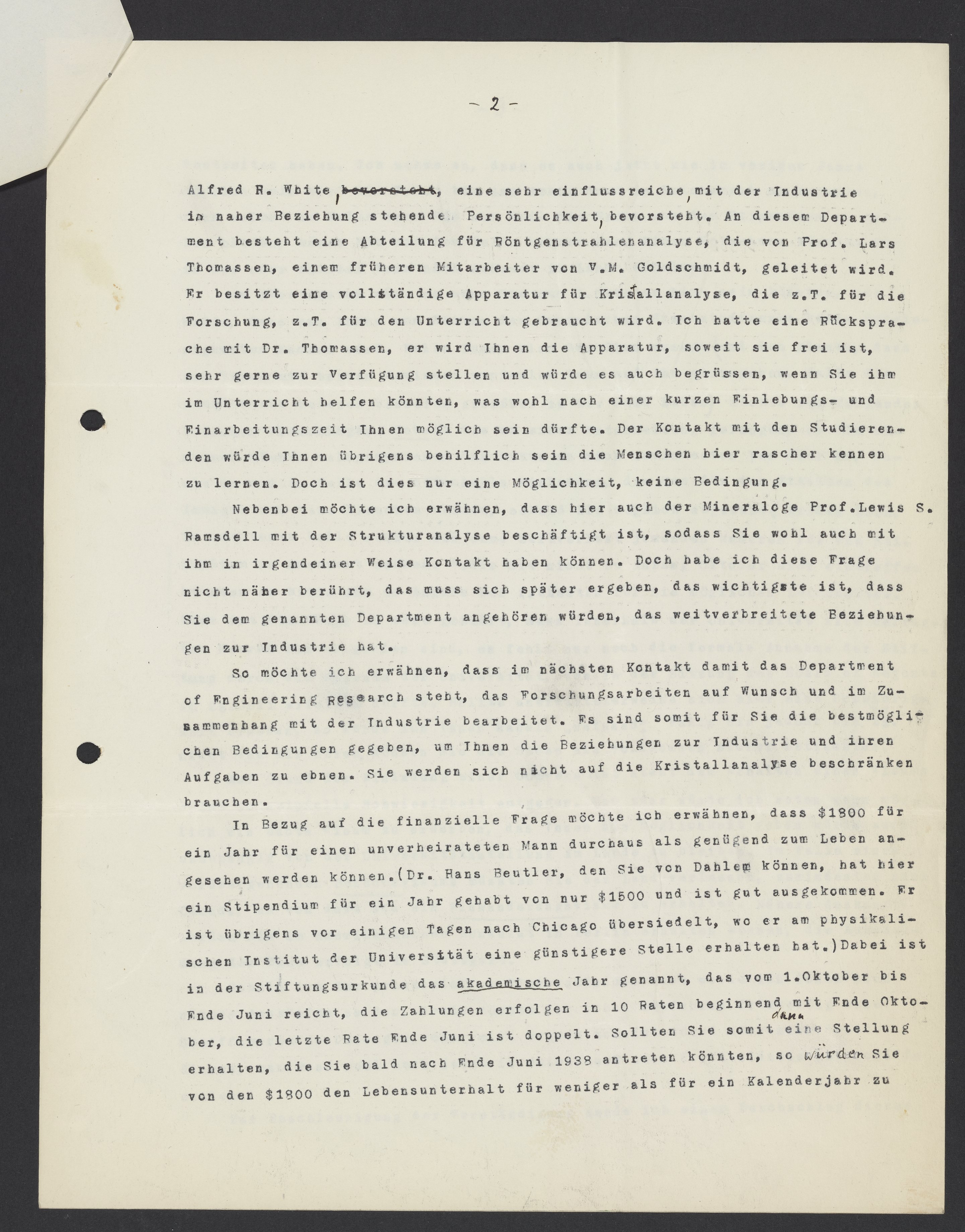 Alfred B. White, eine sehr einflussreiche, mit der Industrie in naher Beziehung stehender Persönlichkeit, bevorsteht. An diesem Department besteht eine Abteilung für Röntgenstrahlenanalyse, die von Professor Lars Thomassen, einem früheren Mitarbeiter von V.M. Goldschmidt. geleitet wird. Er besitzt eine vollständige Apparatur für Kristallanalyse, die z.T. für die Forschung. z.T. für den Unterricht gebraucht wird. Ich hatte eine Rücksprache mit Dr. Thomassen. Er wird ihnen die Apparatur, soweit sie frei ist, sehr gerne zur Verfügung stellen und würde als auch begrüssen, wenn sie ihm im Unterricht helfen könnten, was wohl nach einer kurzen Einlebungs- und Einarbeitungszeit möglich sein dürfte. Der Kontakt mit den Studierenden würde Ihnen übrigens behilflich sein die Menschen hier rascher kennen zu lernen. Doch ist dies nur eine Möglichkeit, keine Bedingung.
