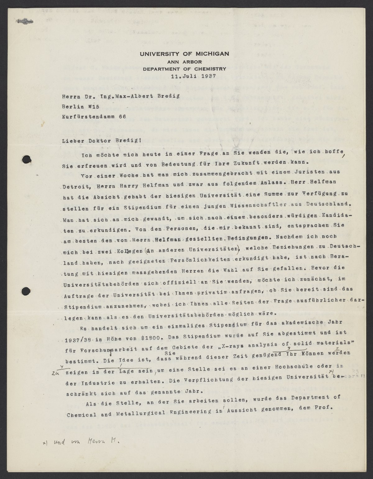 Vor einer Woche hat man mich zusammen gebracht mit einem Juristen aus Detroit, Herrn Henry Helfman, und zwar aus folgendem Anlass. Herr Helfman hat die Absicht gehabt, der hiesigen Universität eine Summe zur Verfugung zu stellen für ein Stipendium für einen jungen Wissenschaftler aus Deutschland. Man hat sich an mich gewandt, um sich nach einem besonders würdigen Kandidaten zu erkundigen. Von den Personen, die mir bekannt sind, entsprechen Sie am besten, die von Herrn Helfmann gestellten Bedingungen. Nachdem ich mich bei zwei Kollegen (an anderen Universitäten), welche Beziehungen zu Deutschland haben, nach geeigneten Persönlichkeiten erkundigt habe, ist nach Beratung mit hiesigen massgebenden Herren die Wahl auf Sie gefallen. Bevor die Universitätsbehörden sich offiziell an Sie wenden, möchte ich zunächst, im Auftrage der Universität bei Ihnen privatim anfragen, ob Sie bereit sind das Stipendium anzunehmen, wobei ich Ihnen alle Seiten der Frage ausführlicher darlegen kann als es den Universitätsbehören möglich wäre.