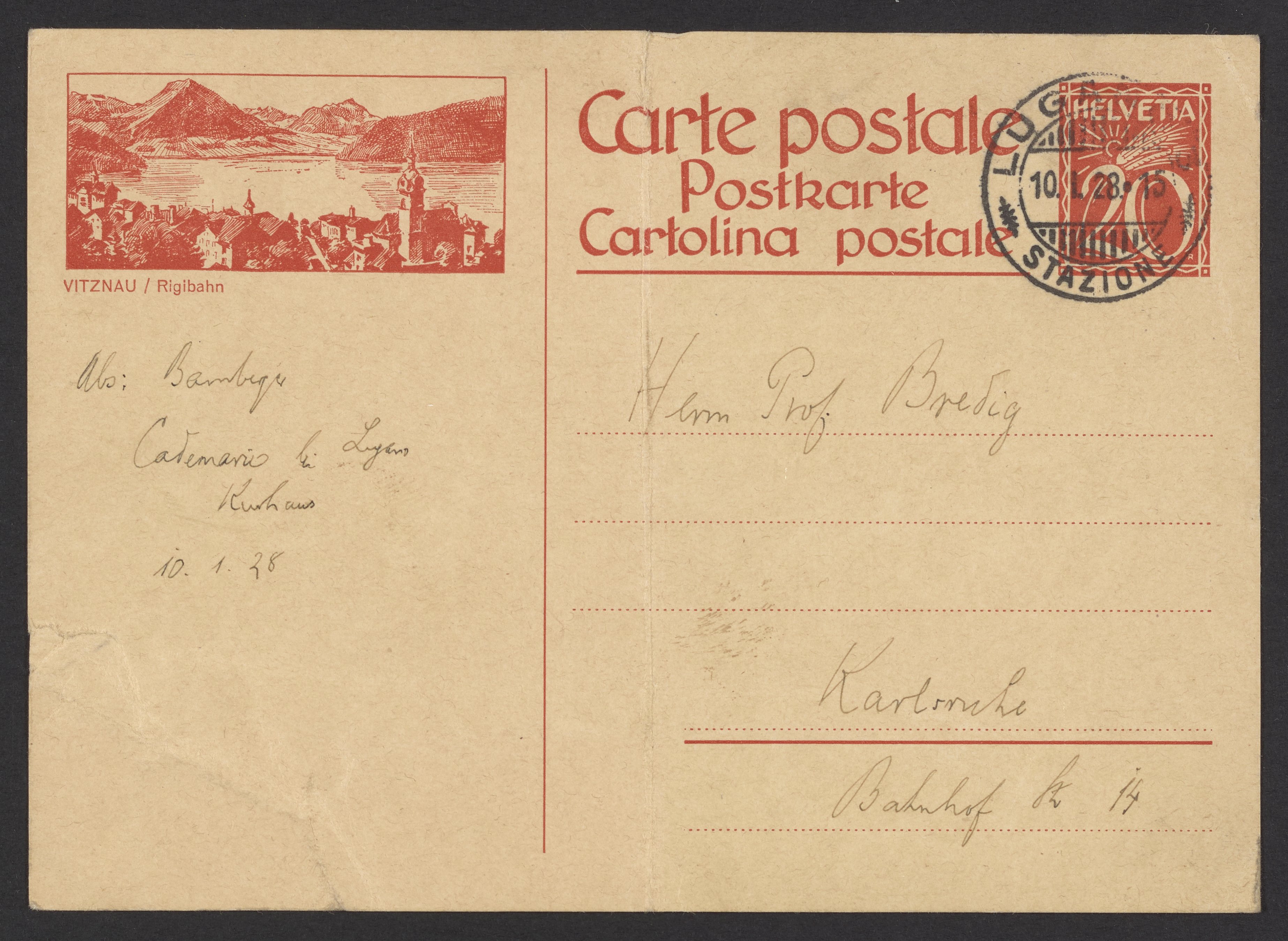 Bamberger, Eugen. “Postcard from Eugen Bamberger to Georg Bredig,” January 10, 1928. Papers of Georg and Max Bredig, Box 2, Folder 6. Science History Institute. Philadelphia. https://digital.sciencehistory.org/works/14kq3yy.