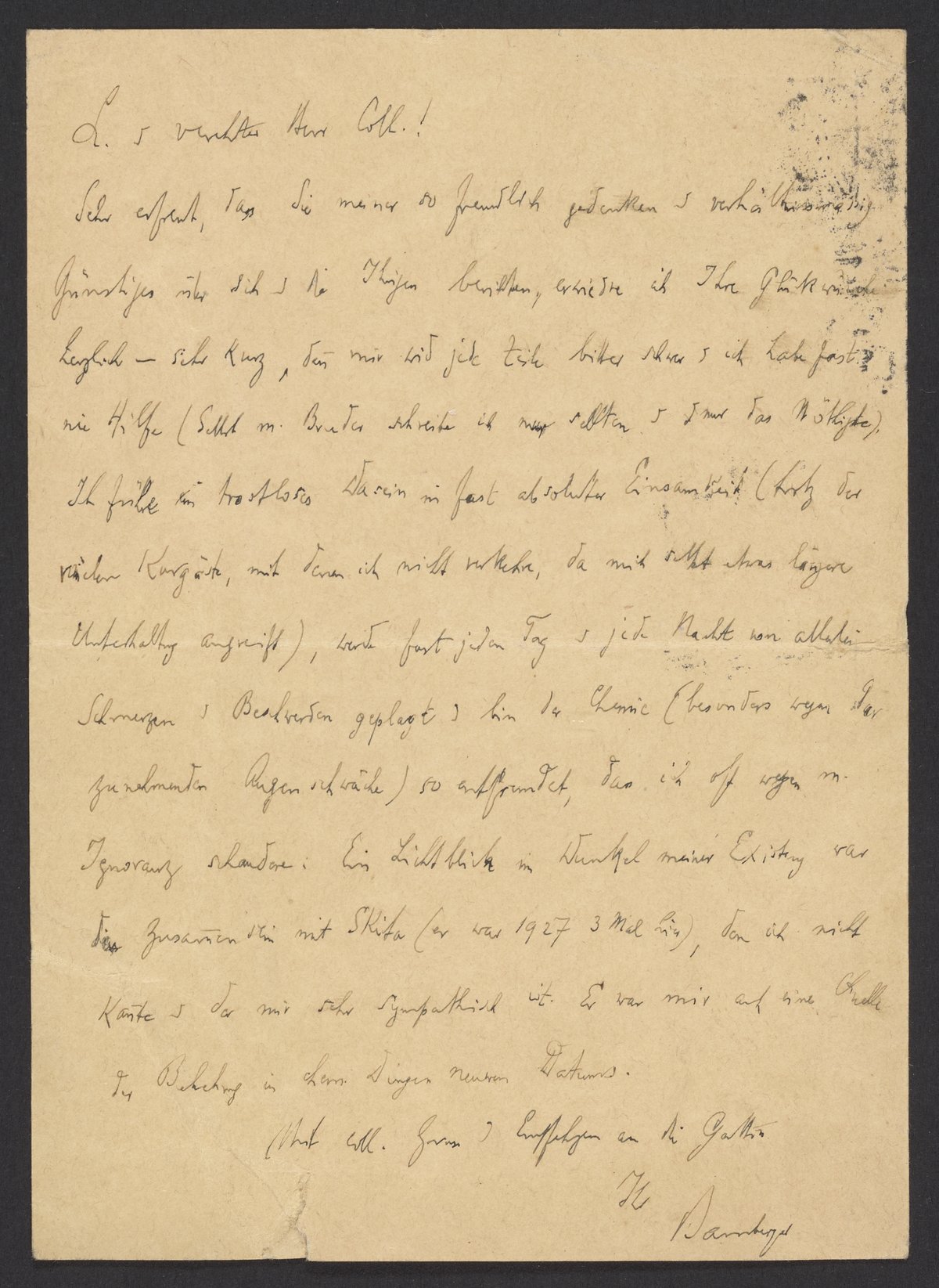 Sehr erfreut, dass Sie meiner so freundlich gedenken & verhältnismäßig Günstiges über sich & die Ihrigen berichten, erwiedre ich Ihre Glückwünsche herzlich – sehr kurz, den[n] mir wird jede Zeile bitter schwer & ich habe fast nie Hilfe (selbst m. Bruder schreibe ich nur selten & nur das Nöt[h]igste). Ich führe ein trostloses Dasein in fast absoluter Einsamkeit (trotz der reichen Kurgäste, mit denen ich nicht verkehre, da mich selbst etwas längere Unterhaltung angreift), werde fast jeden Tag & jede Nacht von allerlei Schmerzen & Beschwerden geplagt, bin der Chemie (besonders wegen der zunehmenden Augenschwäche) so entfremdet, dass ich oft wegen m. Ignoranz schaudere. Ein Lichtblick im Dunkel meiner Existenz war das Zusam[m]ensein mit Skita (er war 1927 3 Mal hier), den ich nicht kan[n]te & der mir sehr symphathisch ist. Er war mir auch eine Quelle der Belehrung in den Dingen neueren Datums.