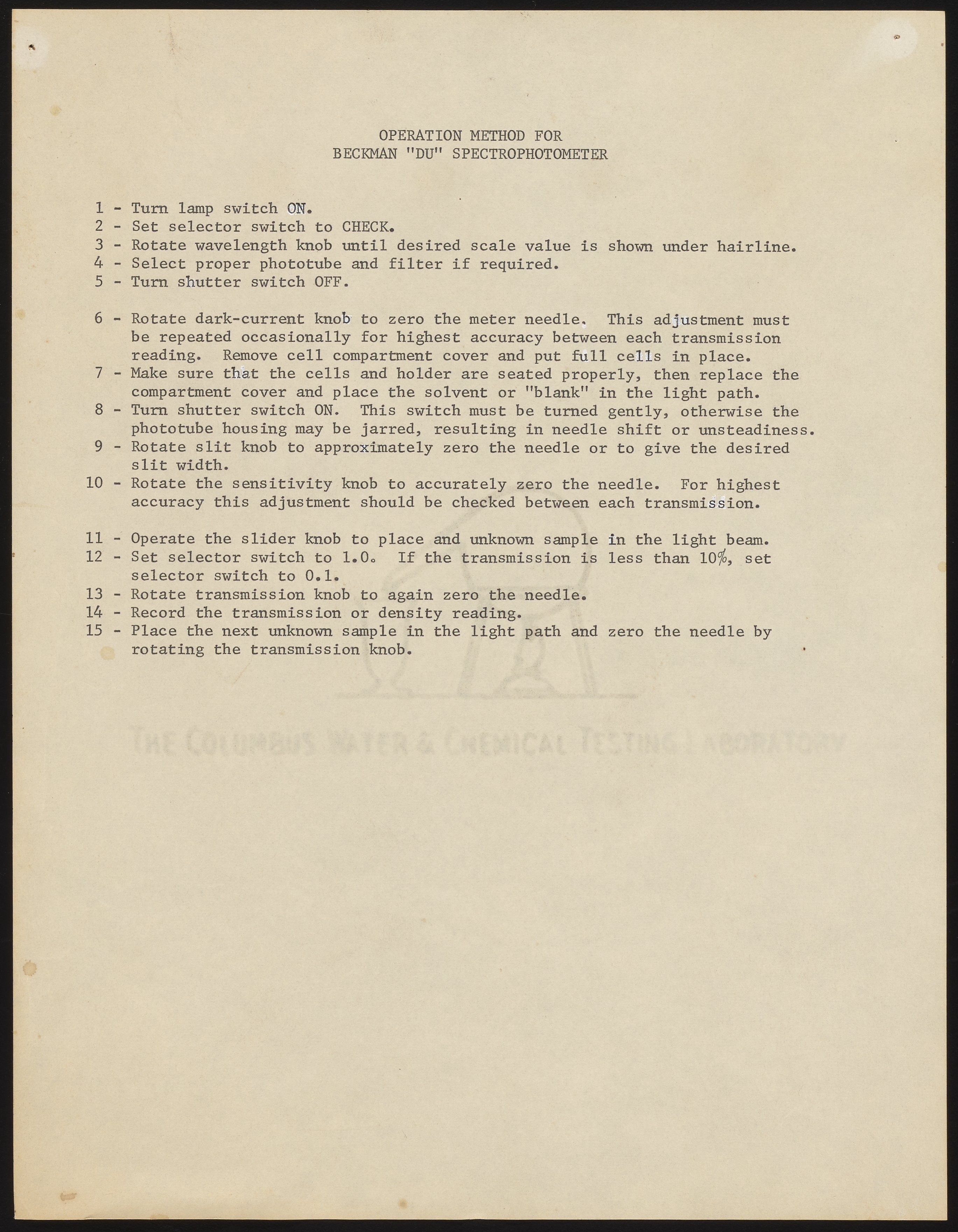 Operation method for Beckman "DU" Spectrophotometer