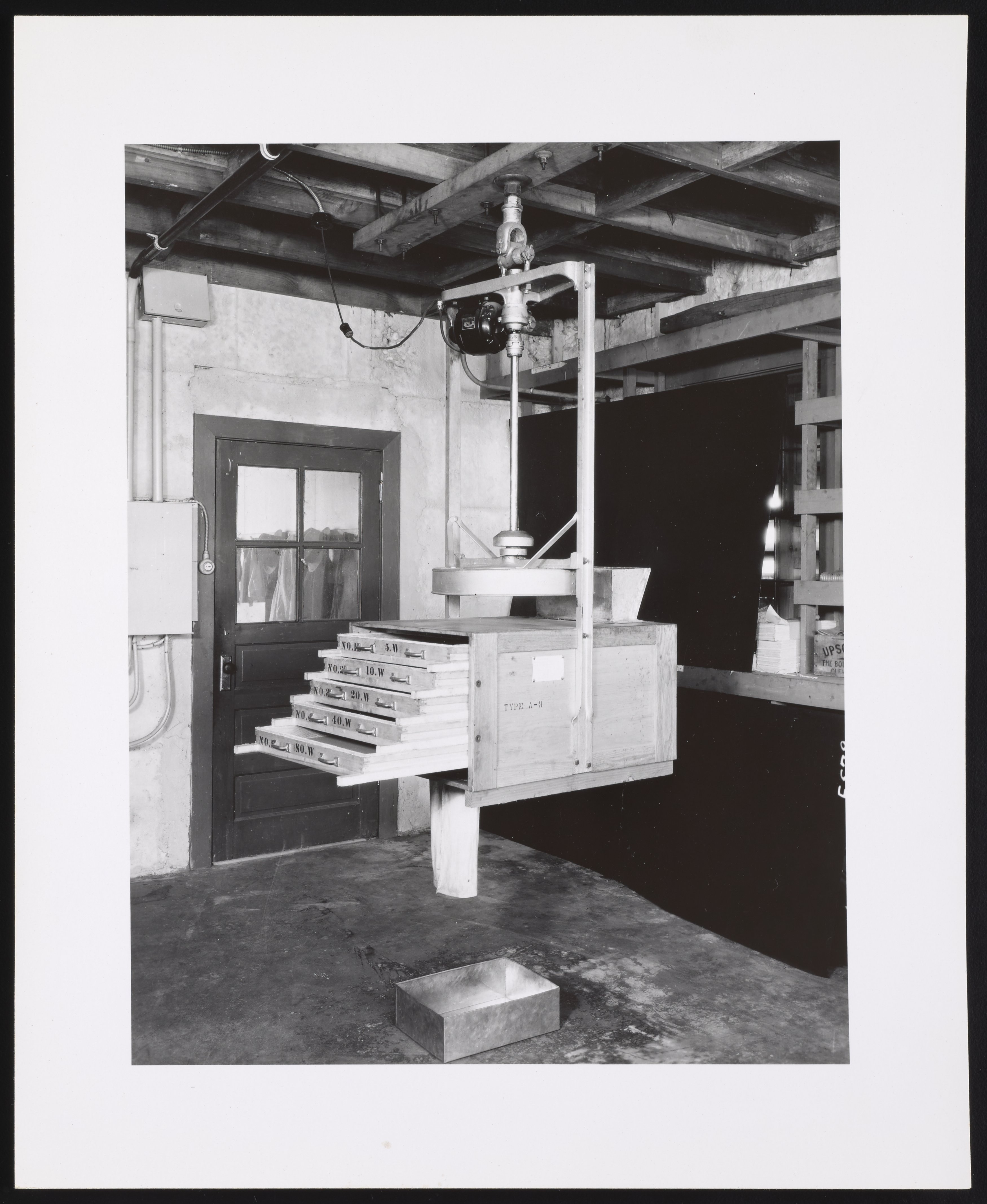 General view of fertilizer trays on a suspension apparatus at an unidentified U.S. Department of Agriculture facility.