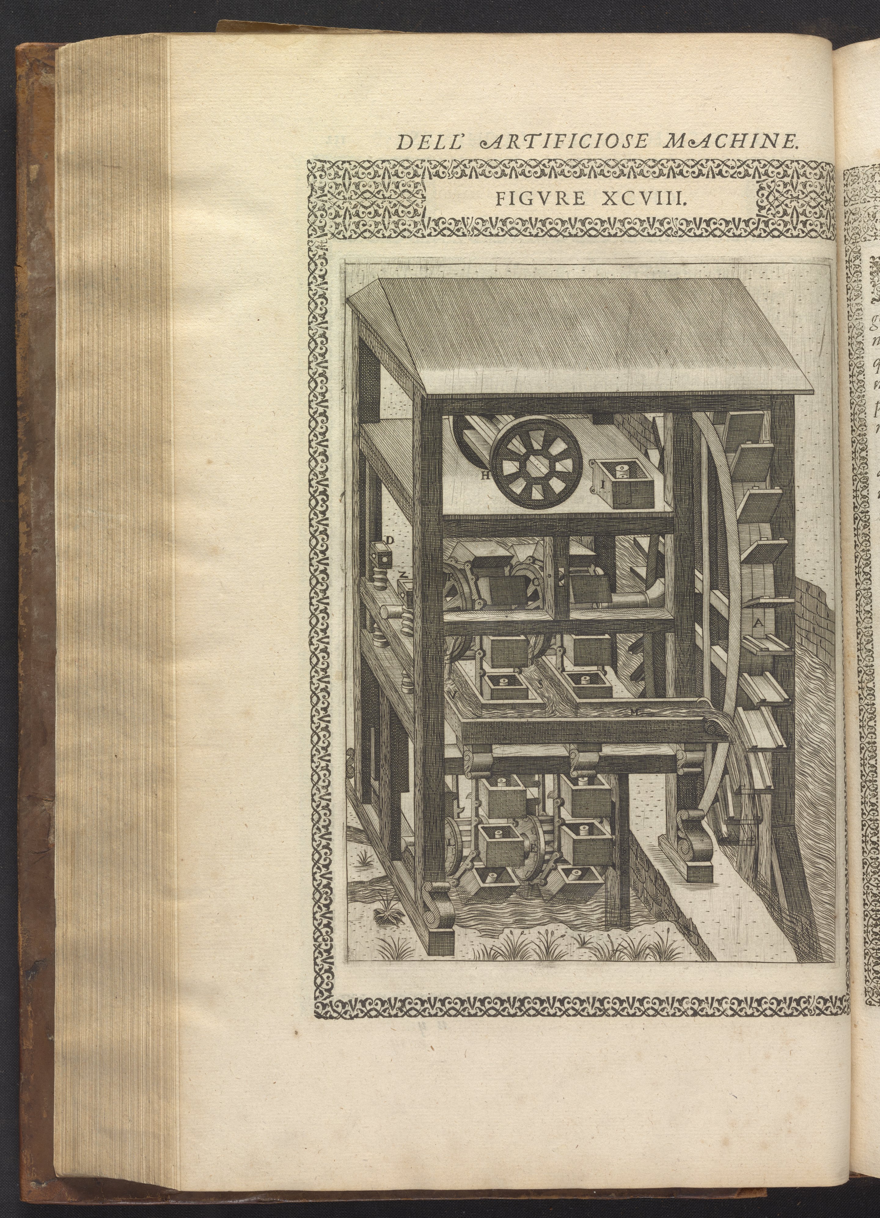 Ramelli, Agostino. “Plate 98: Device for Draining Water from a Swamp or Foundation by River Current.” In Le Diverse Et Artificiose Machine Del Capitano Agostino Ramelli. Paris, France, 1588. https://digital.sciencehistory.org/works/1544bp24s.