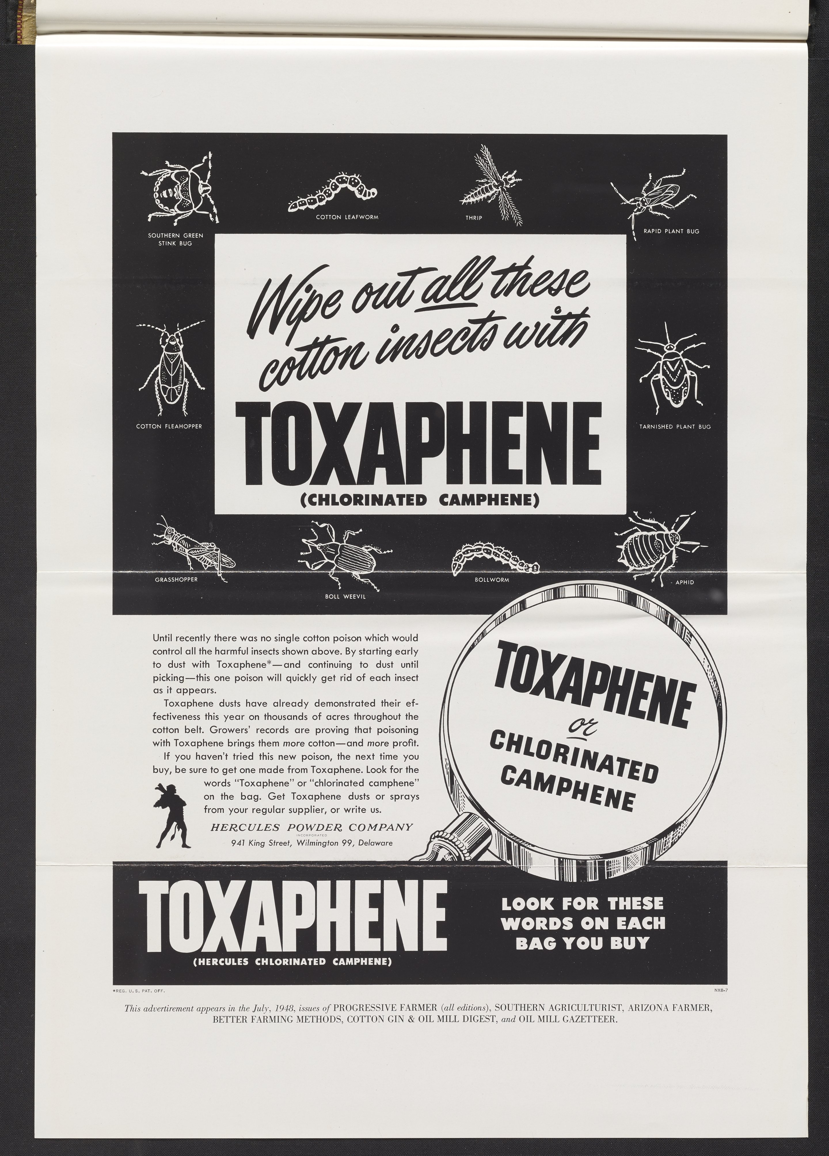 Hercules Incorporated. “Wipe Out All These Cotton Insects with Toxaphene (Chlorinated Camphene).” 1948 Hercules Advertisements, 1948. Records of Hercules Incorporated, Volume 1948. Science History Institute. Philadelphia. https://digital.sciencehistory.org/works/1544bp77t.
