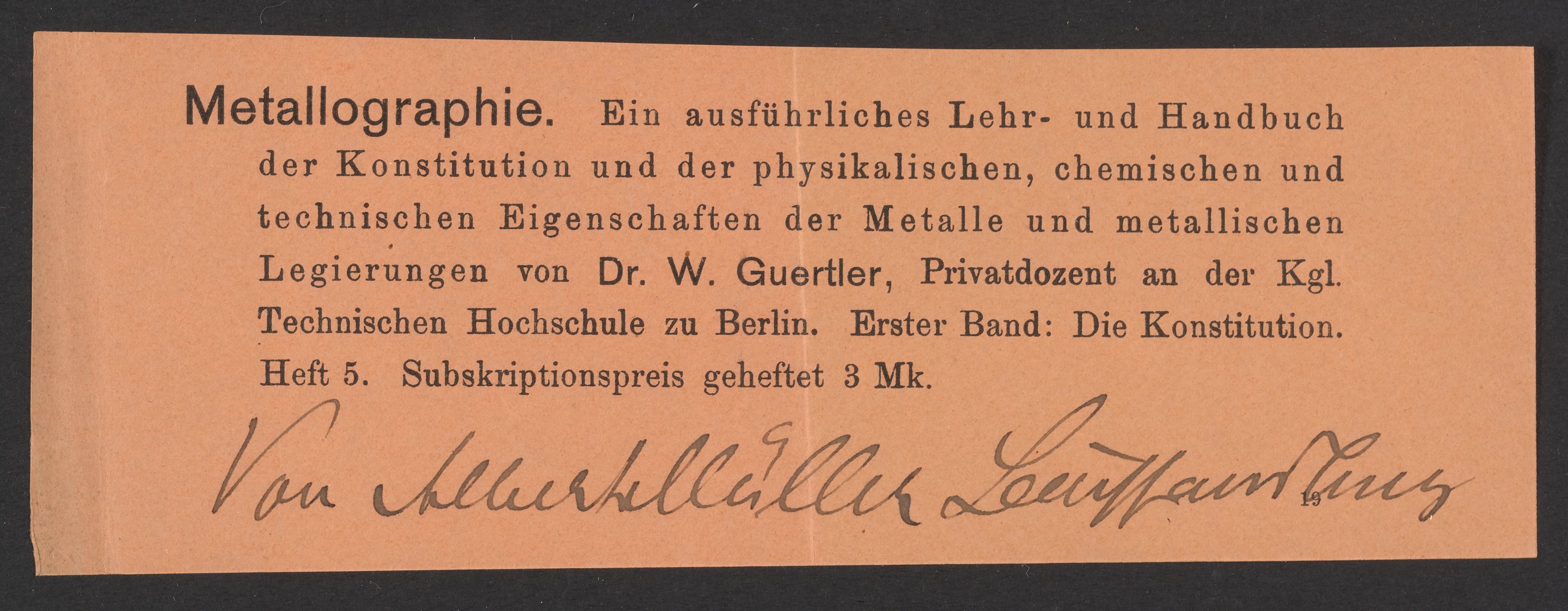 Guertler, W. “Metallography Textbook Advertisement: ‘Metallographie. Ein Ausführliches Lehr- Und Handbuch Der Konstitution Und Der Physikalischen, Chemischen Und Technischen Eigenschaften Der Metalle Und Metallischen Legierungen,’” 1910. Papers of Georg and Max Bredig, Box 3, Folder 5. Science History Institute. Philadelphia. https://digital.sciencehistory.org/works/15b3ehm.