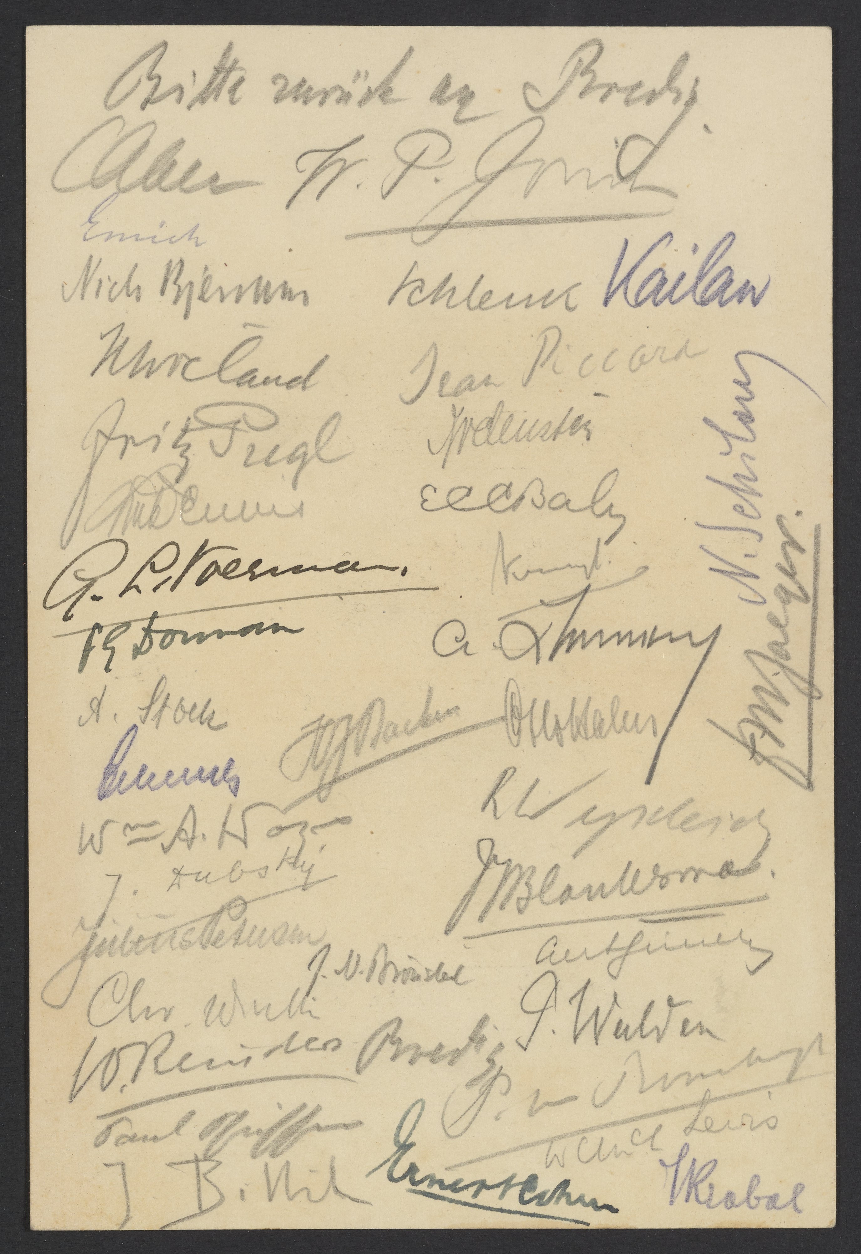 Small JPG1200 x 1752px — 279 KBFull-sized JPG2740 x 4000px — 1.3 MBOriginal fileTIFF — 2740 x 4000px — 31.4 MBAutographed dinner menu from the International Chemical Reunion Utrecht (ICRU) in 1922. It was organized by Ernst Cohen (1863-1944) as a way to unite scientists from previously warring nations.