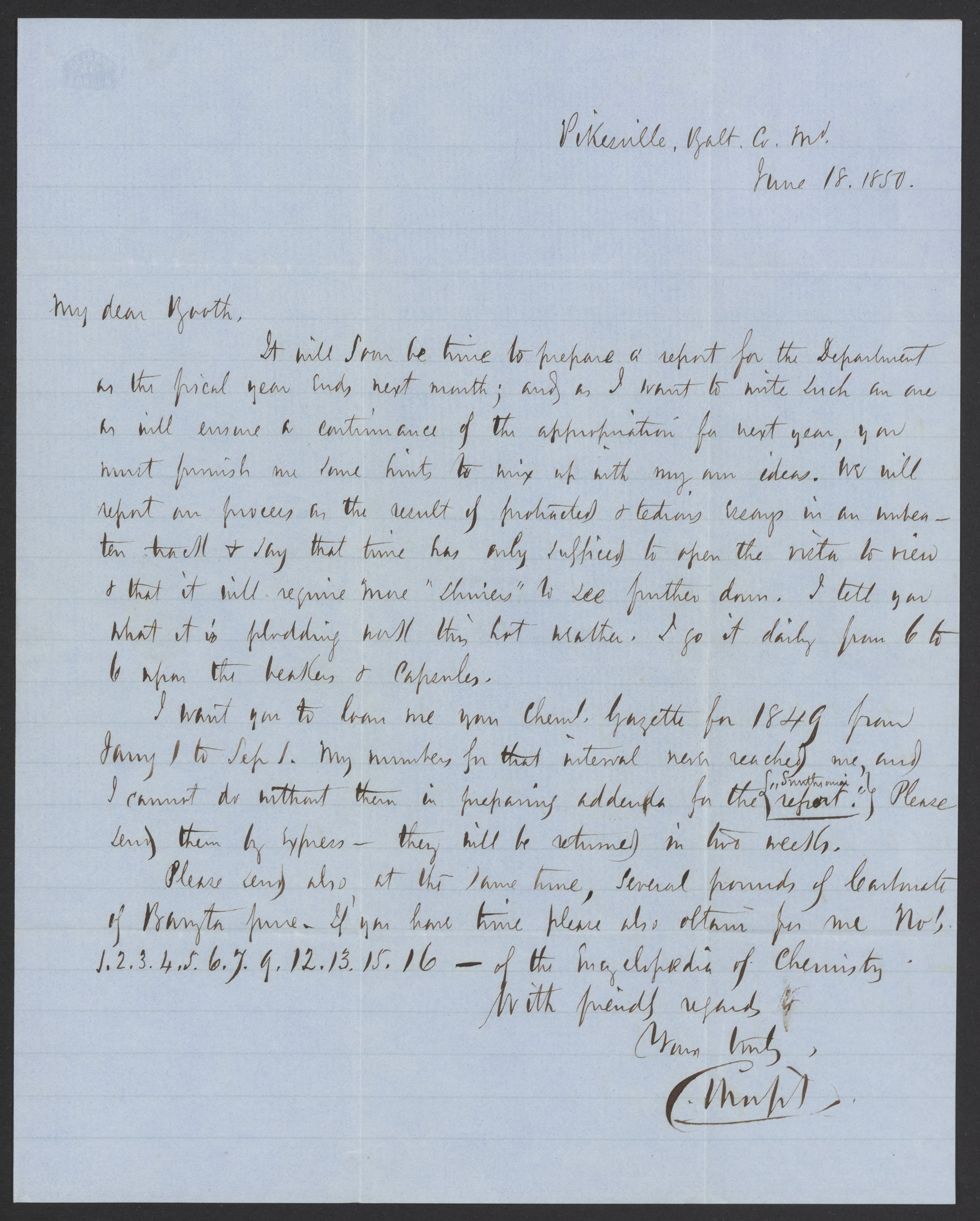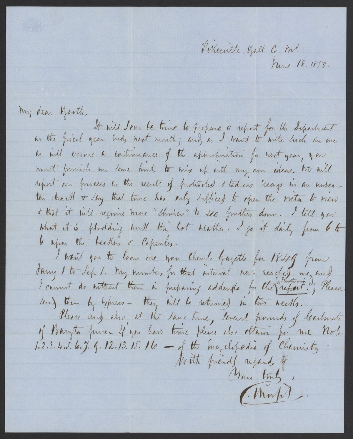 Morfit, Campbell. “Letter from Campbell Morfit to James Curtis Booth, June 18, 1850,” June 18, 1850. Papers of James Curtis Booth, Box 1, Folder 10. Science History Institute. Philadelphia. https://digital.sciencehistory.org/works/17urtnr.