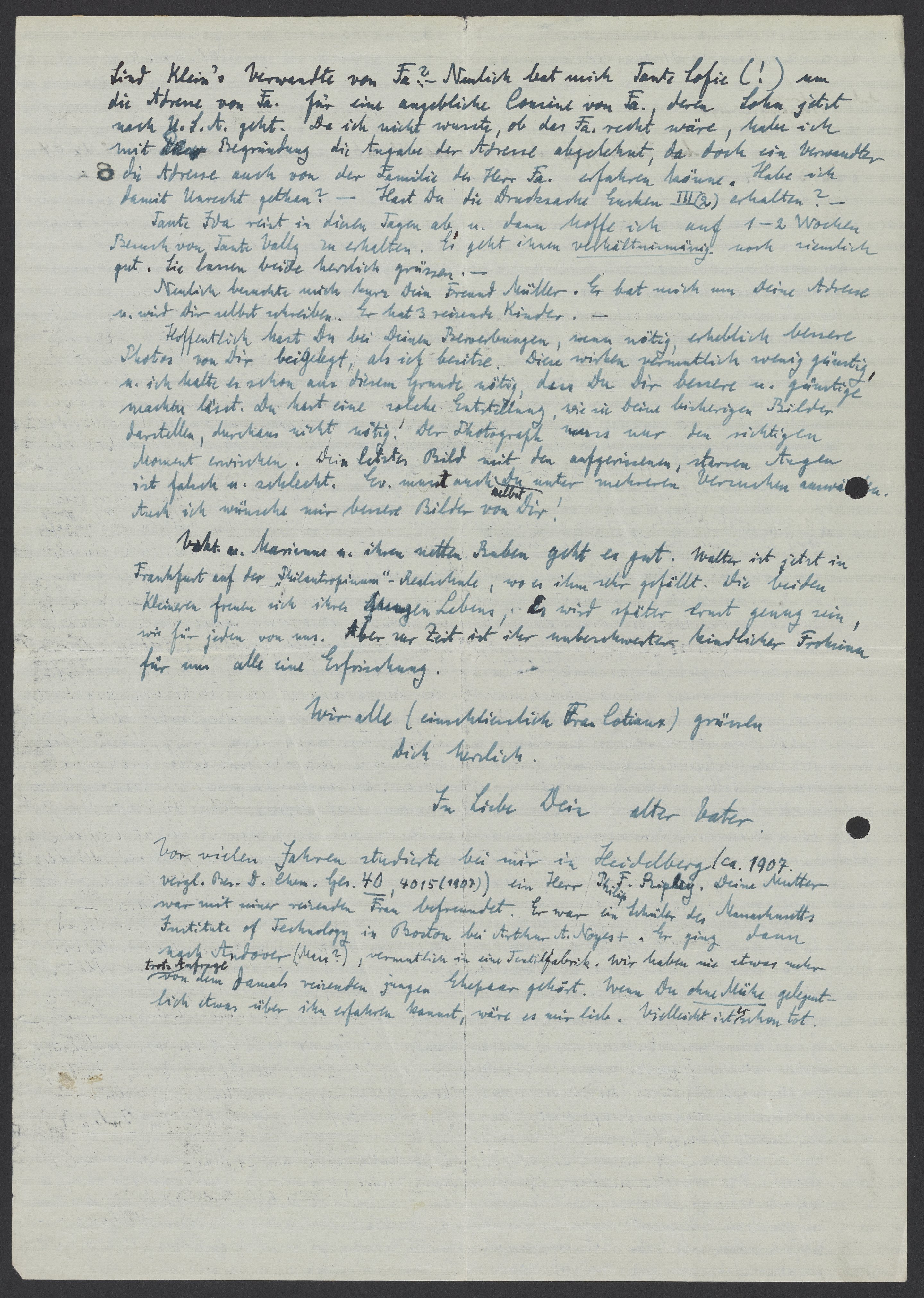 Vor vielen Jahren studierte bei mir in Heidelberg (ca. 1907 vergl. Ber. D. Chem. Ges. 40, 4015 (1907) in Herr Philip F. Ripley. Deine Mutter war mit seiner reizenden Frau befreundet. Er war ein Schüler des Massachusetts Institute of Technology in Boston bei Arthur A. Noyest. Er ging dann nach Andover (Mass?), vermutlich in eine Textilfabrik. Wir haben nie etwas mehr trotz Anfrage von dem damals reizenden jungen Ehepaar gehört. Wenn Du ohne Mühe gelegentlich etwas über ihn erfahren kannst, wäre es mir lieb. Vielleicht ist er schon tot.